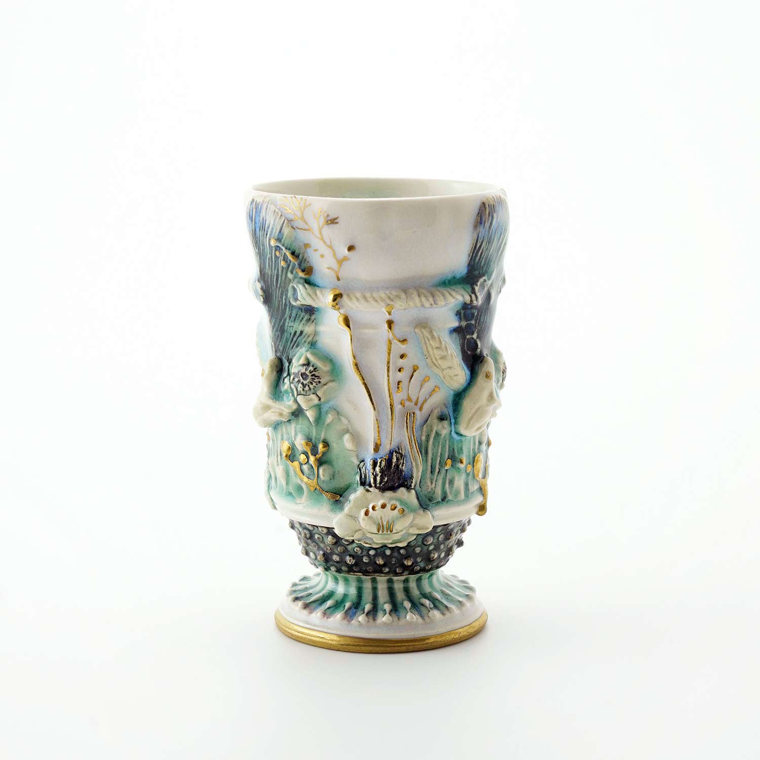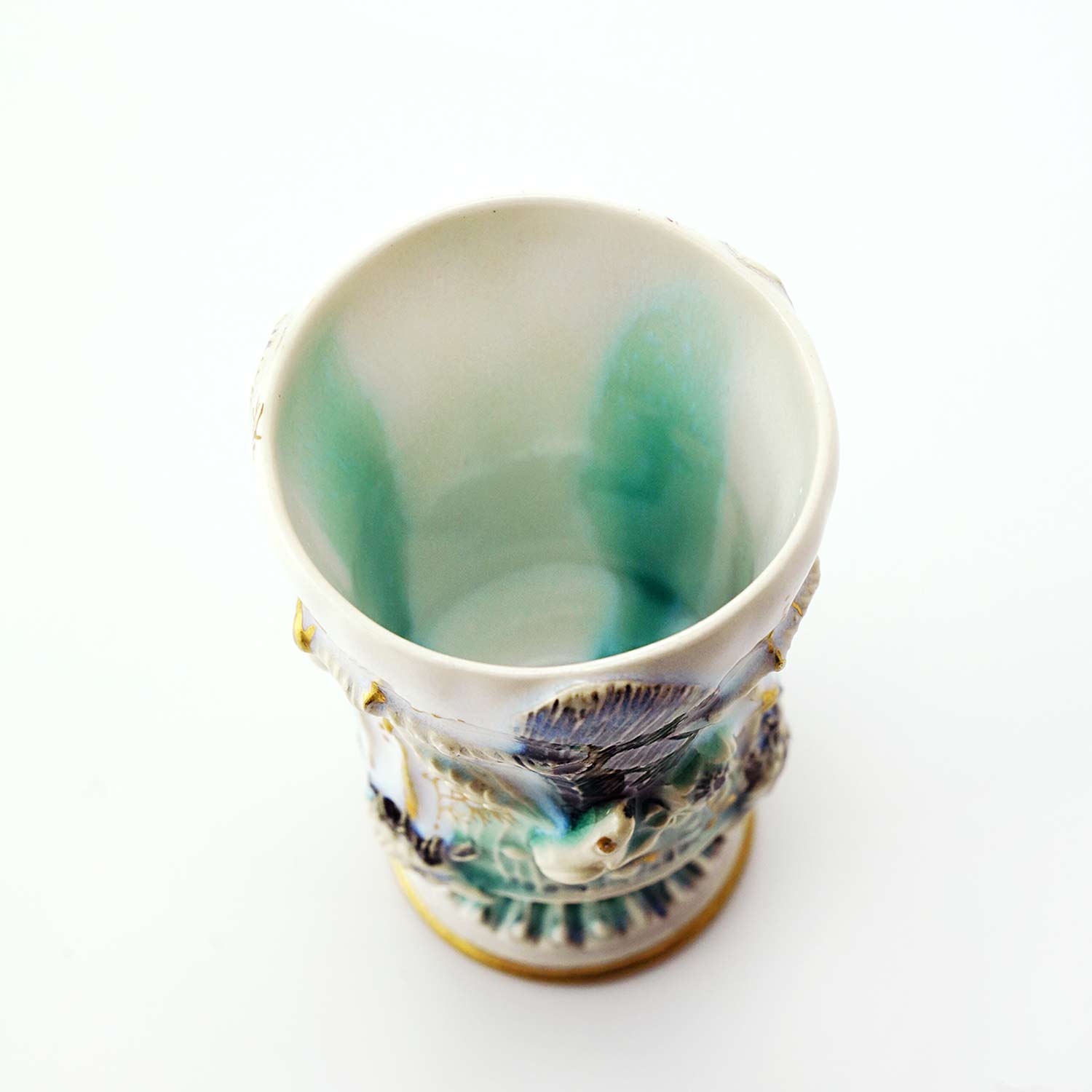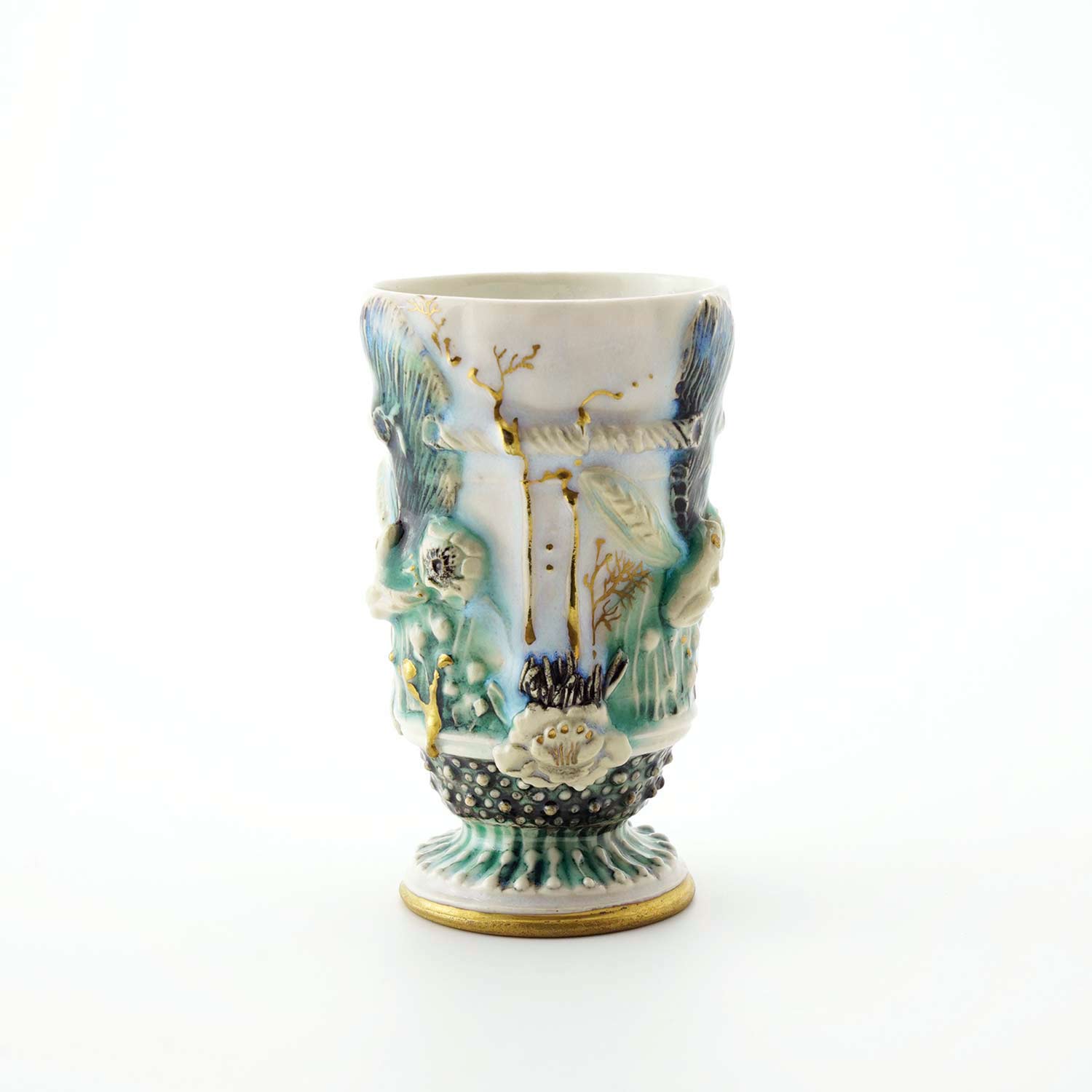 側面の装飾は即興的に施されているので、同じものは一つとしてありません。その儚い美しさから「モノノアワレ」というタイトルがついています。酒杯にもなります。
