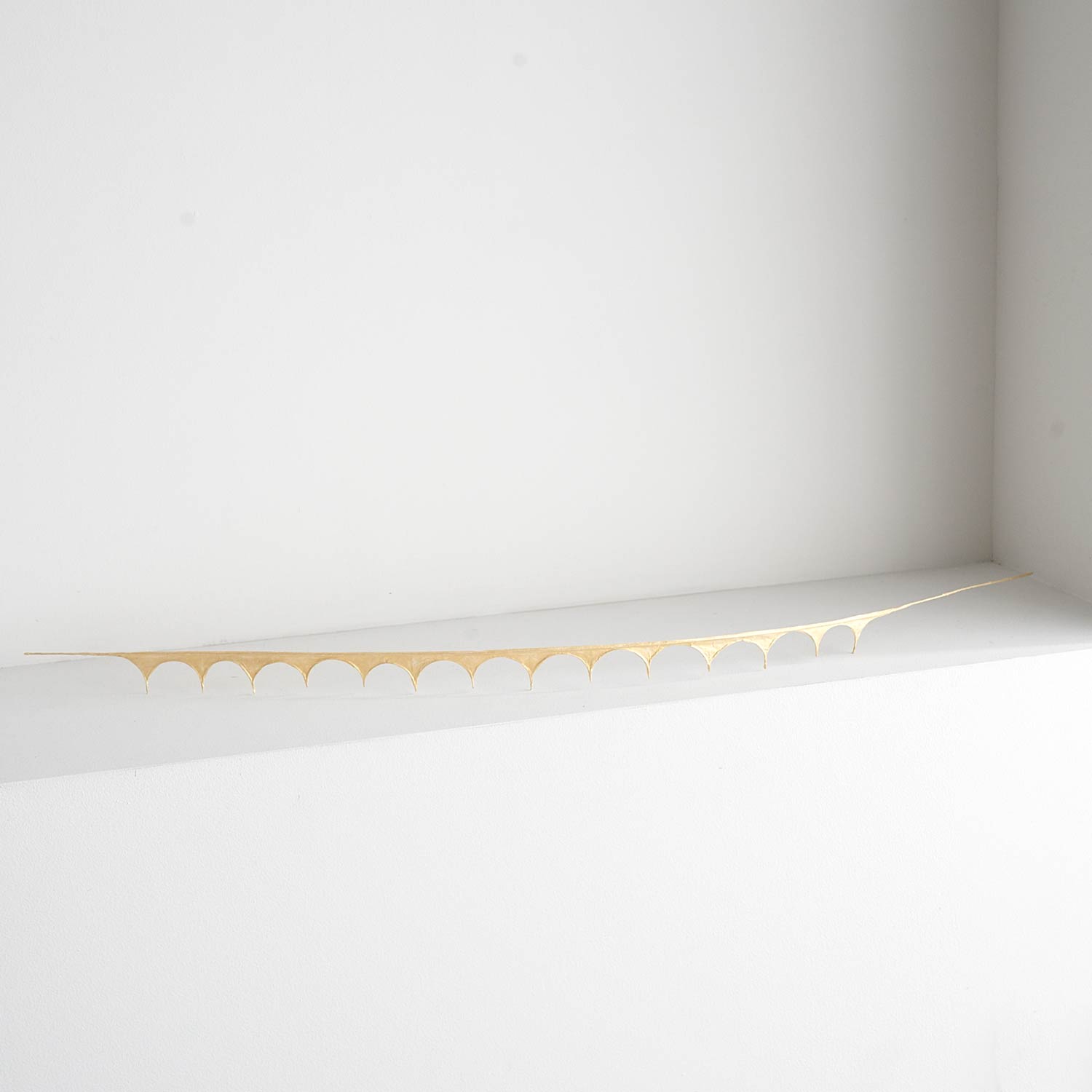 A wave-like object made of gold-painted Japanese paper and wire. It can be hung on the wall with pins or placed on the wall.
