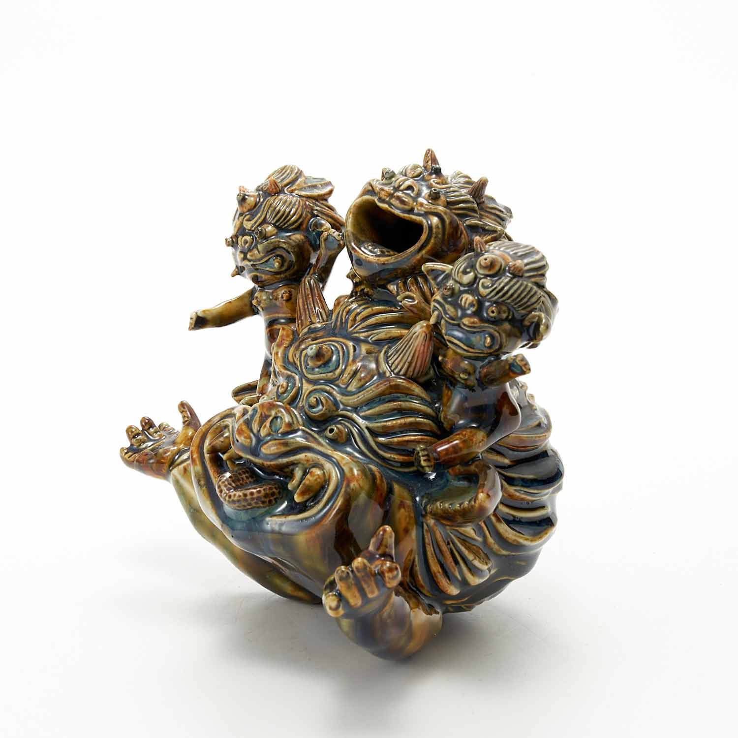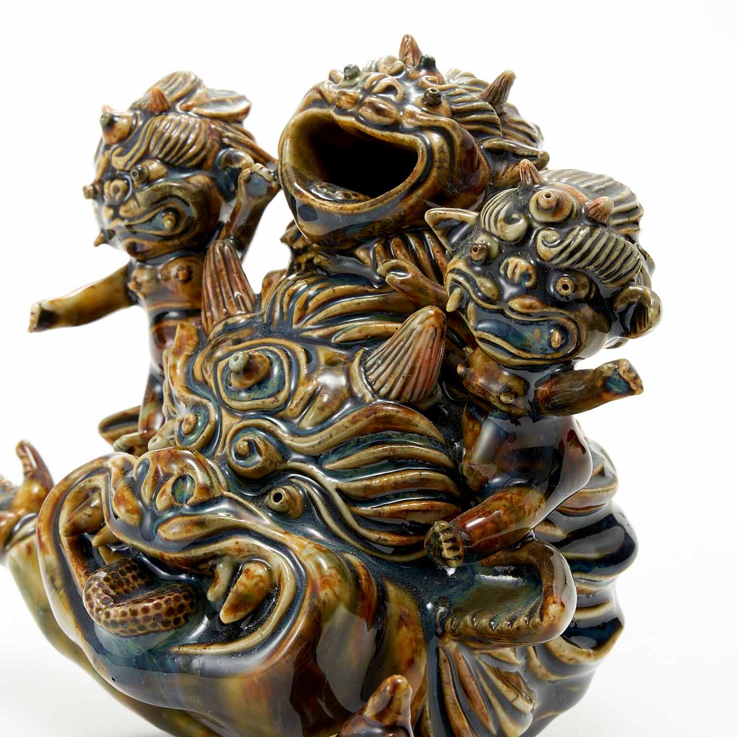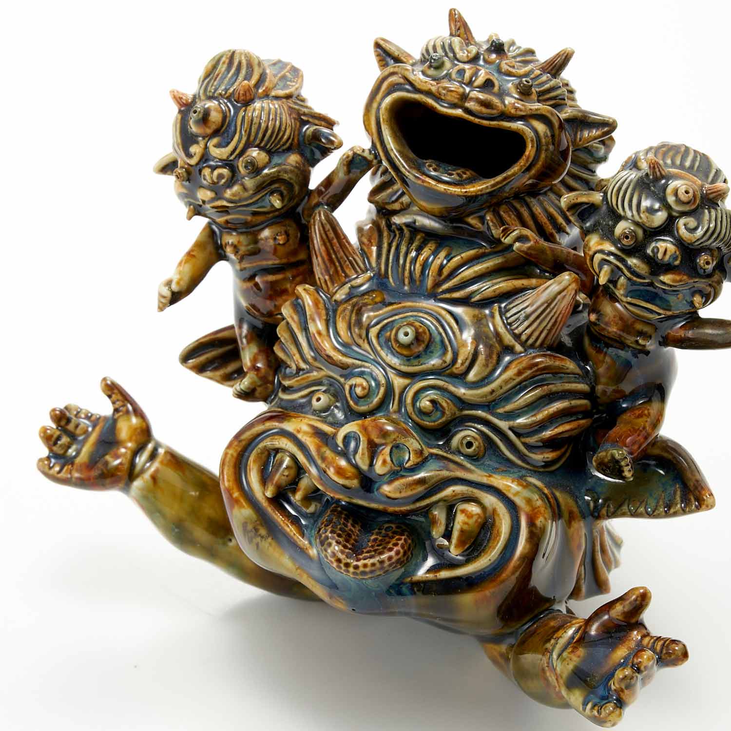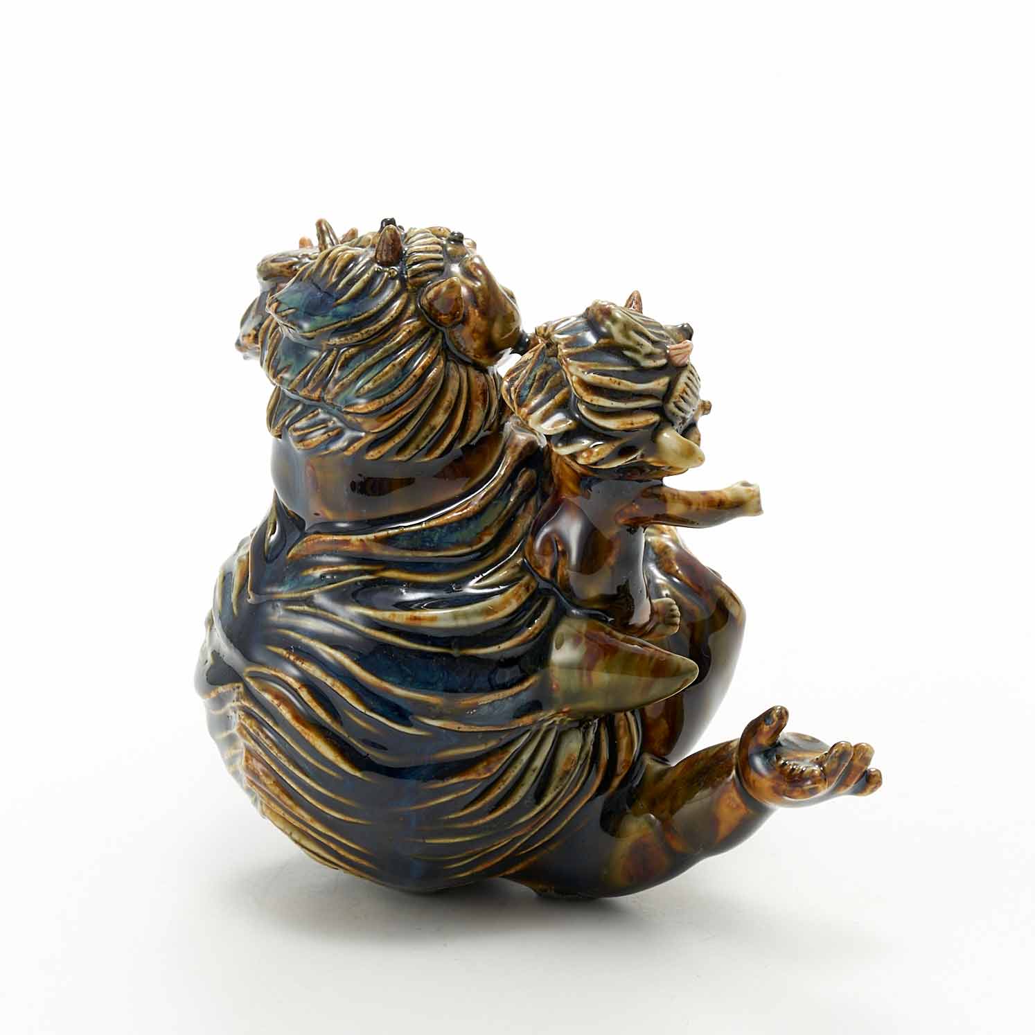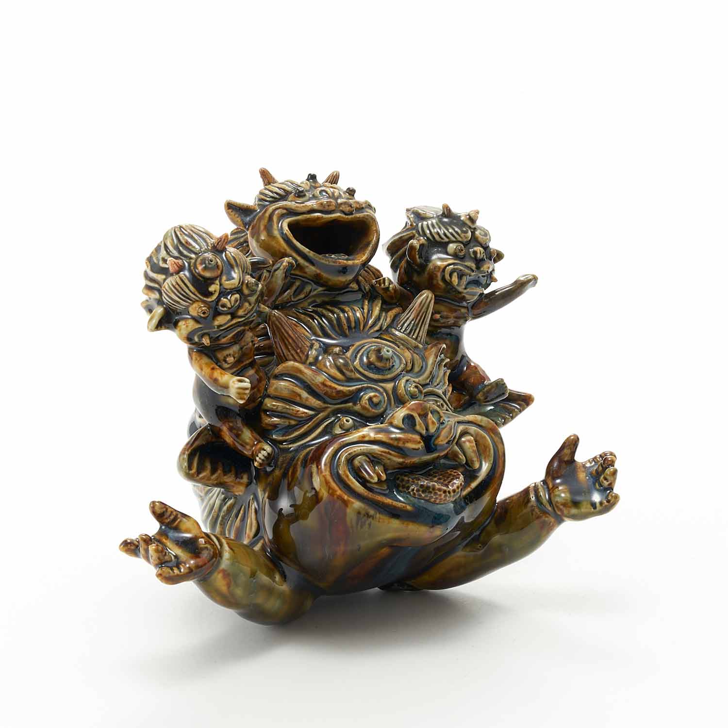 Three ogres are posing happily on top of a large ogre. The ogres' expressions are full of humor and fun. The dark brown glaze is also beautiful.