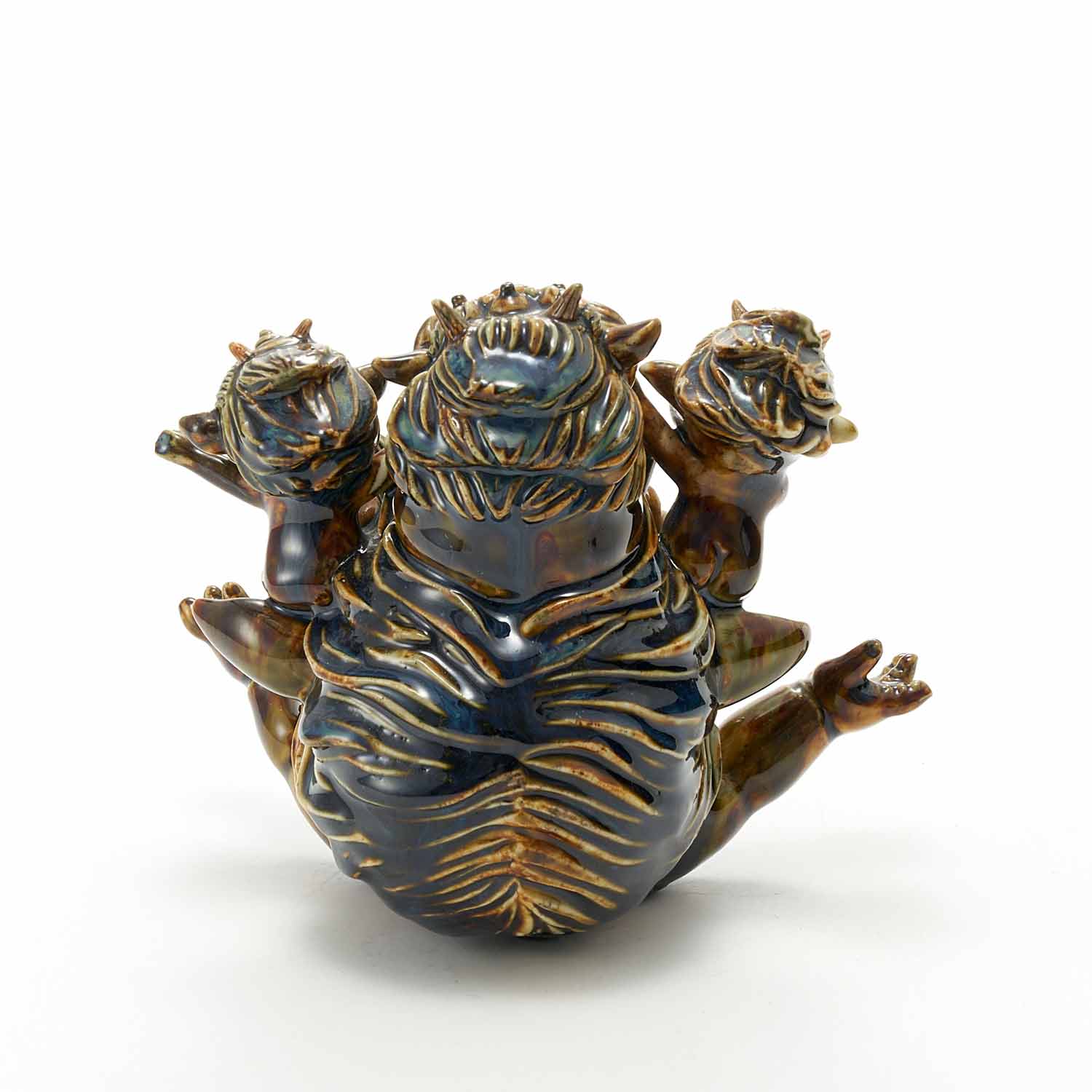 大きな鬼の上に3匹の鬼が乗っかり楽しそうにポーズを決めている作品です。鬼たちの表情がユーモアに溢れている楽しい作品です。焦げ茶色の釉薬も美しいです。