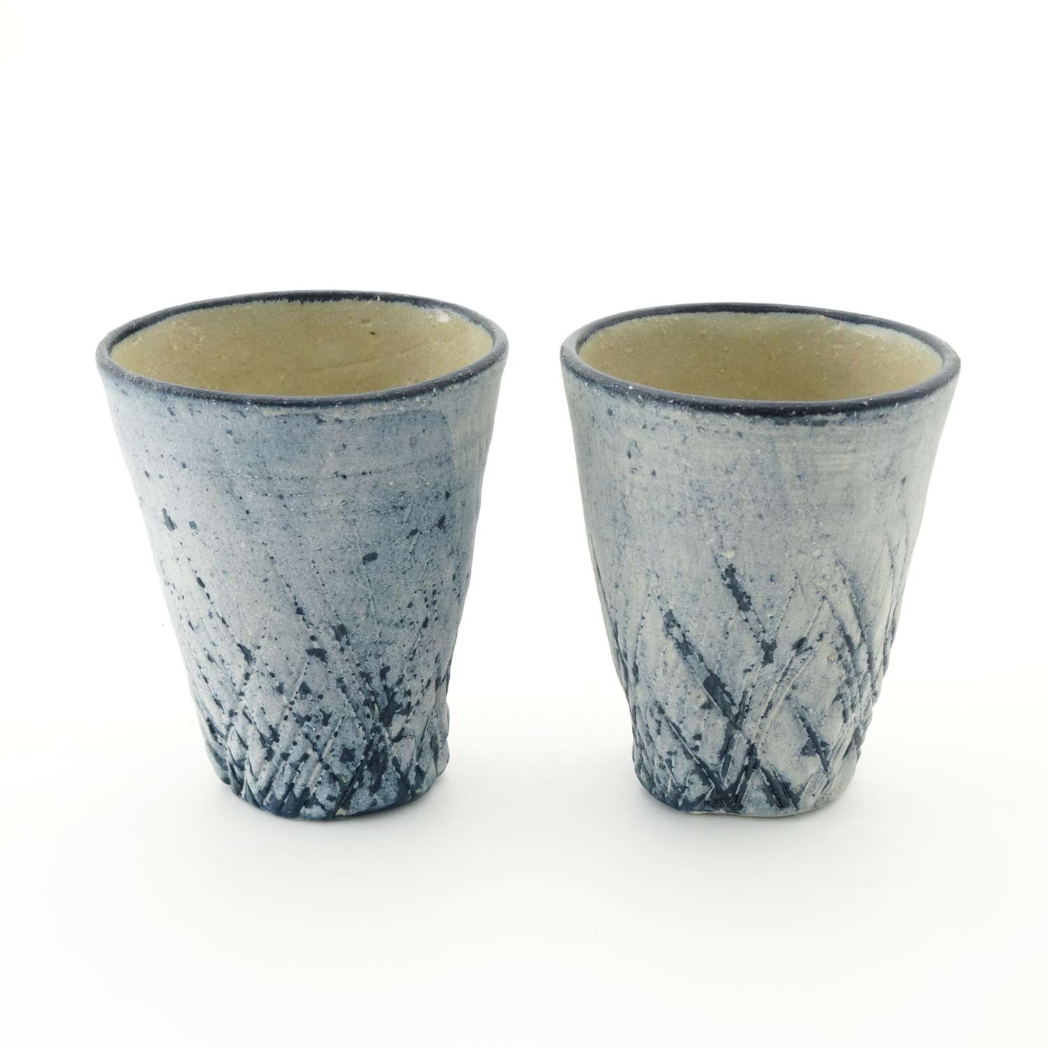 沖縄の素材にこだわり器作りをする紺野さん。白土をベースに紺と白化粧で加飾したカップです。少し大ぶりなのでビアカップとしてもお使いいただけます。