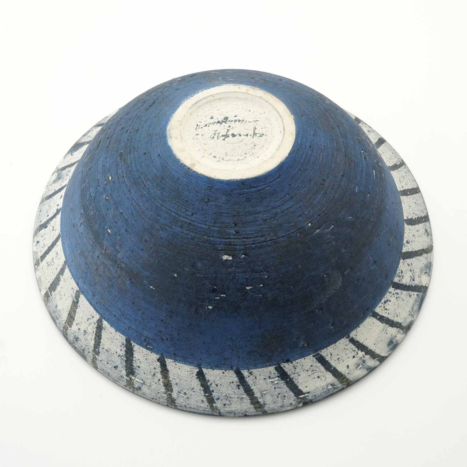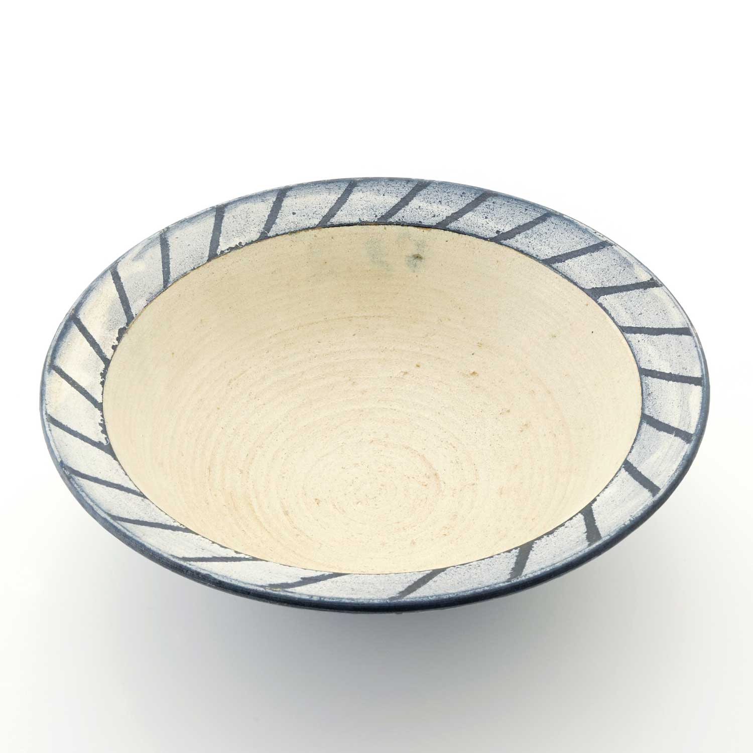 沖縄の素材にこだわり器作りをする紺野さん。白土をベースに紺と白化粧で加飾した大鉢です。ドライの質感が魅力です。
