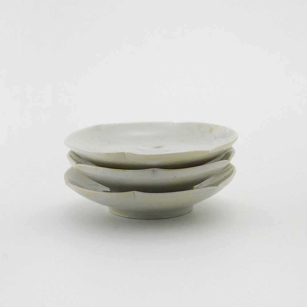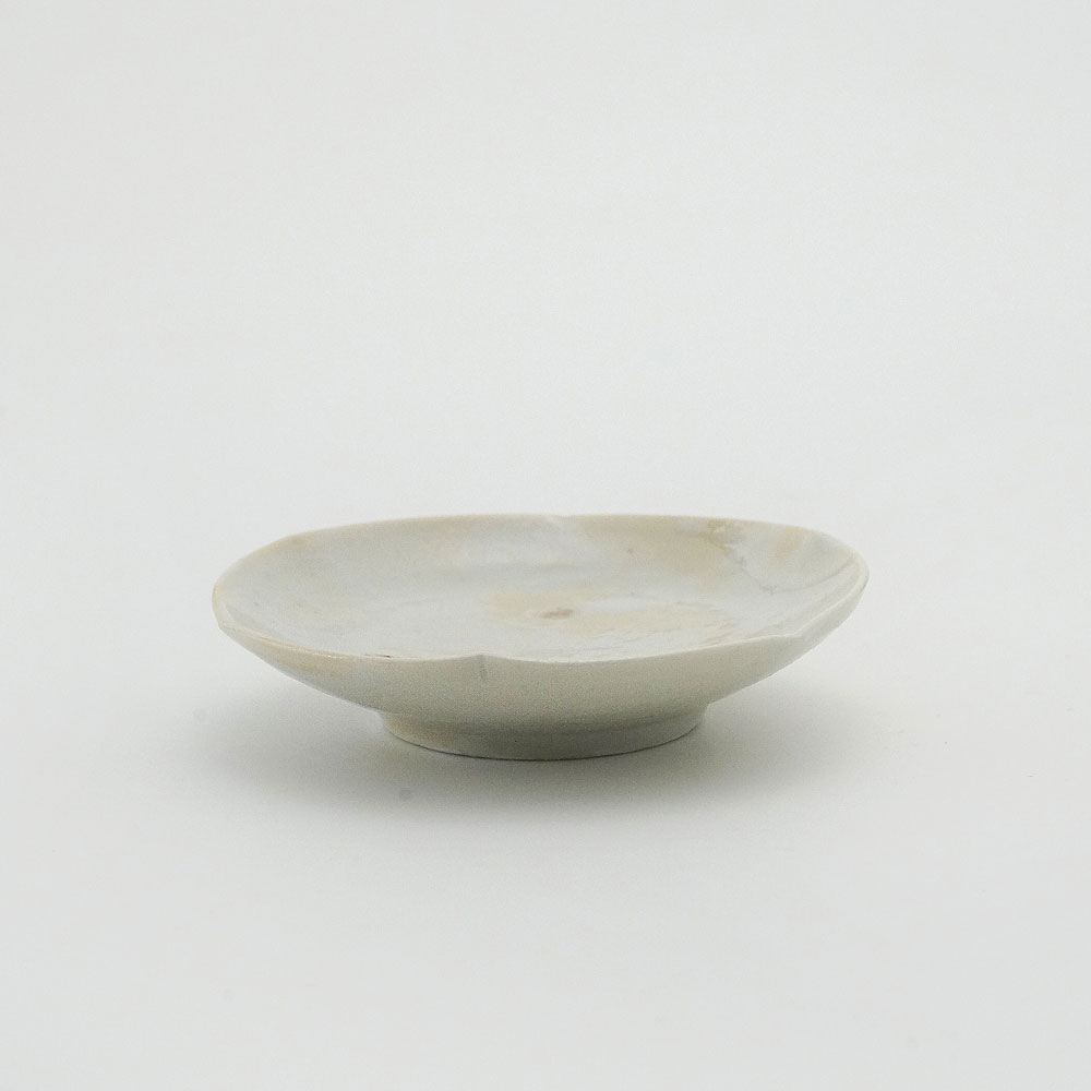 青白磁の釉薬揺らぎが美しい稜花豆皿。ふちに6箇所、ヘラで起伏をつけています。