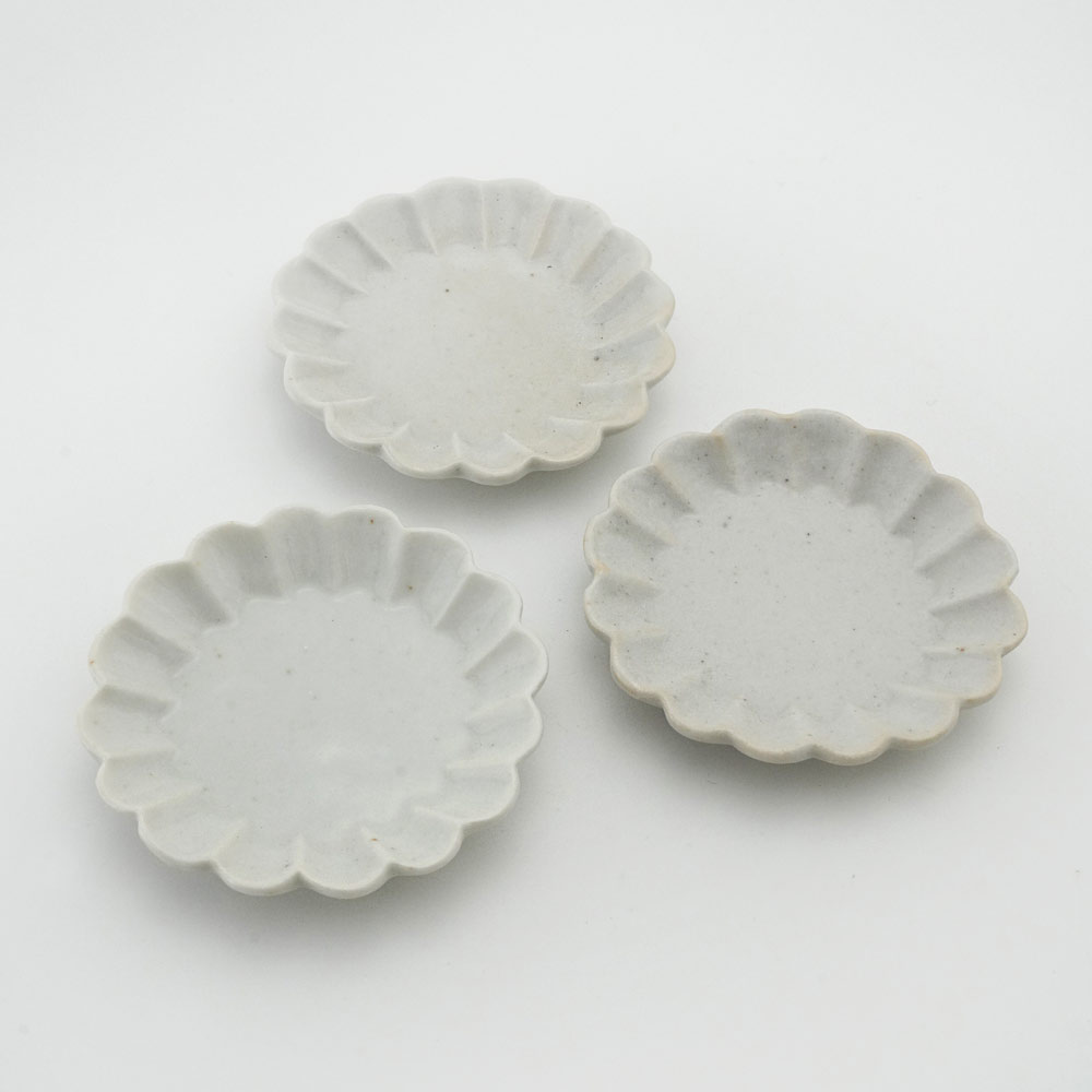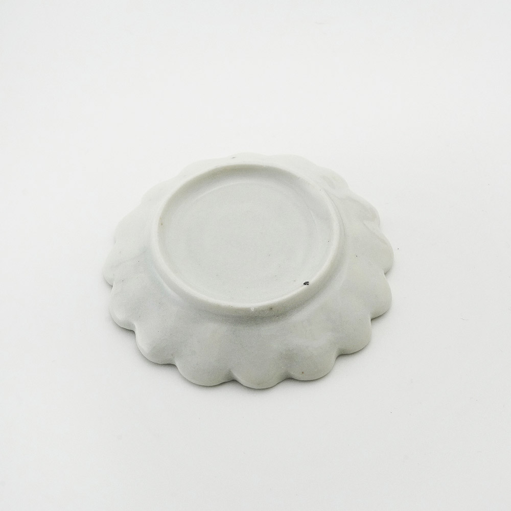 青白磁の釉薬揺らぎが美しい輪花豆皿。古物のような」佇まいです。