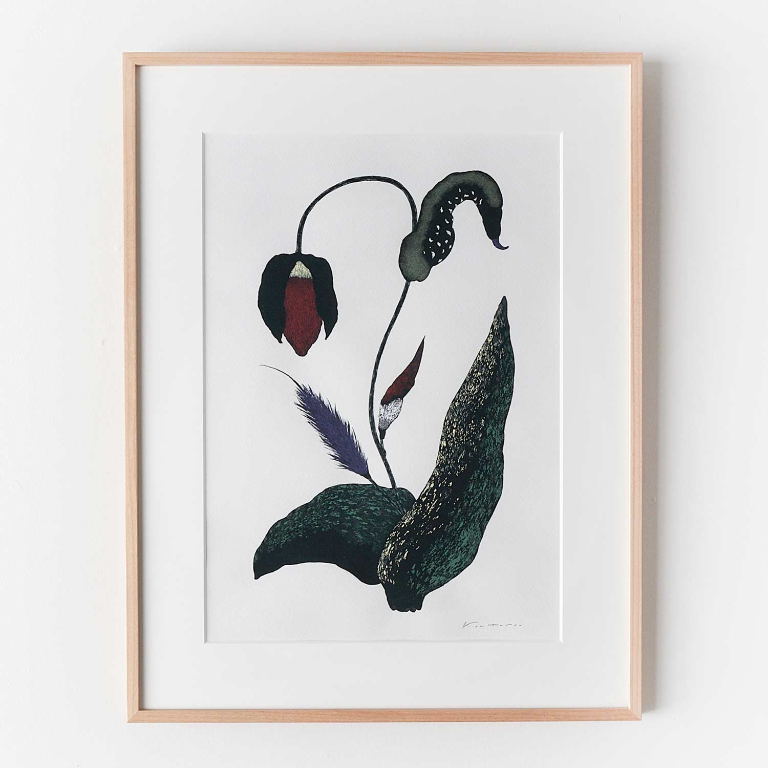 緻密さと大胆さで魅惑的に表現された実在しない植物。作品自体は約A3サイズ、白木の額装です。