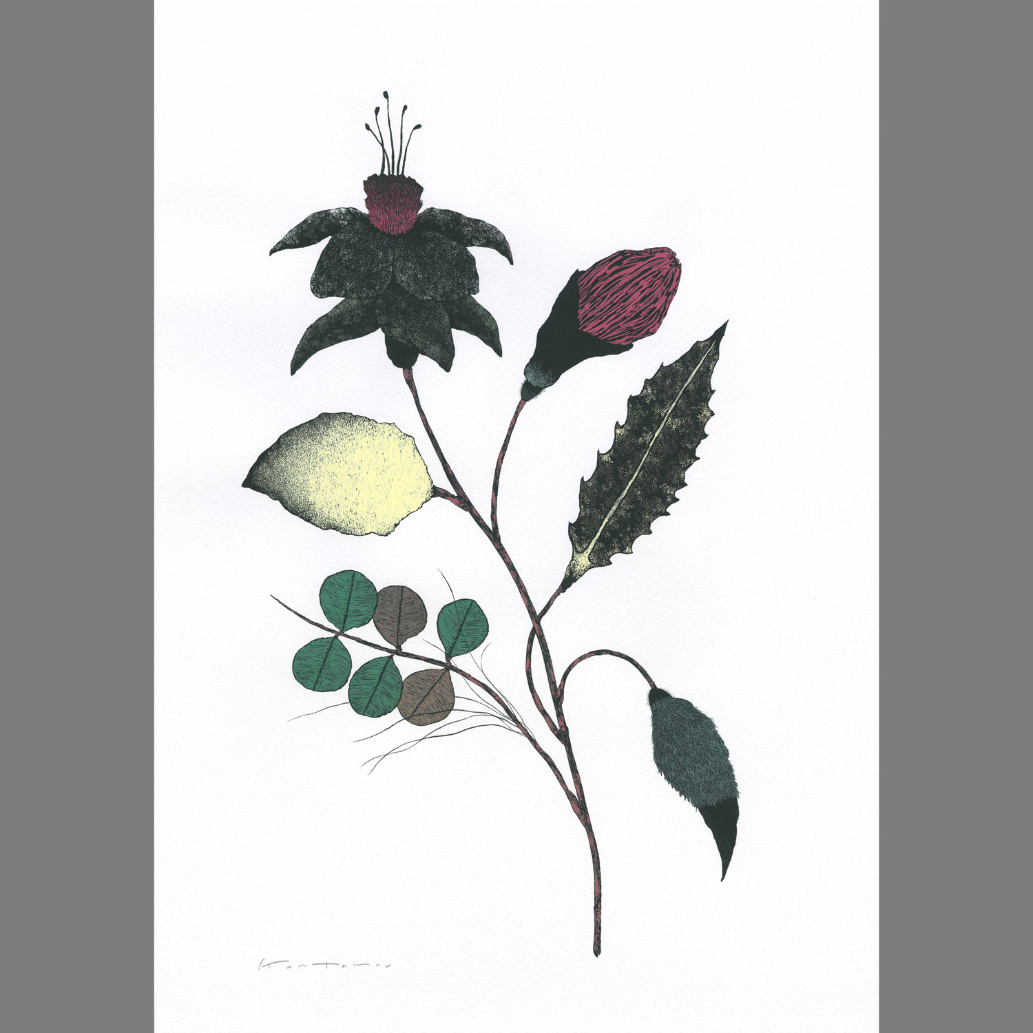 緻密さと大胆さで魅惑的に表現された実在しない植物。作品自体は約A3サイズ、白木の額装です。