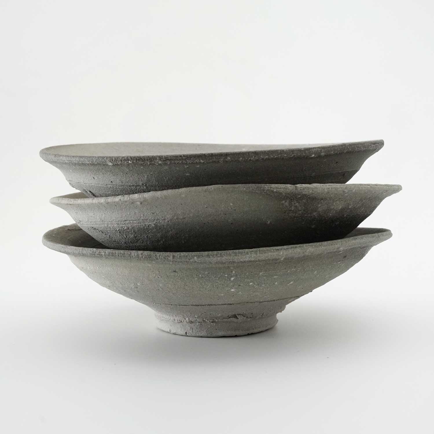 見込みが深く、使い勝手の良い皿です。口の揺らぎと須恵器独特のグレーの濃淡が上品。どんな料理にも合いそうです。使えば使うほど、滑らかと艶が増します。清水さん自ら築窯した穴窯で焼成しています。