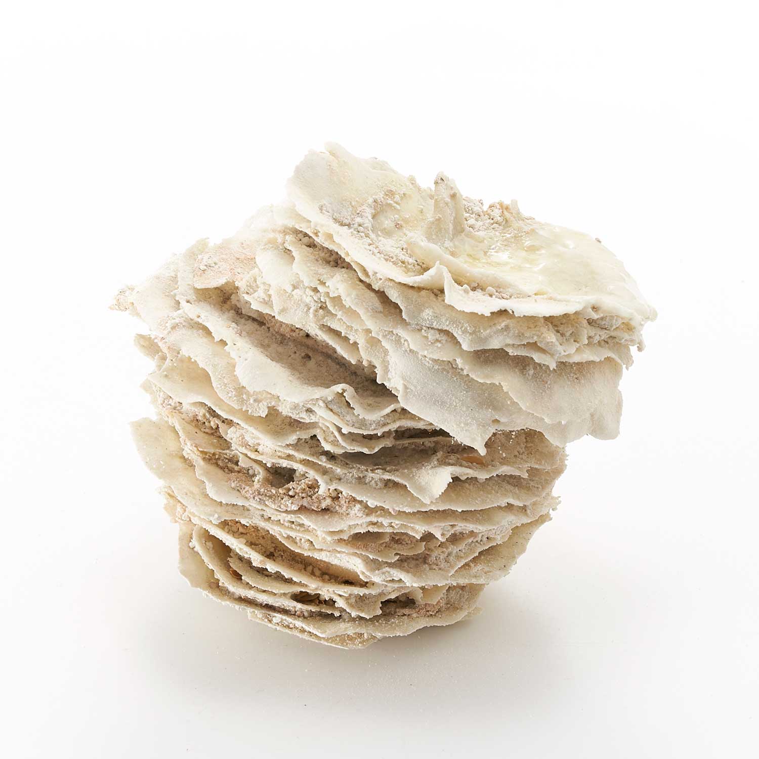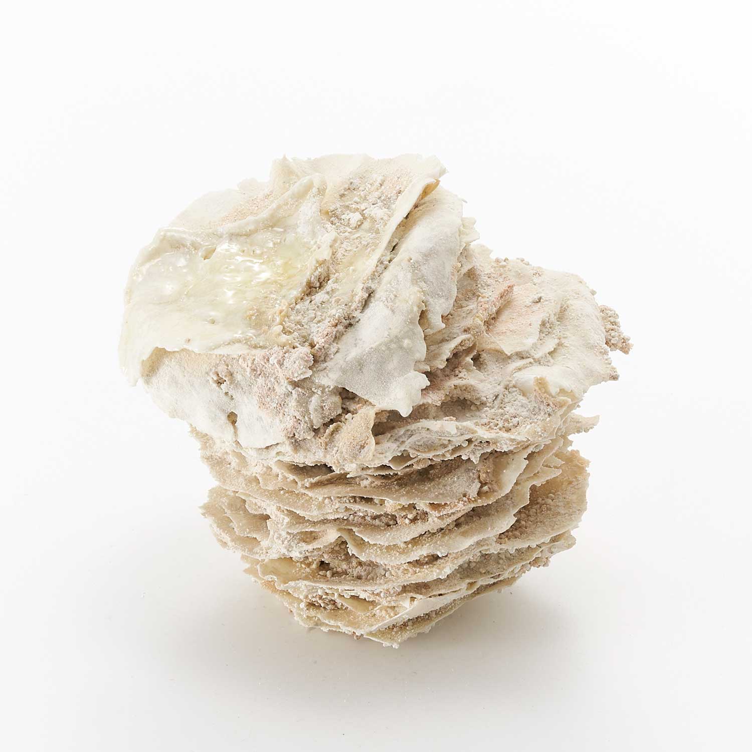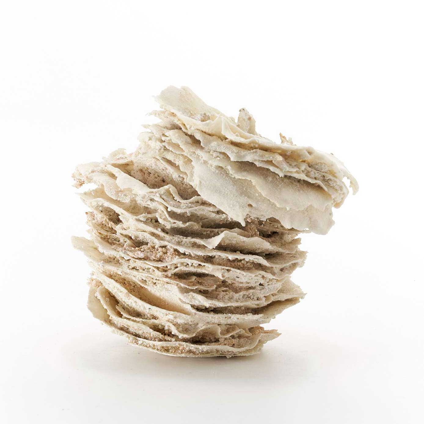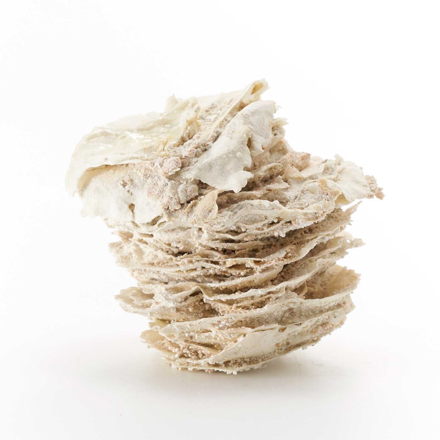白磁の泥漿と釉薬と砂を重ねて層を作り、焼成したオブジェです。重ねることで生まれた独特な形とドライな質感が魅力です。