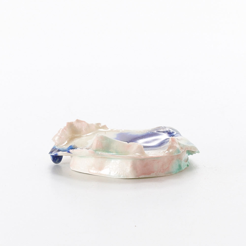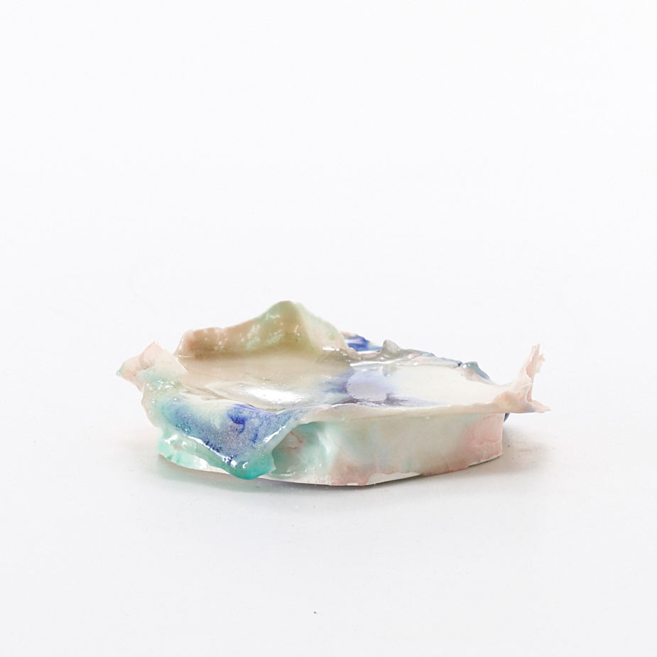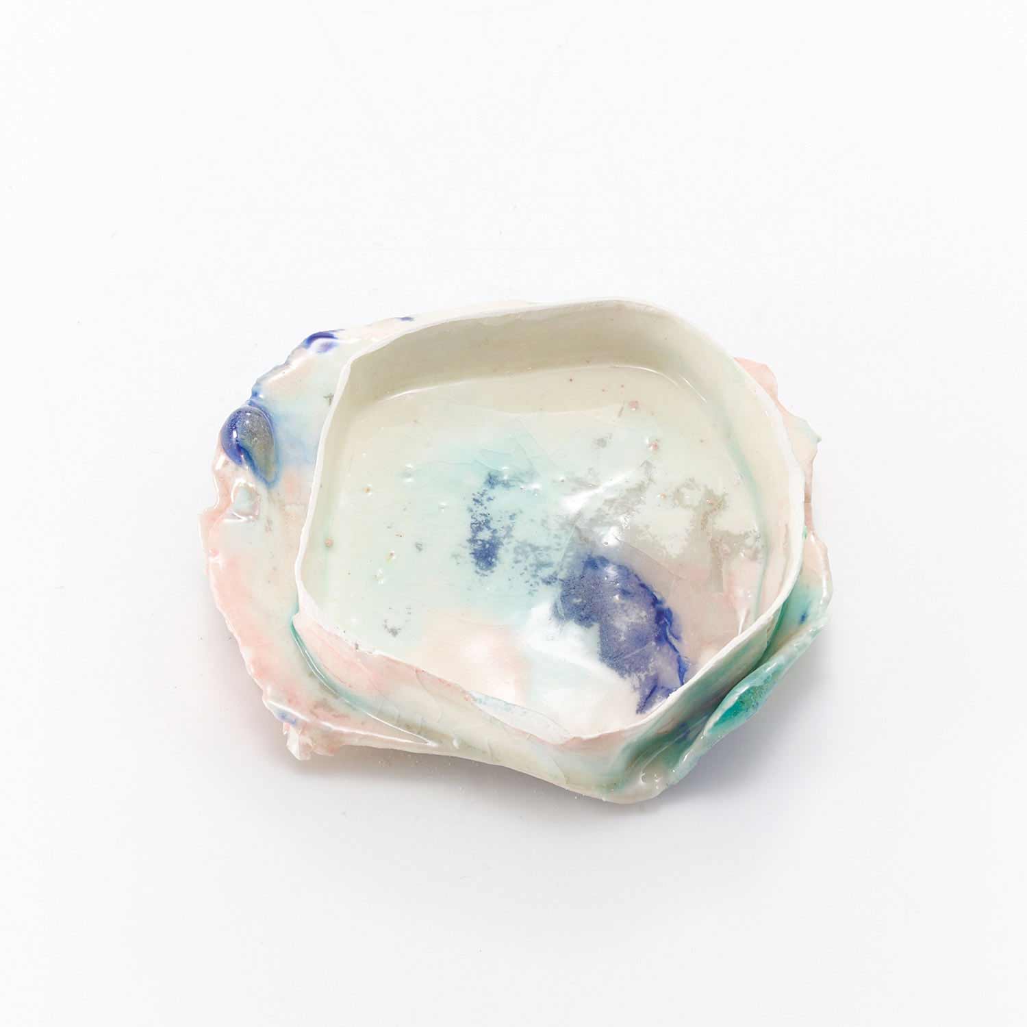 This work is made by mixing and layering porcelain mud and glaze to make a dough, then molding and firing it. The work is thin like a membrane and surprisingly light. It is a light and beautiful work..