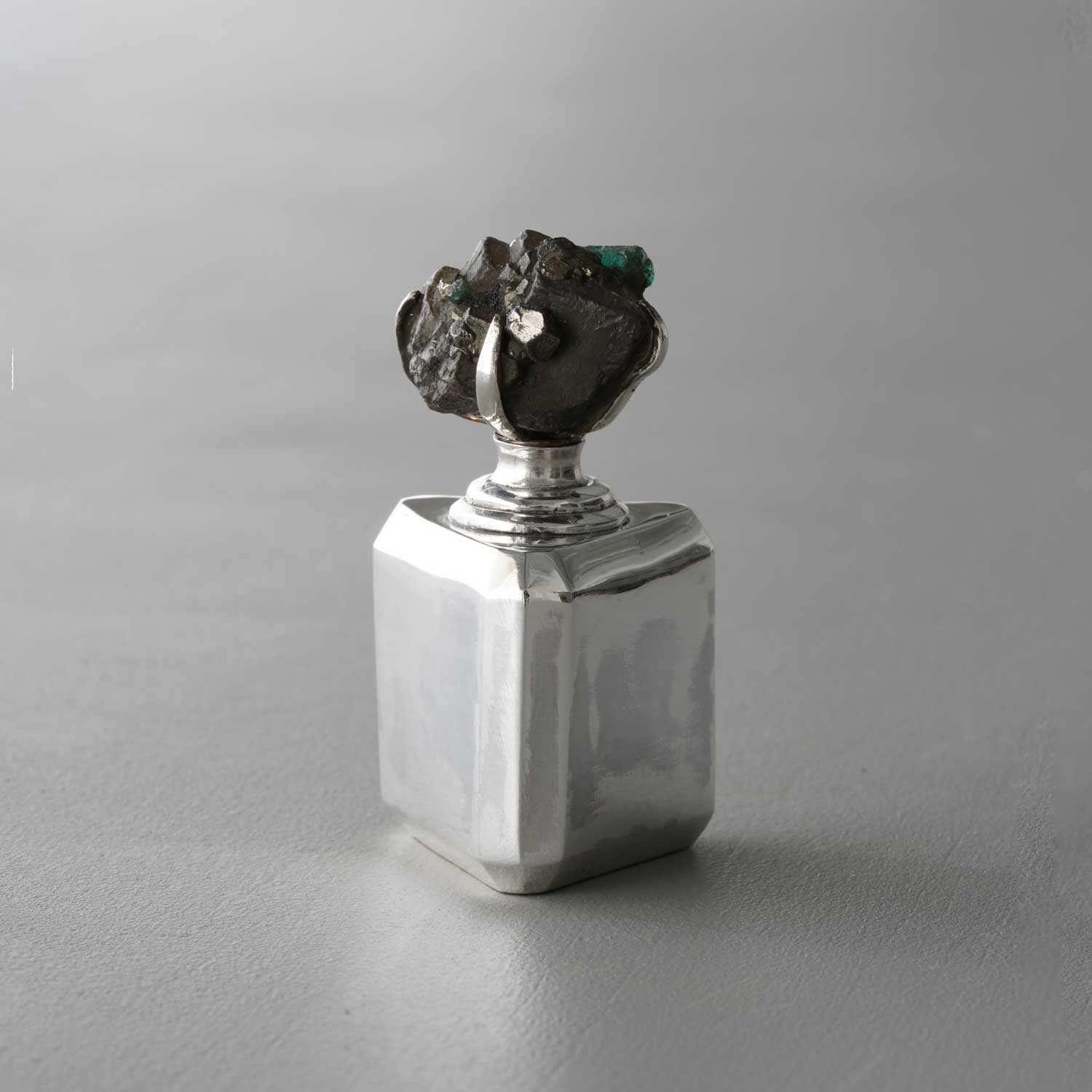 シルバーの小さなびんの蓋にエメラルドの原石が付けられています。エメラルドと瓶のバランスが楽しい作品です。