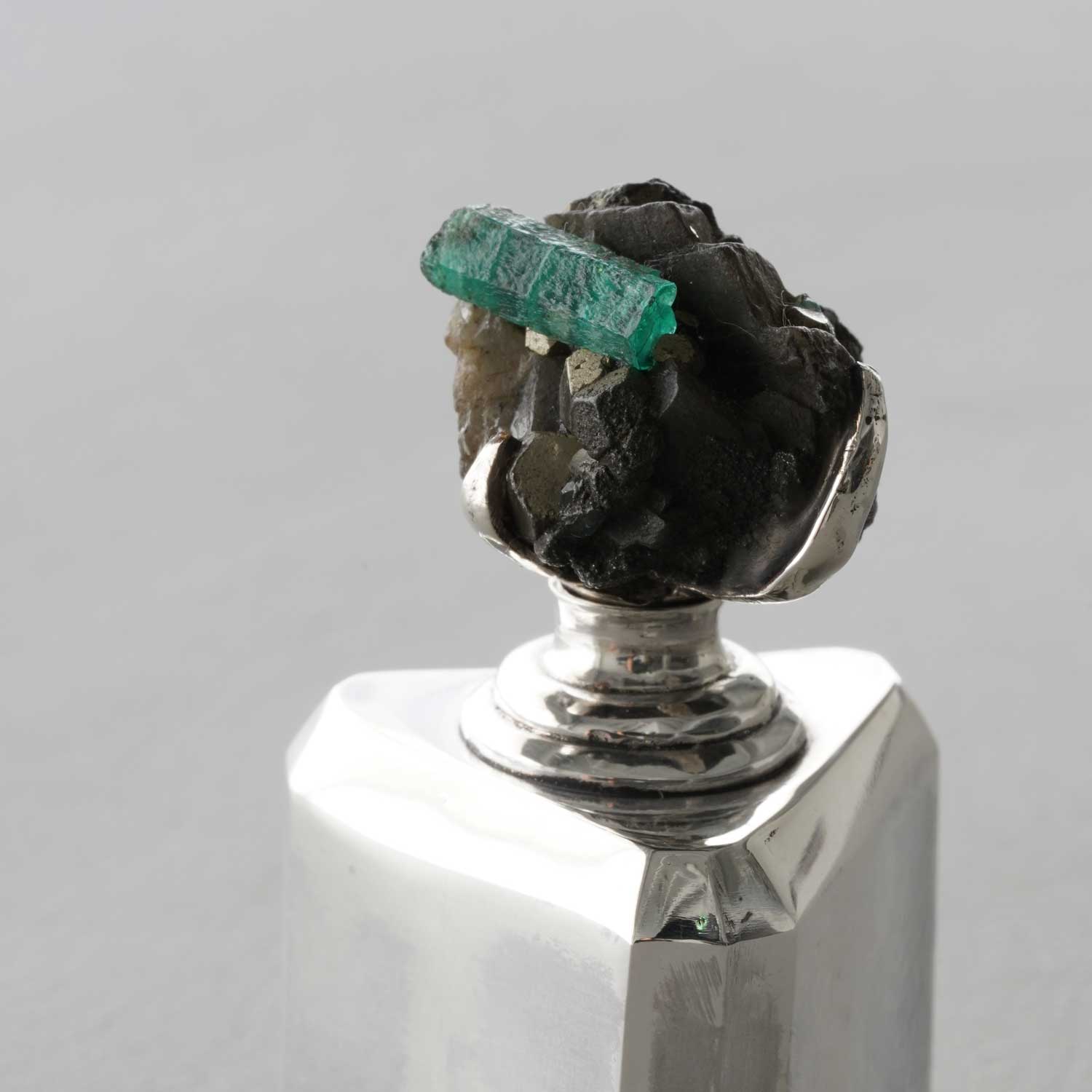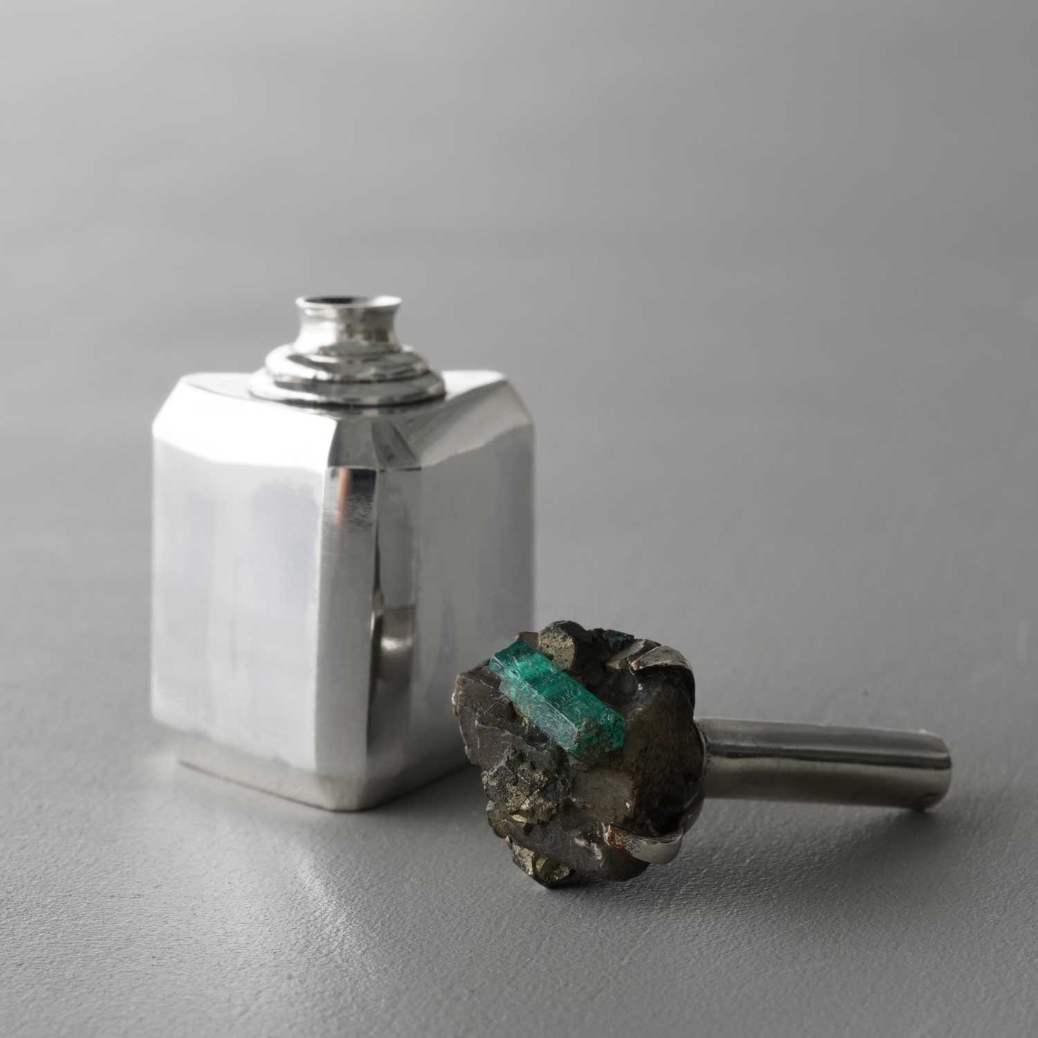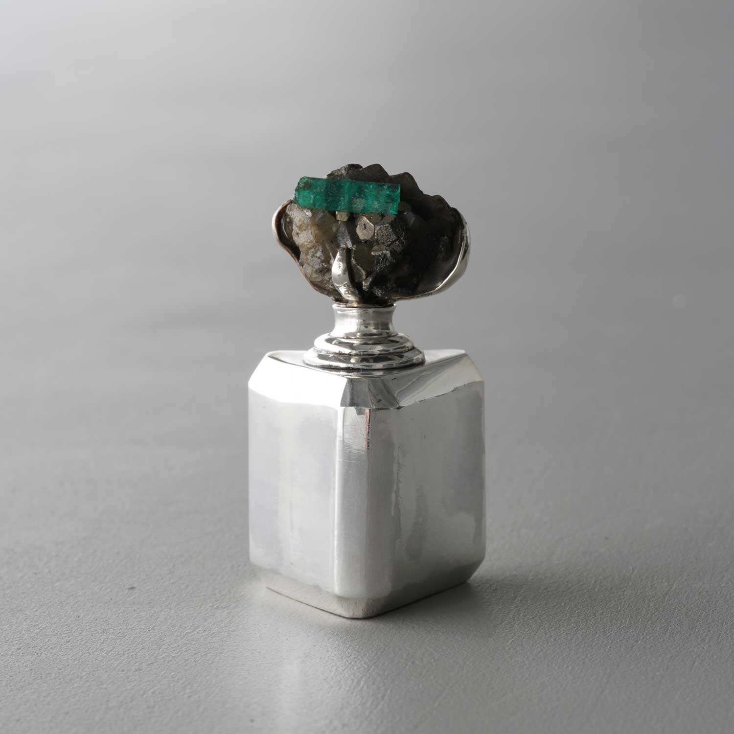 A small silver bottle with an emerald gem attached to the lid. The balance between the emerald and the bottle is delightful.