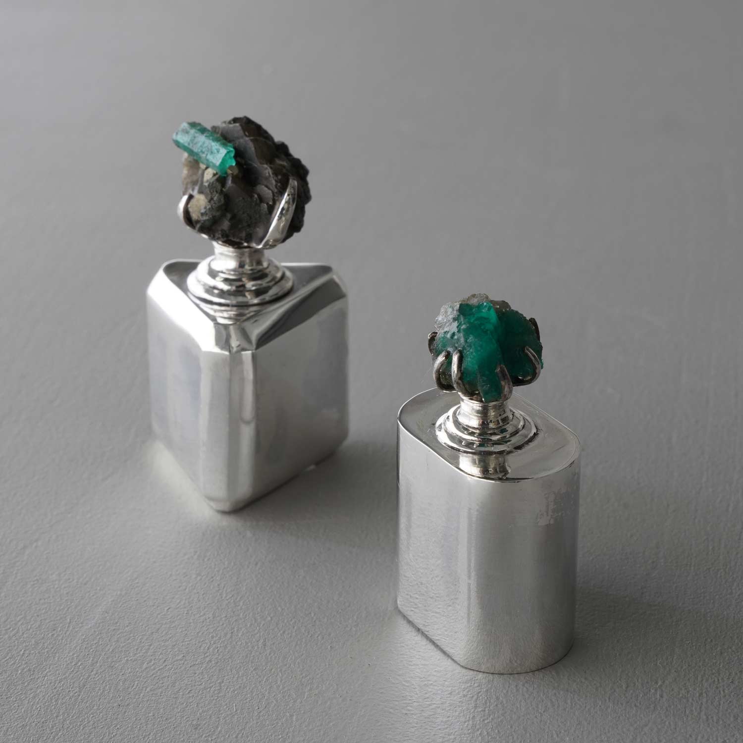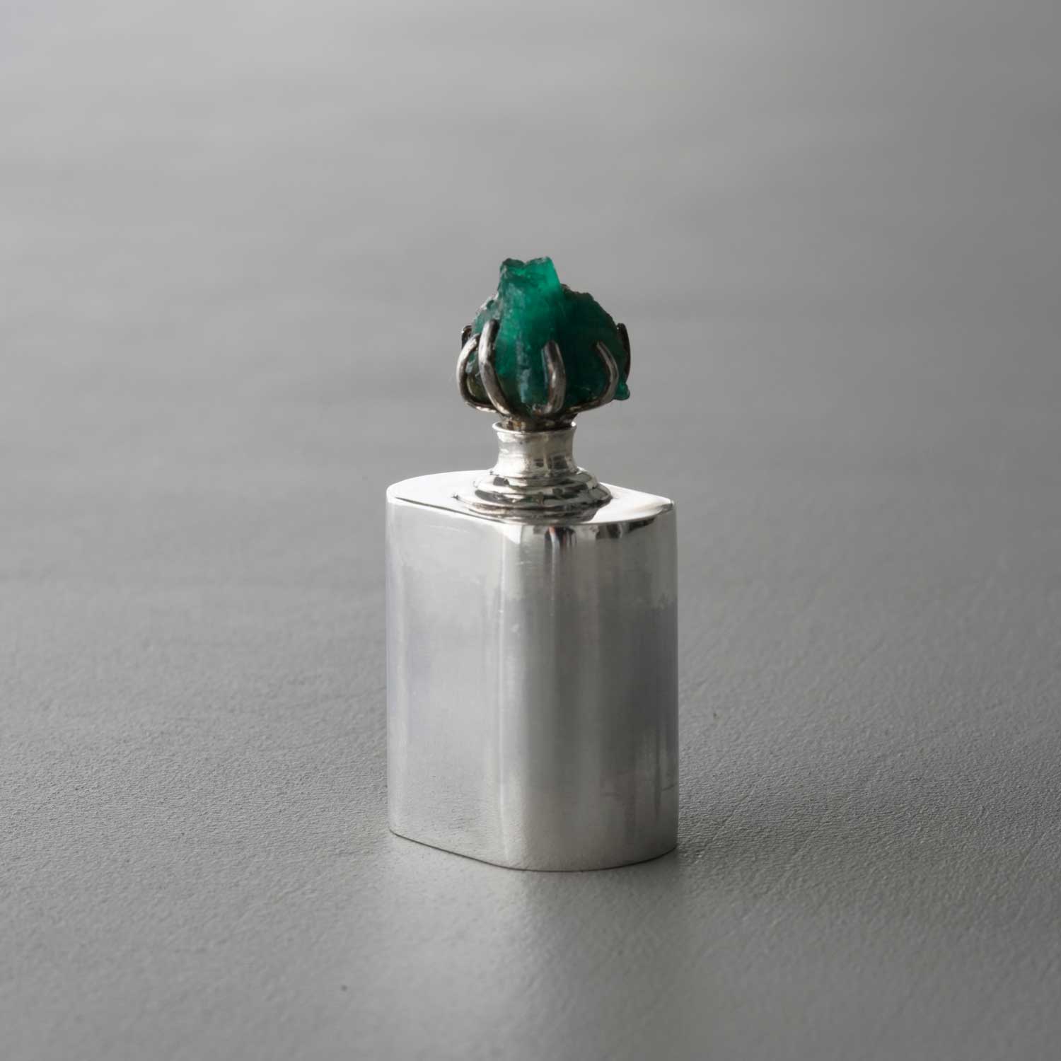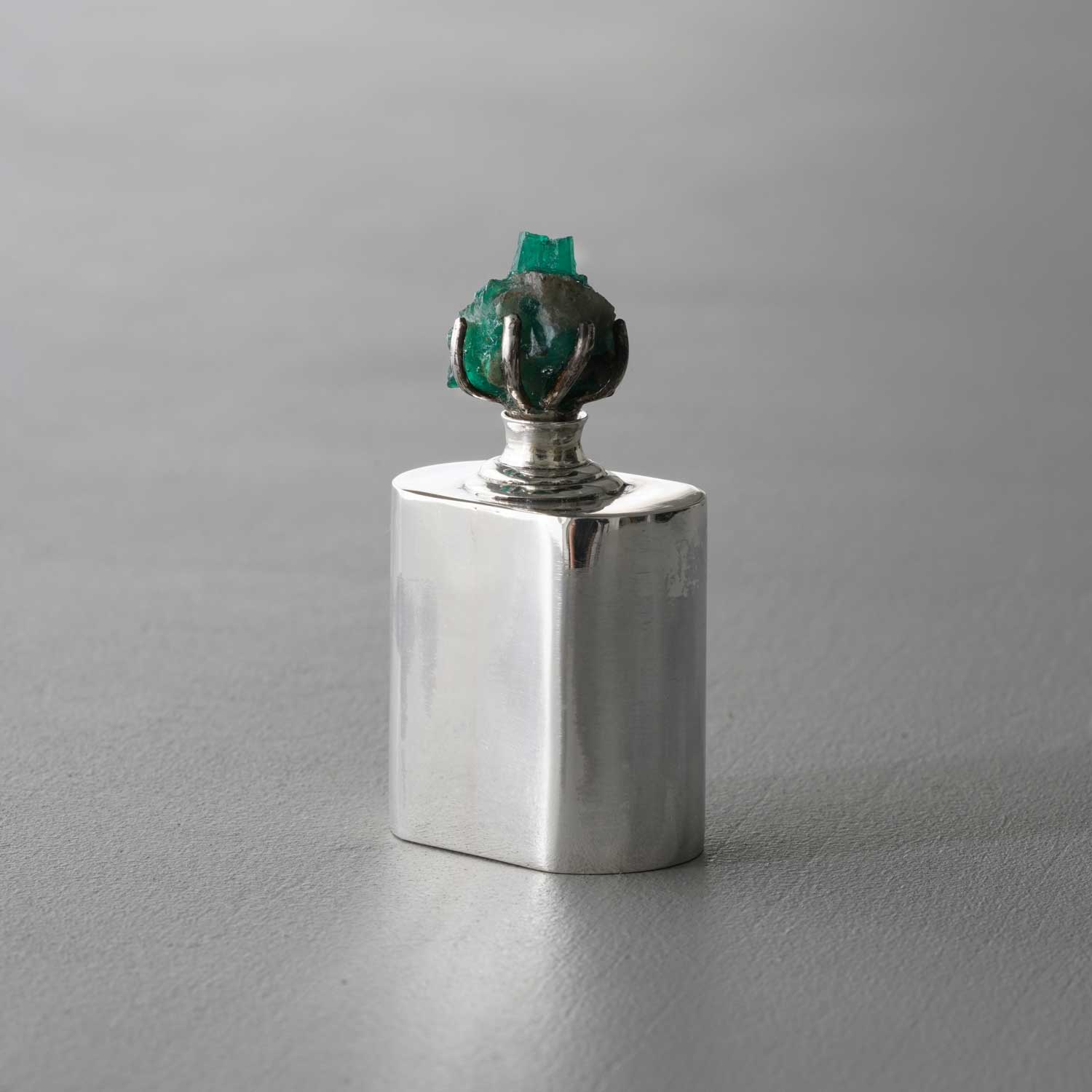 シルバーの小さなびんの蓋にエメラルドの原石が付けられています。エメラルドと瓶のバランスが楽しい作品です。