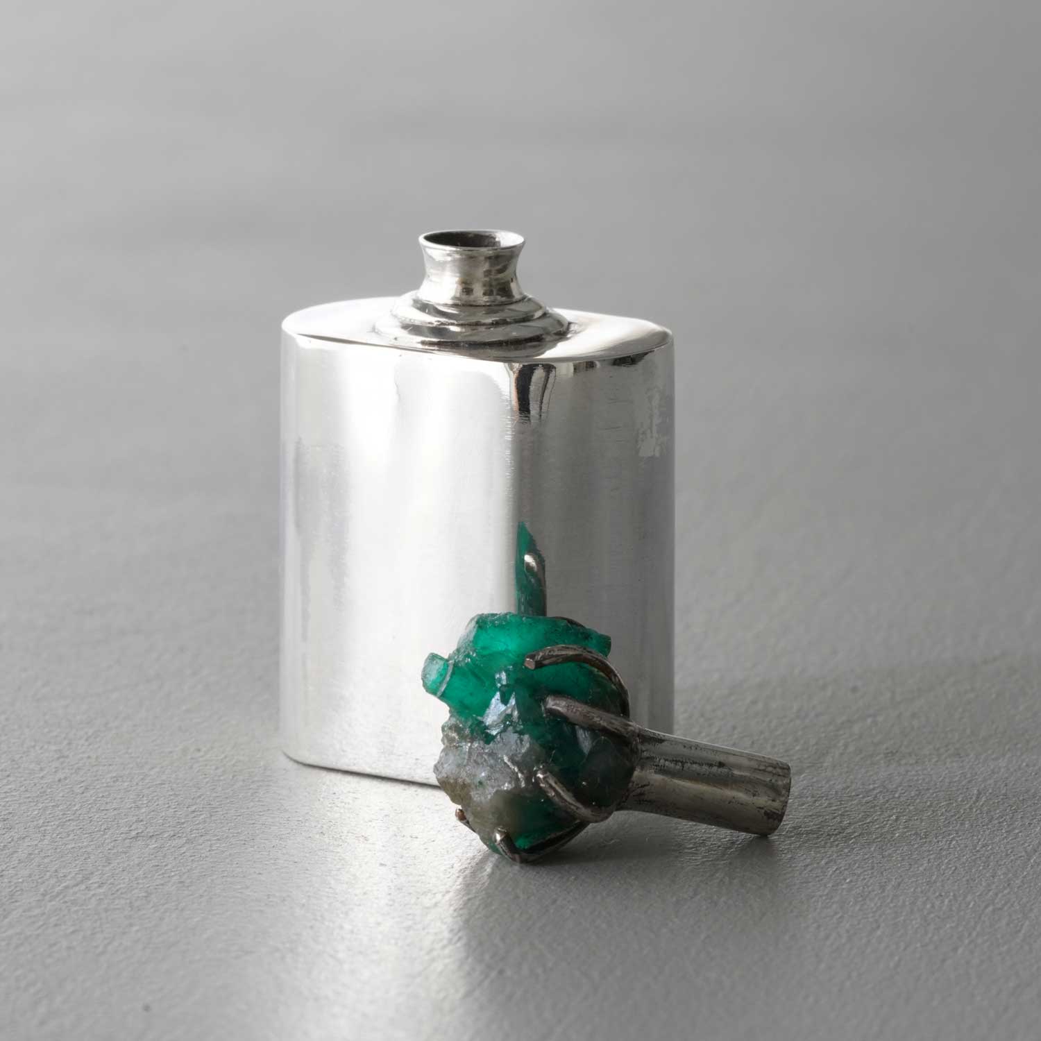 A small silver bottle with an emerald gem attached to the lid. The balance between the emerald and the bottle is delightful.