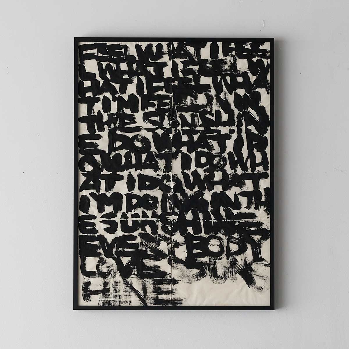 こちらは黒のアルミのフレームで額装しています。英語のテキストをびっちりと書いた洒落た作品。余白も効いています。