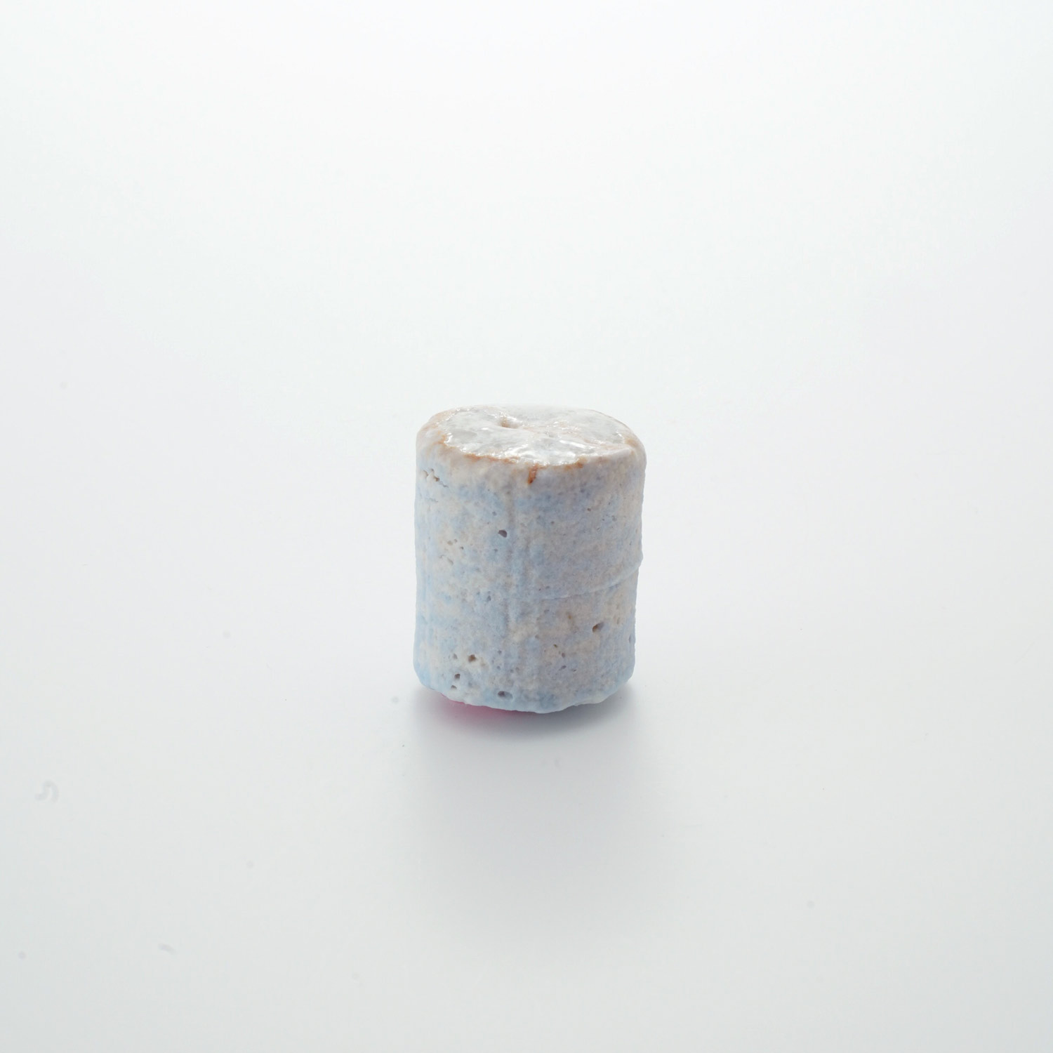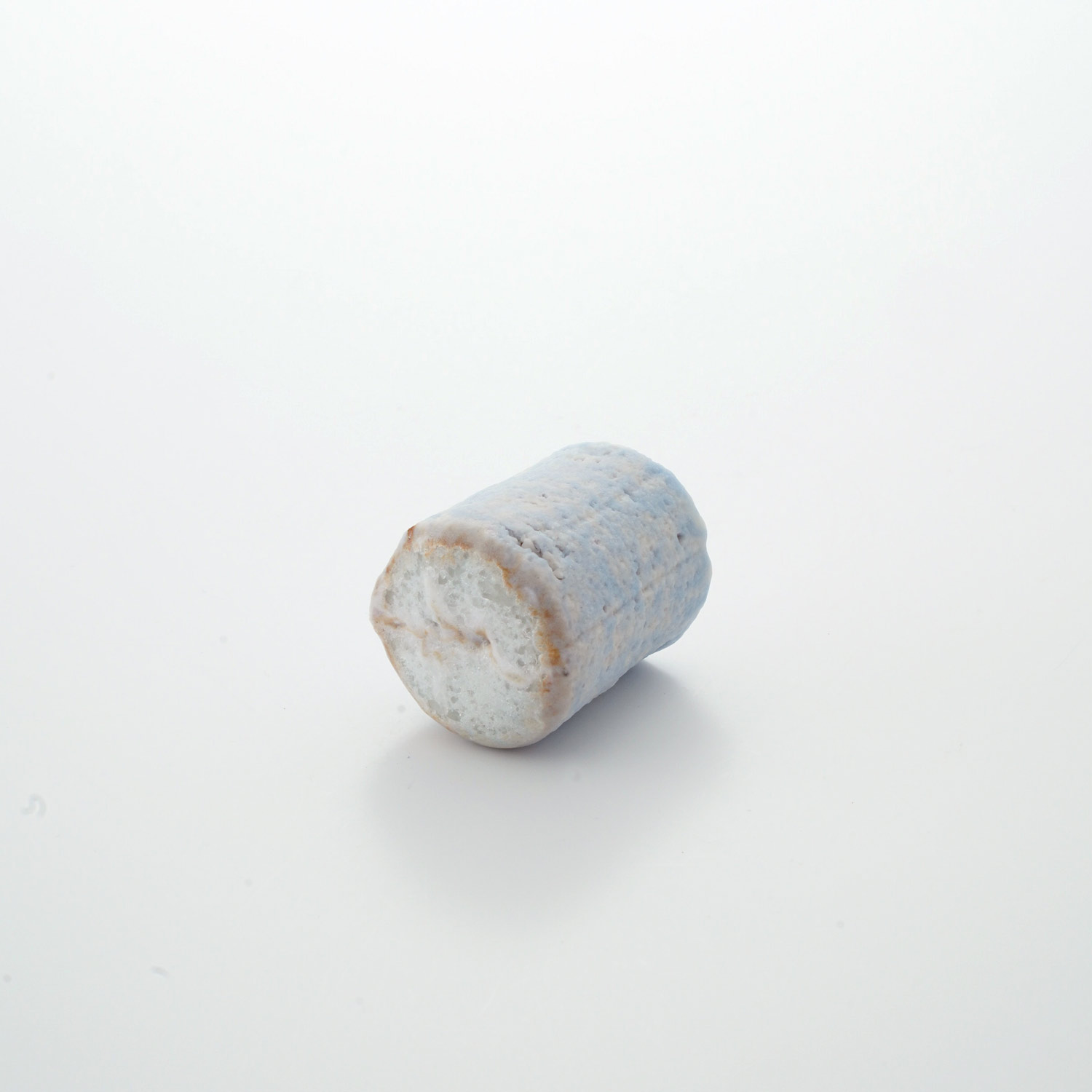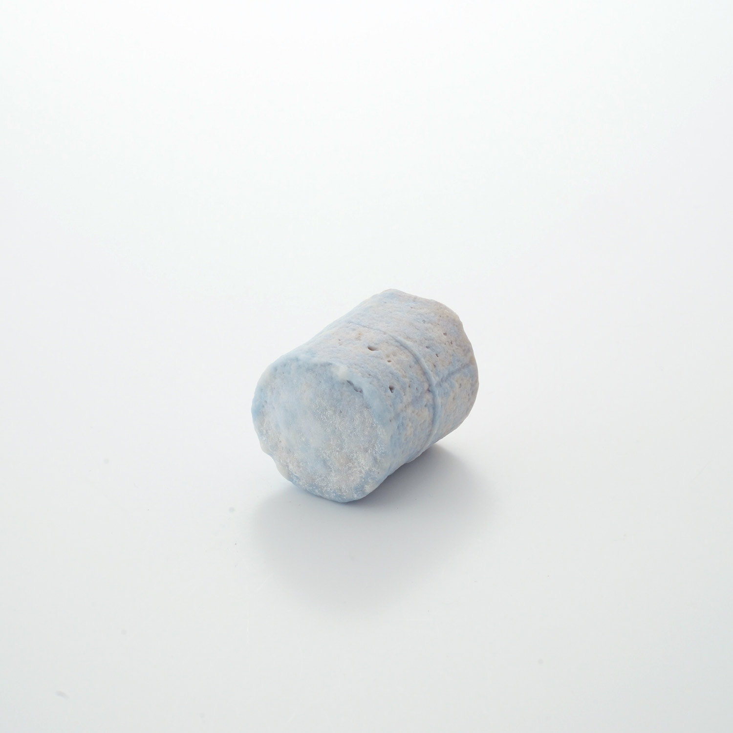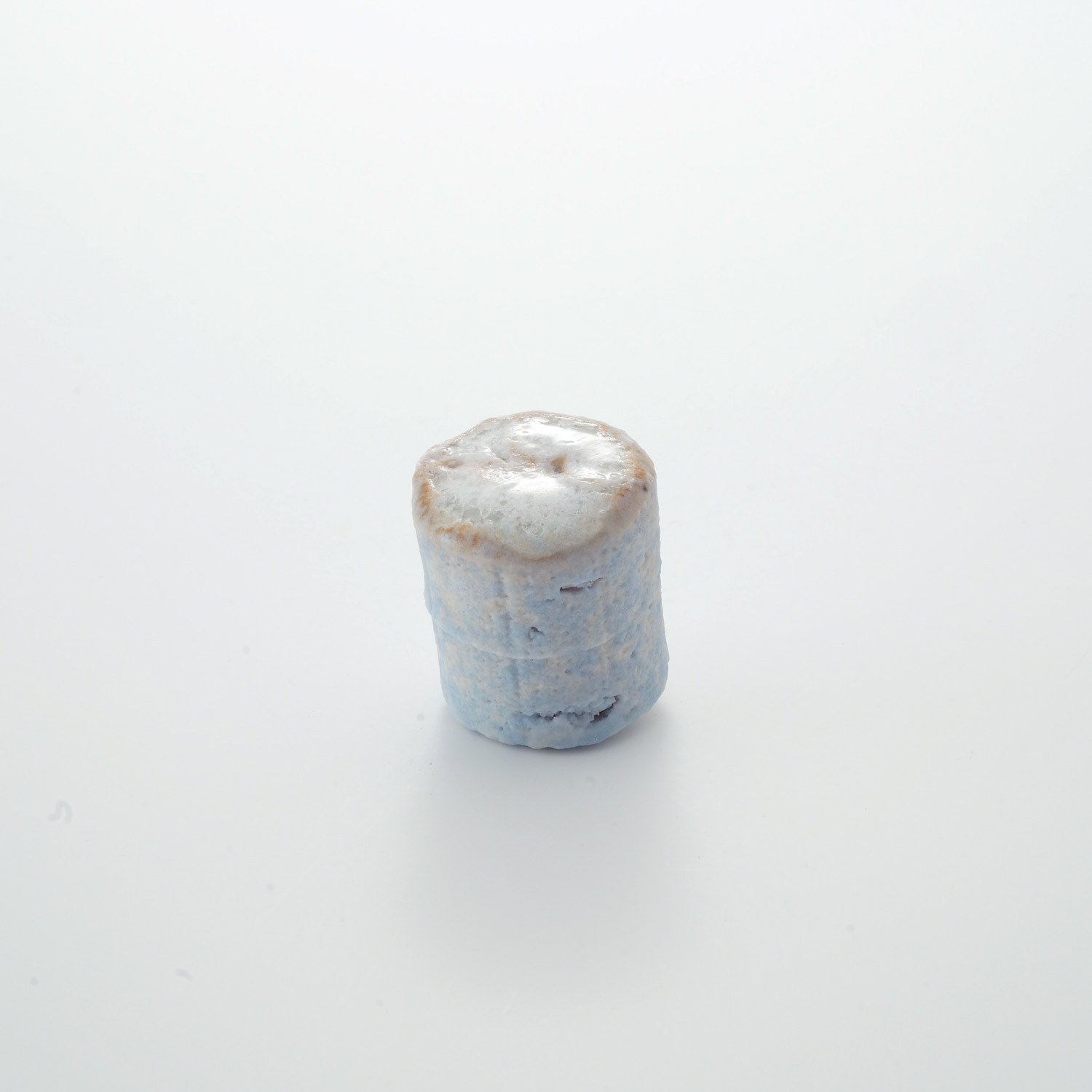 焼成する事で土に混ぜたガラス成分をとかし、形を変化させた作品です。形の変化の過程をとらえた小さな作品です。優しいブルーと乾いた質感がマッチしています。