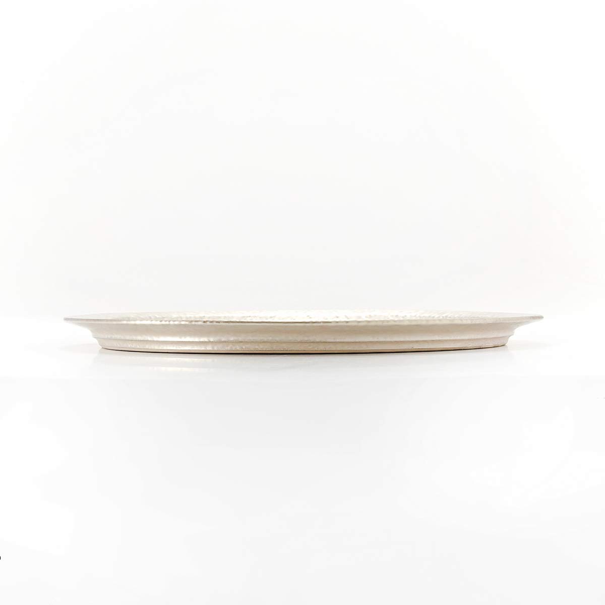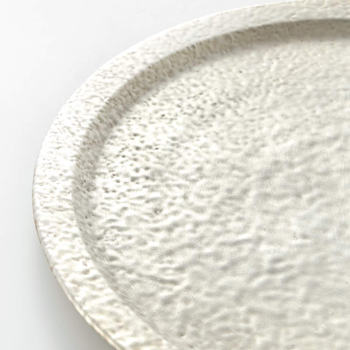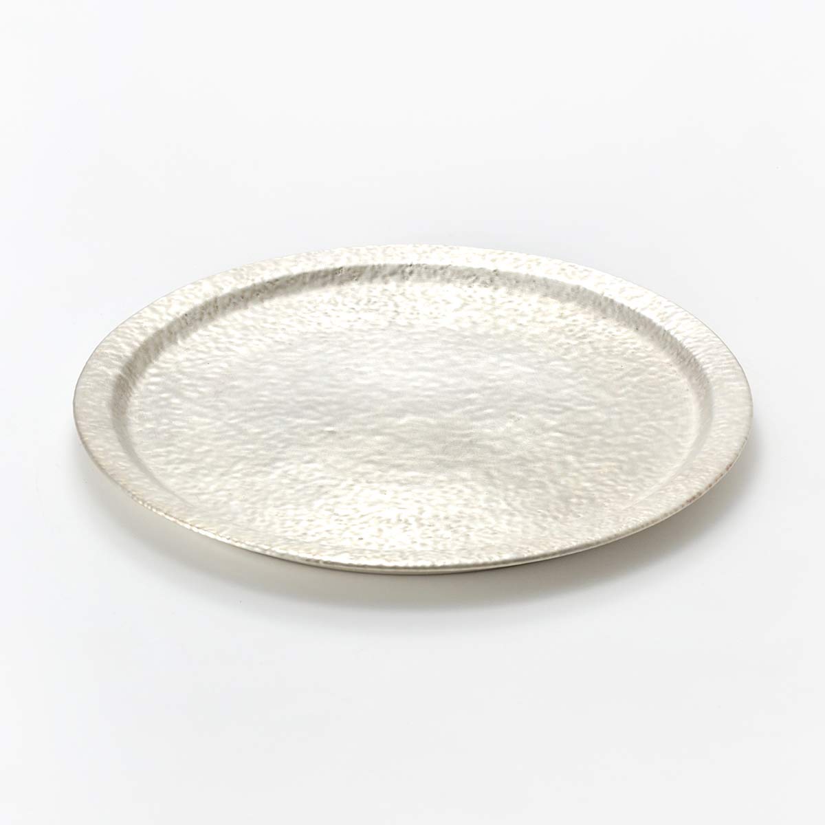 美しい銀彩の9寸リム皿。シンプルでありながら、釉薬で作り出したディテールや丁寧な形づくりなど見ていて飽きない作品です。
