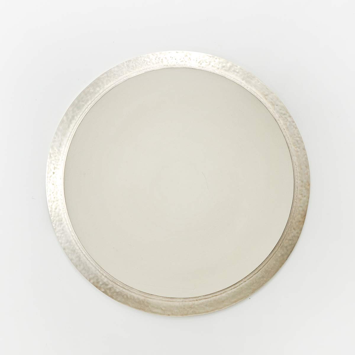 A beautiful silver-plated 9" rim dish. This is a simple, yet fascinating piece with details created by the glaze and careful shaping.
