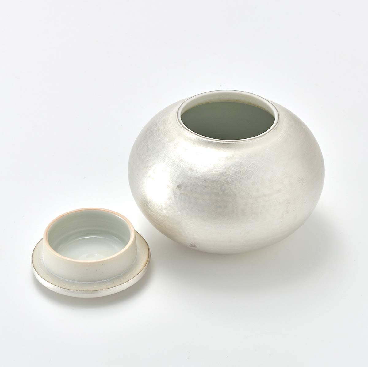 端正な美しい銀彩蓋物です。丁寧な仕事から滲み出る空気感があります。内側には透明釉を施しています。