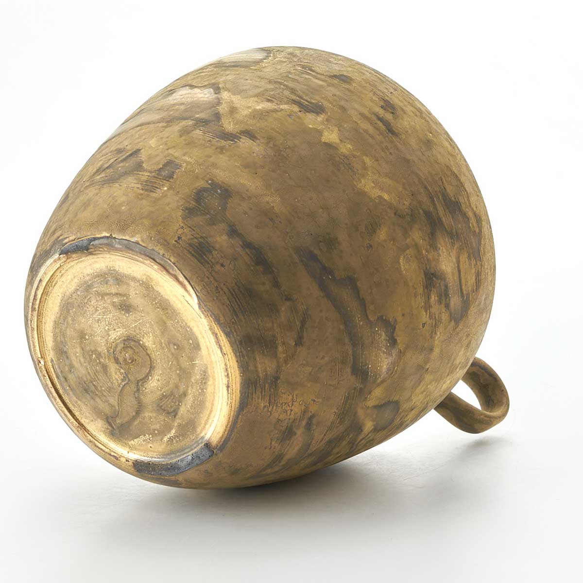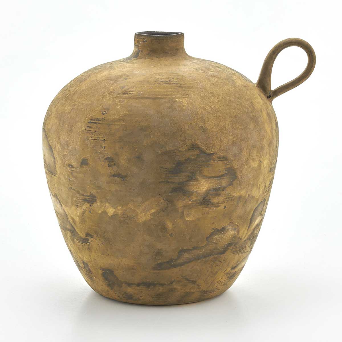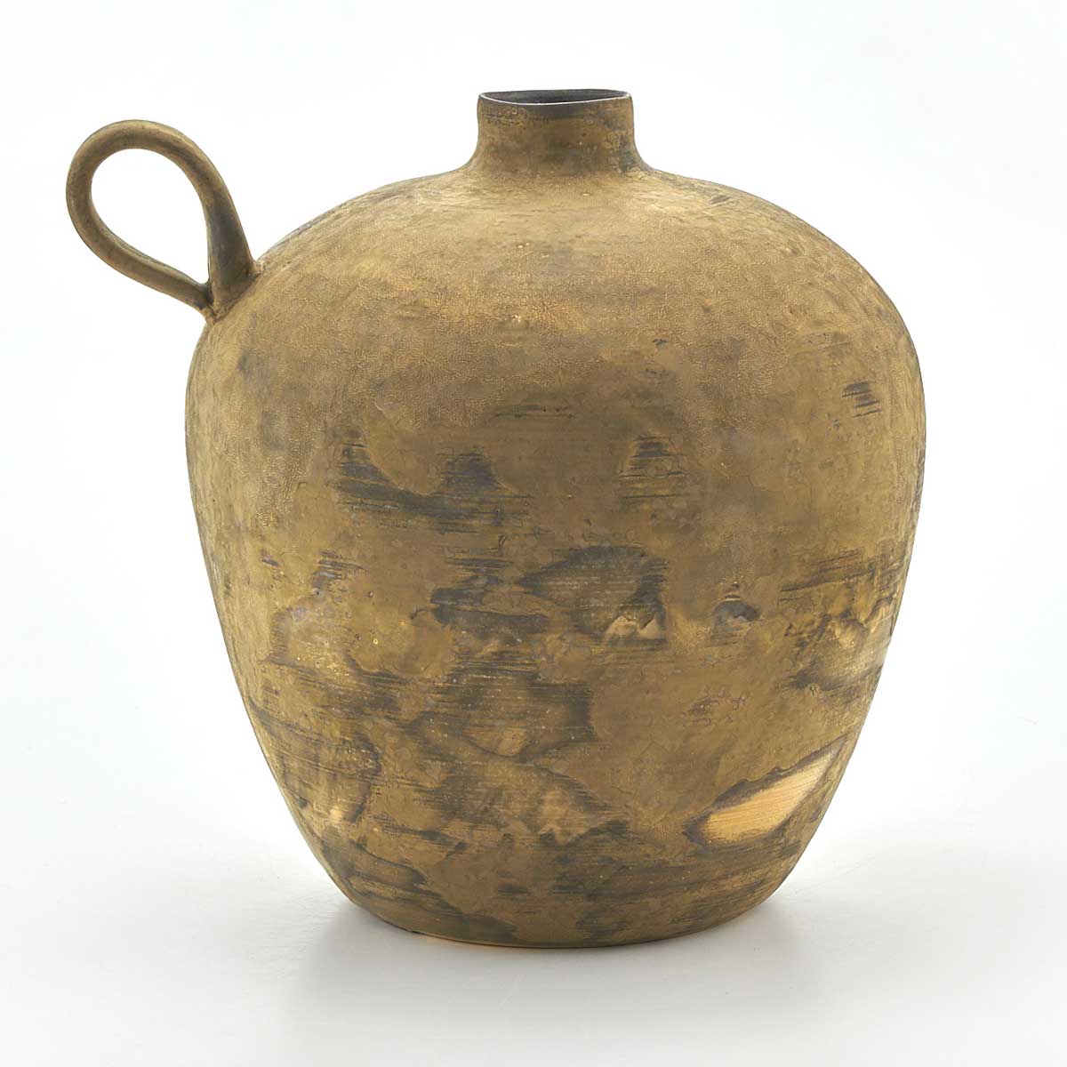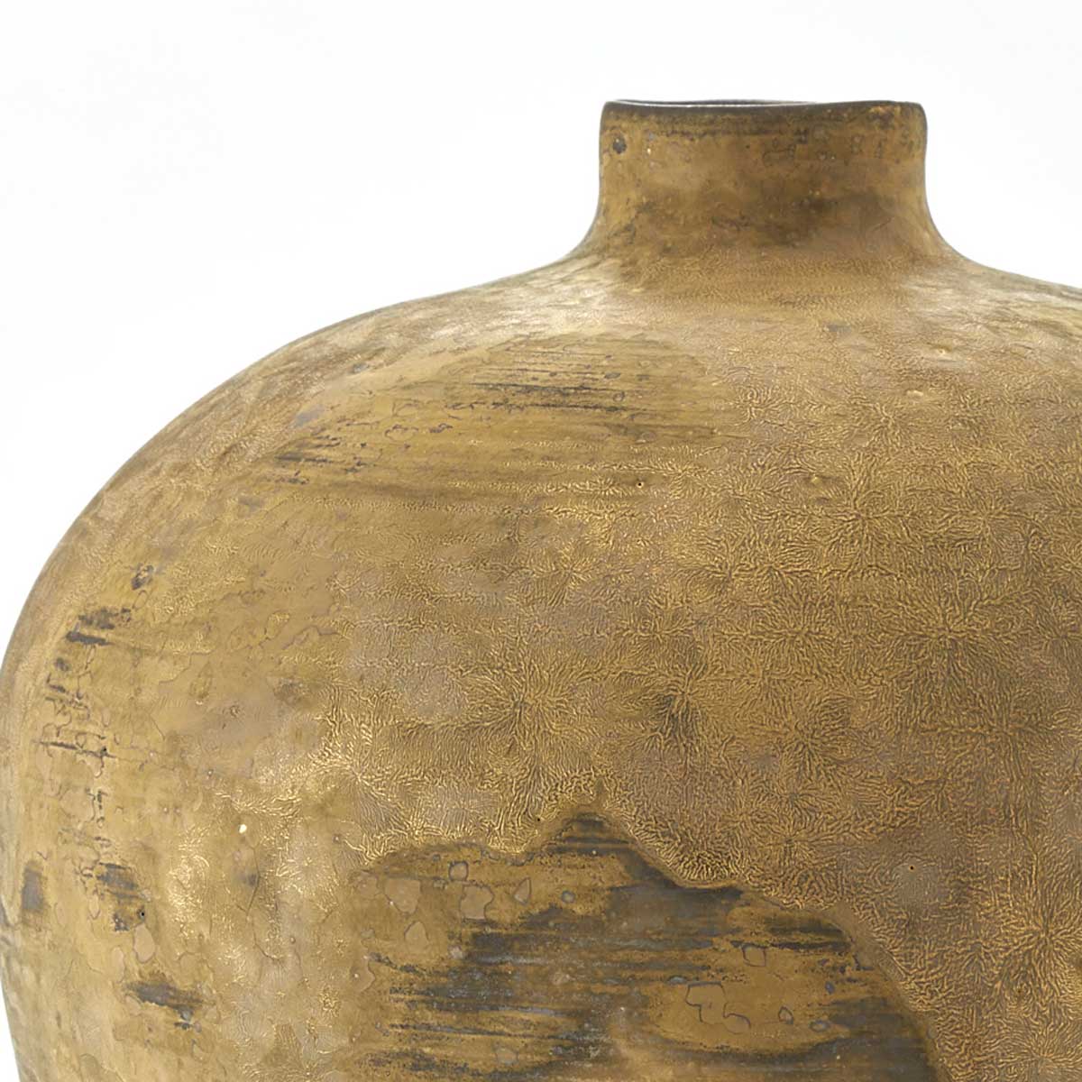 マットな質感の金彩の壺です。さまざまな金彩の質感を楽しめます。小さな口と取手がポイントになっています。