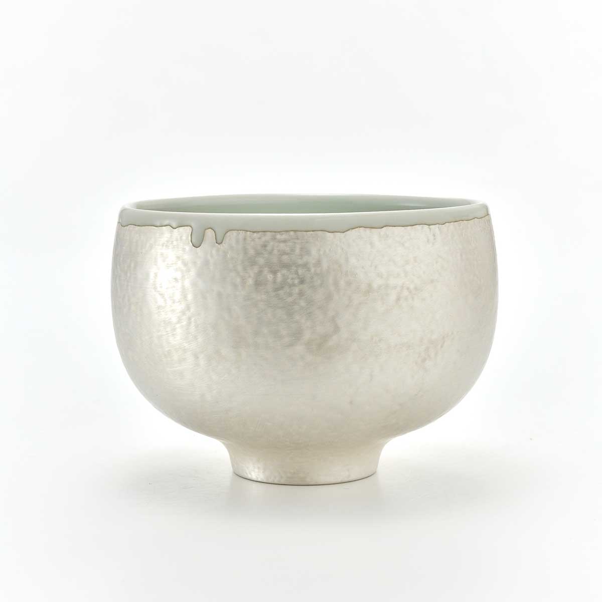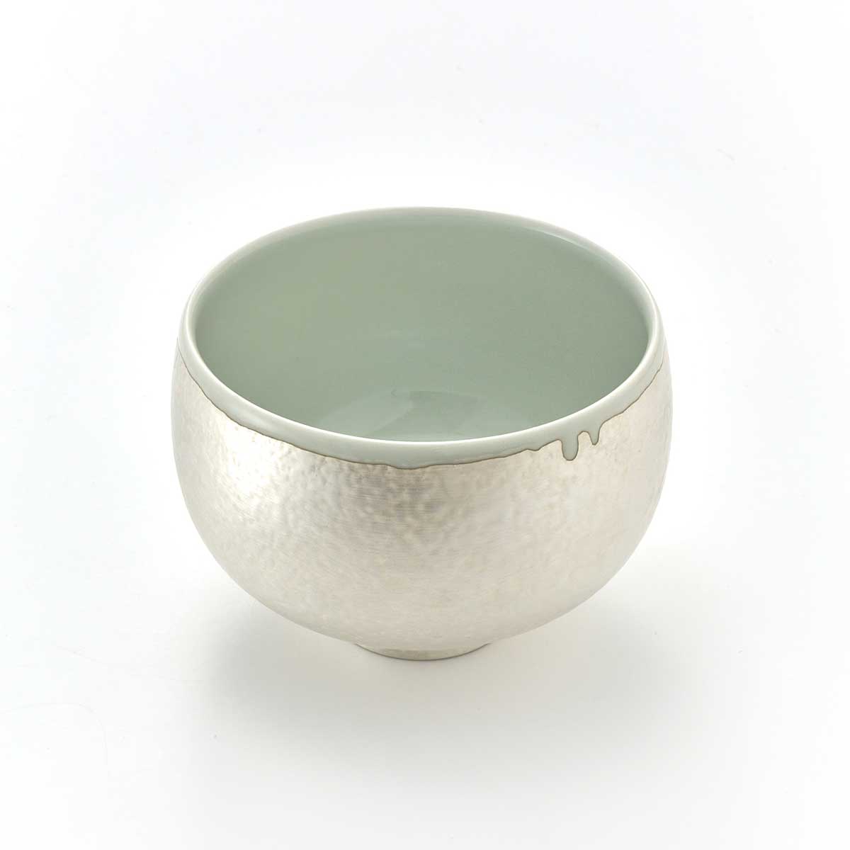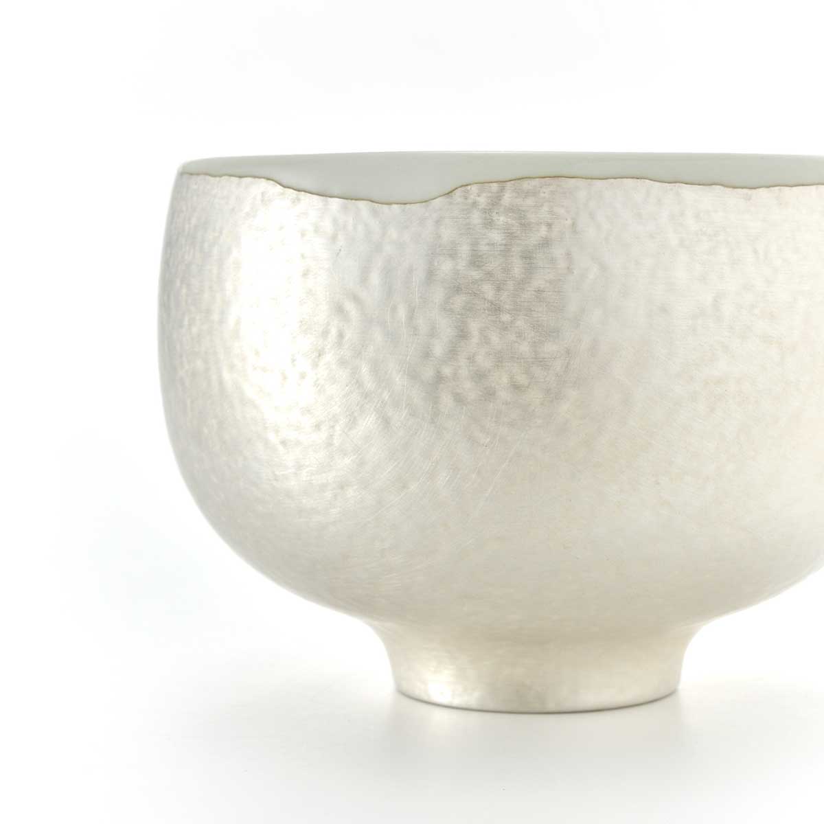 ころんとした形が愛らしい抹茶碗。外側は釉薬でディテールを作った上に銀彩を施しています。内側には透明釉が施されています。