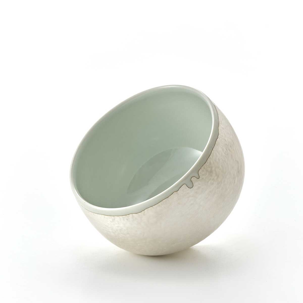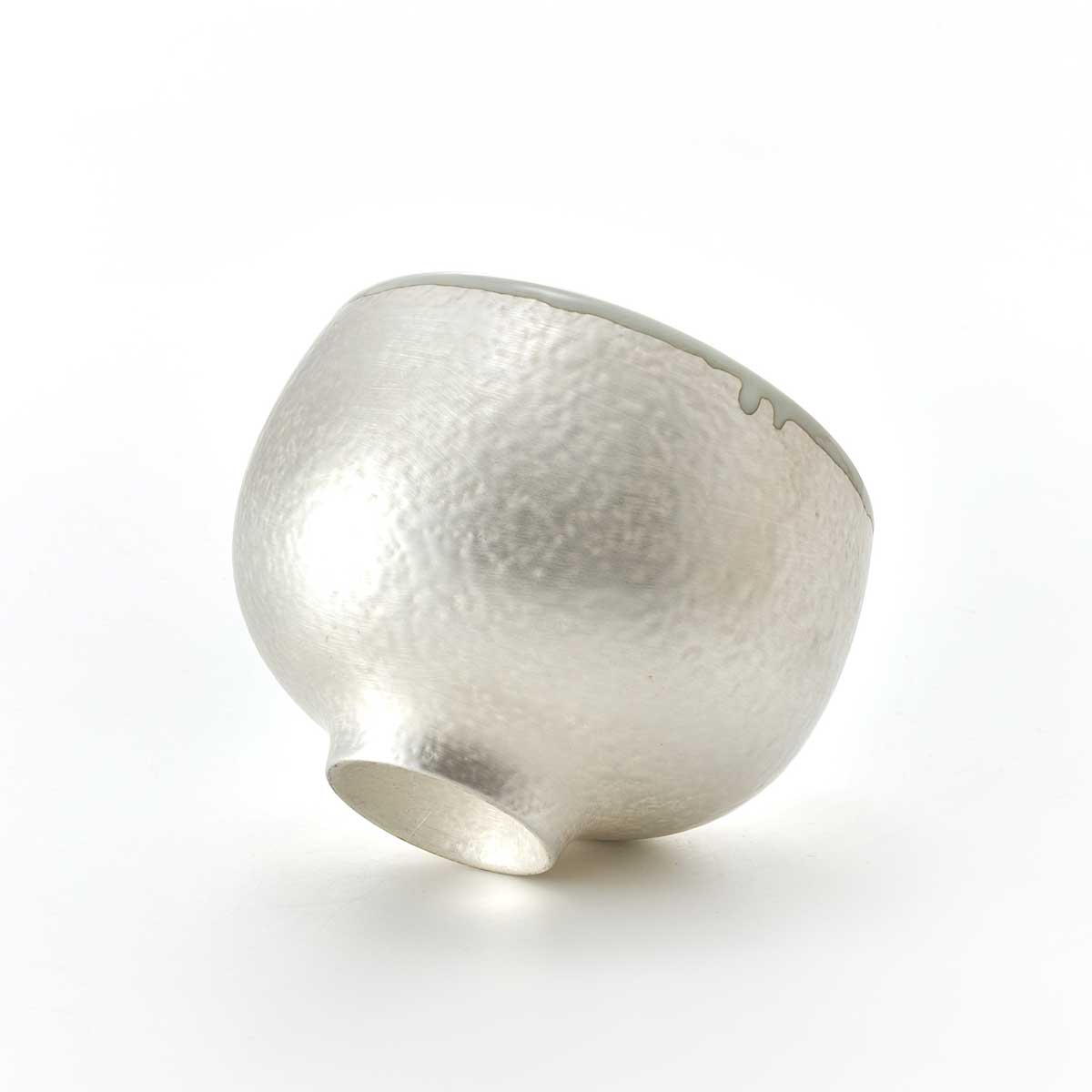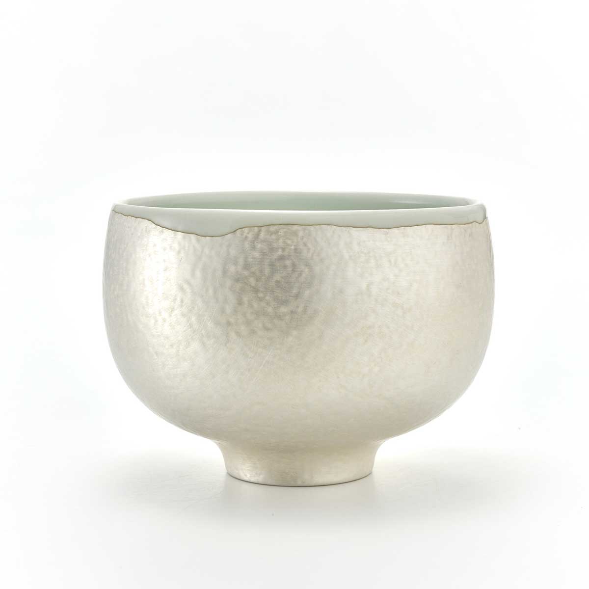 ころんとした形が愛らしい抹茶碗。外側は釉薬でディテールを作った上に銀彩を施しています。内側には透明釉が施されています。