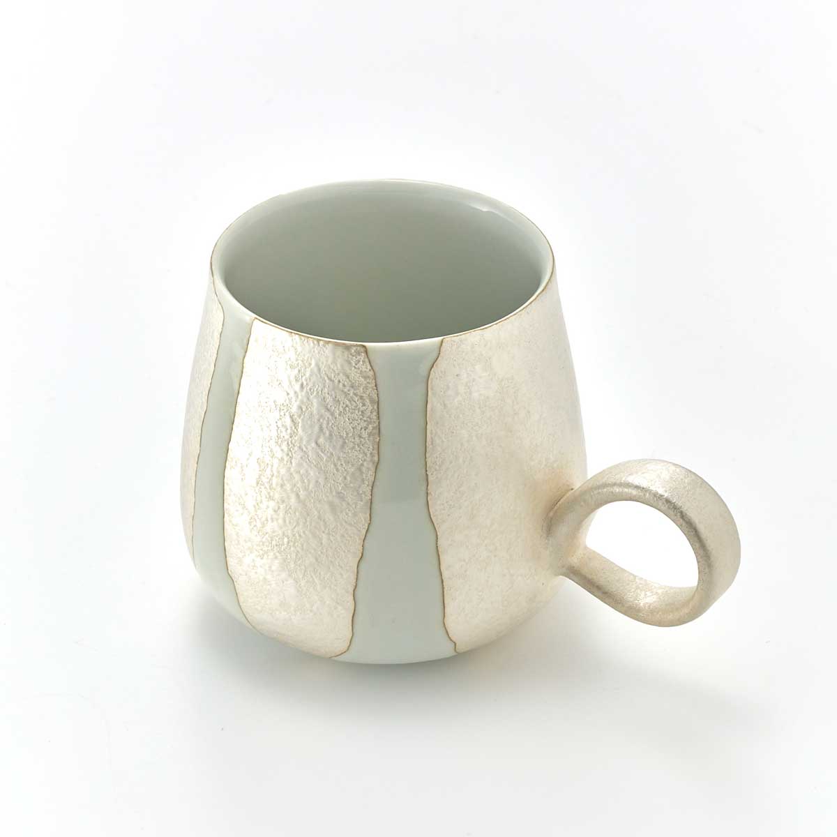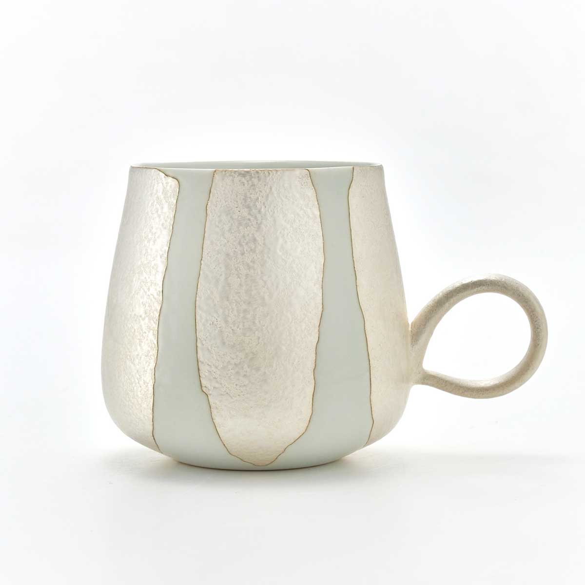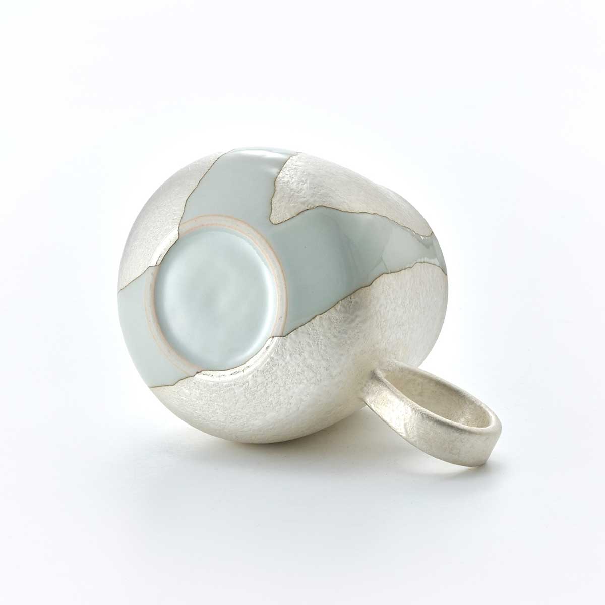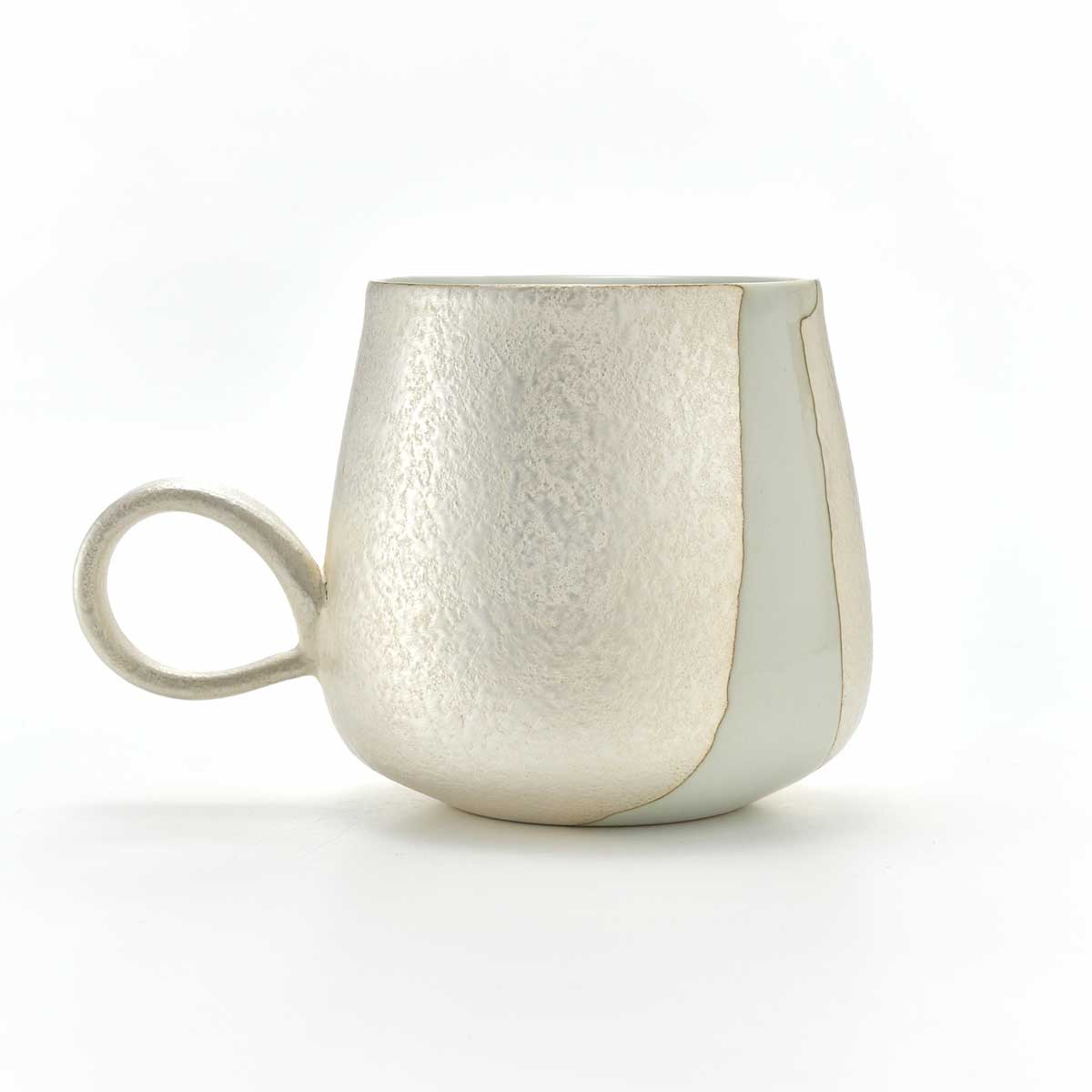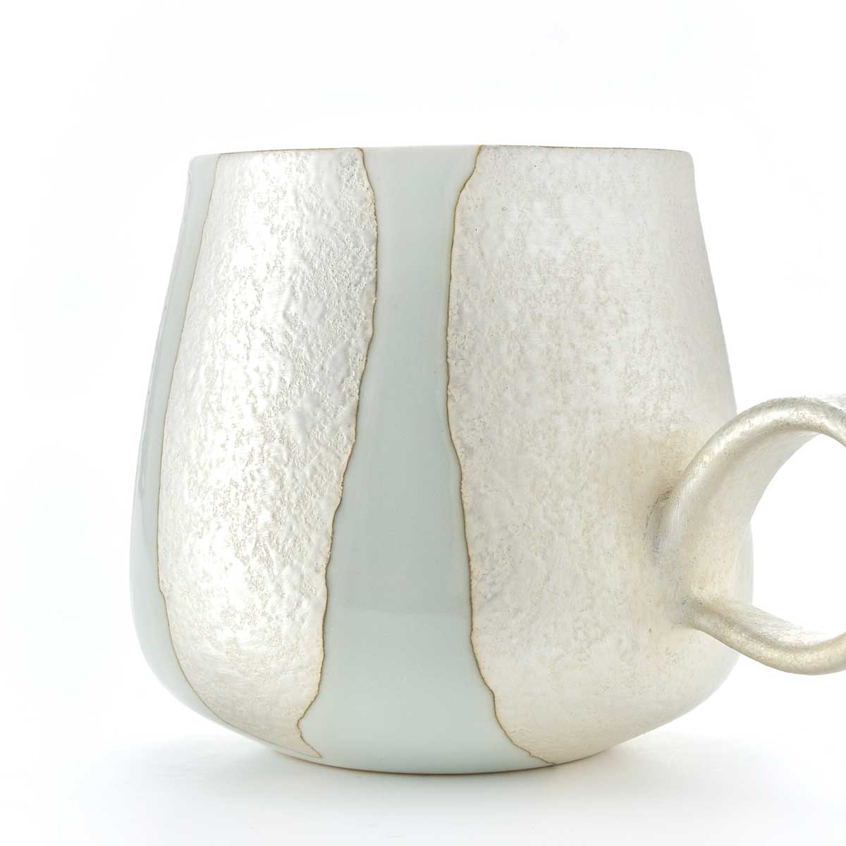 釉薬を流しかけした後に生まれた形に、釉薬を吹き付けディテールを作り銀彩をしています。釉薬と銀彩から生まれる形が面白い湯呑み碗です。