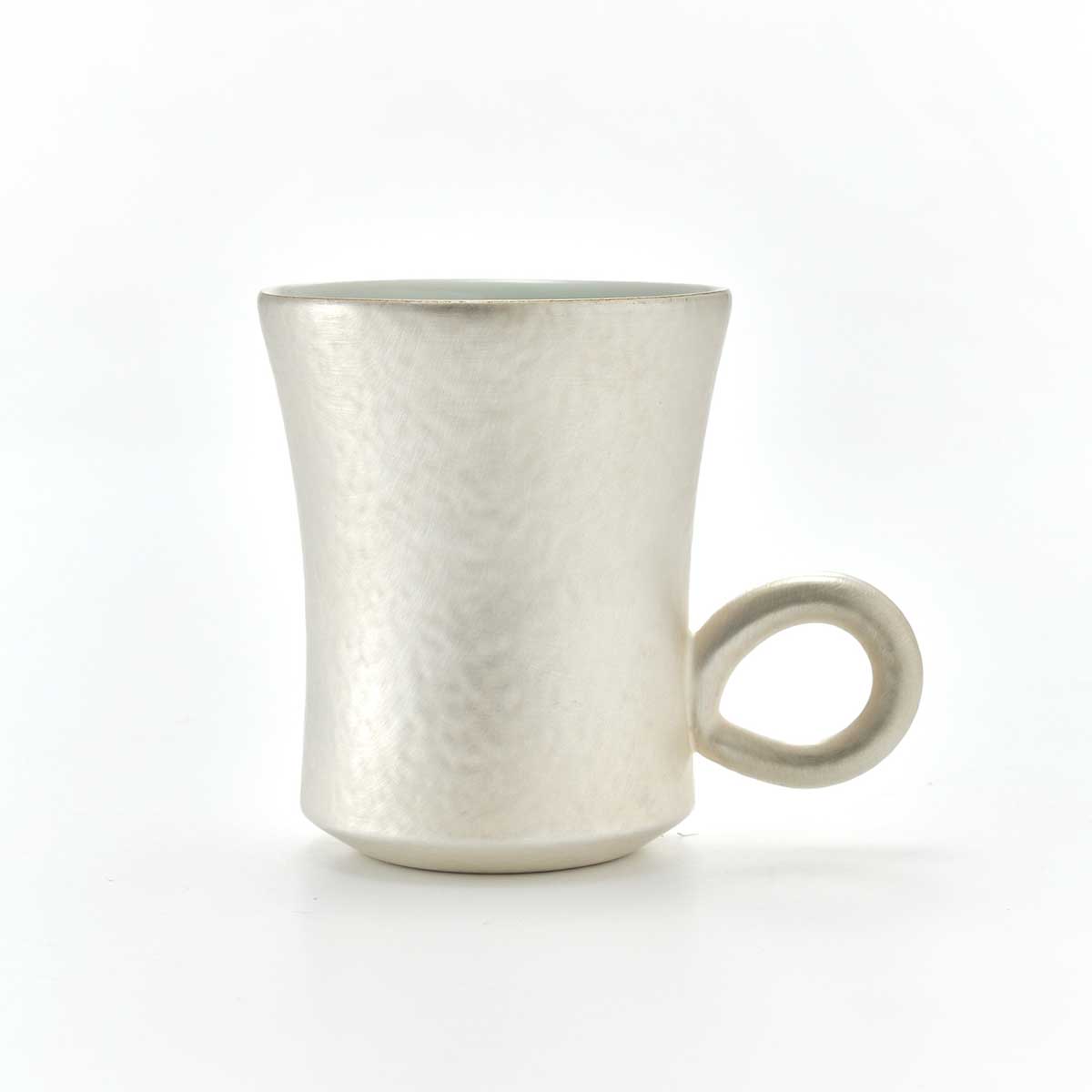 縦長タイプのマグ。丸い取手とのバランスがとても良い作品です。内側には透明釉が施されています。