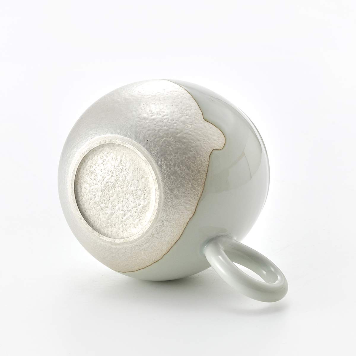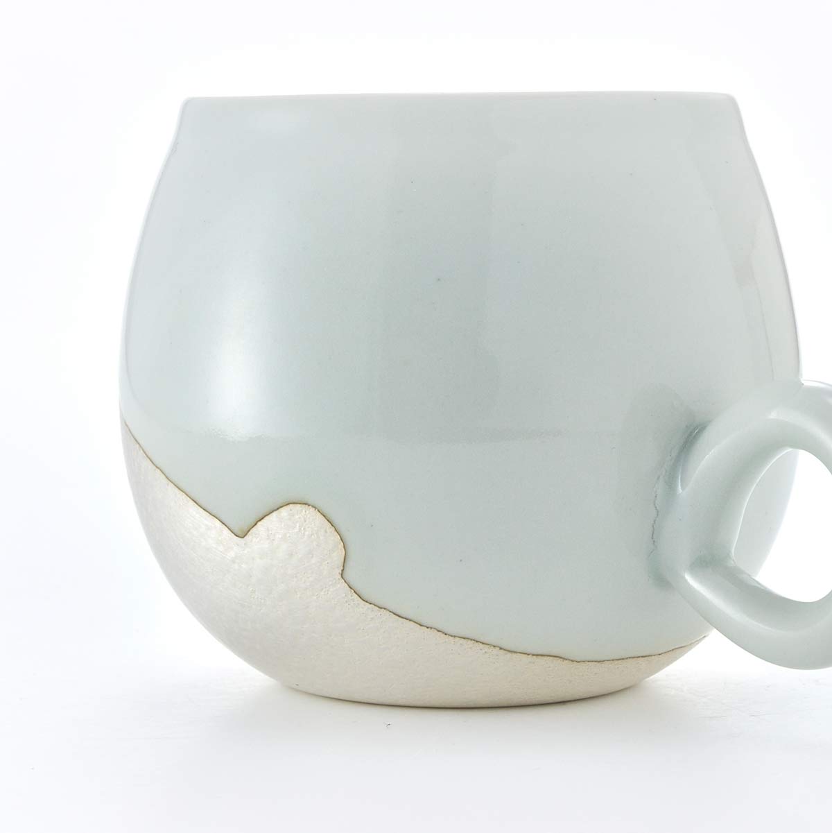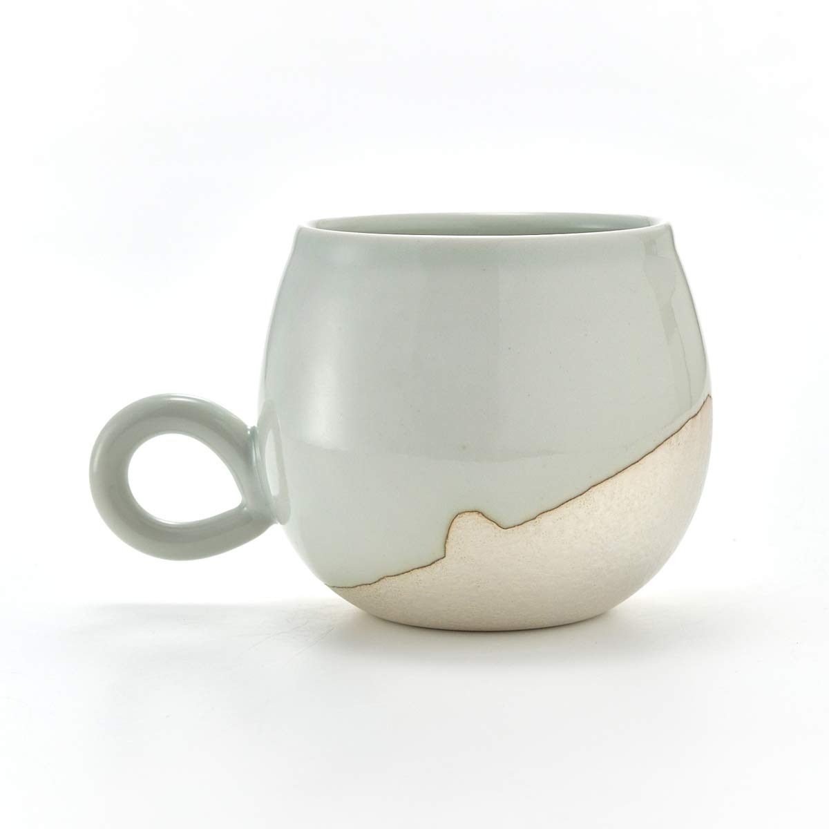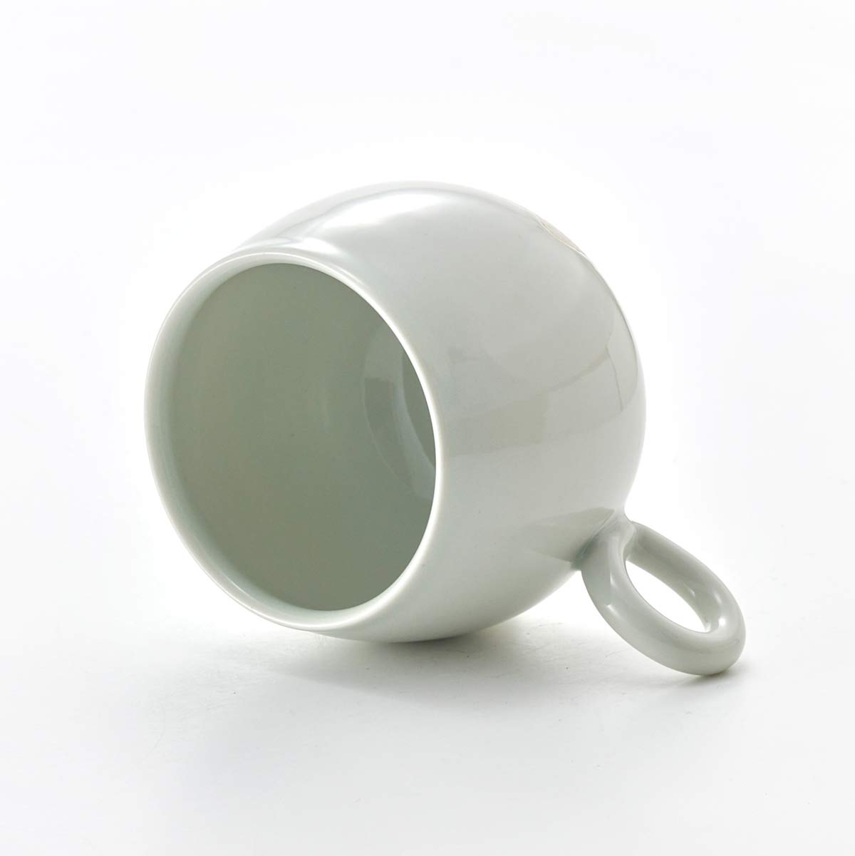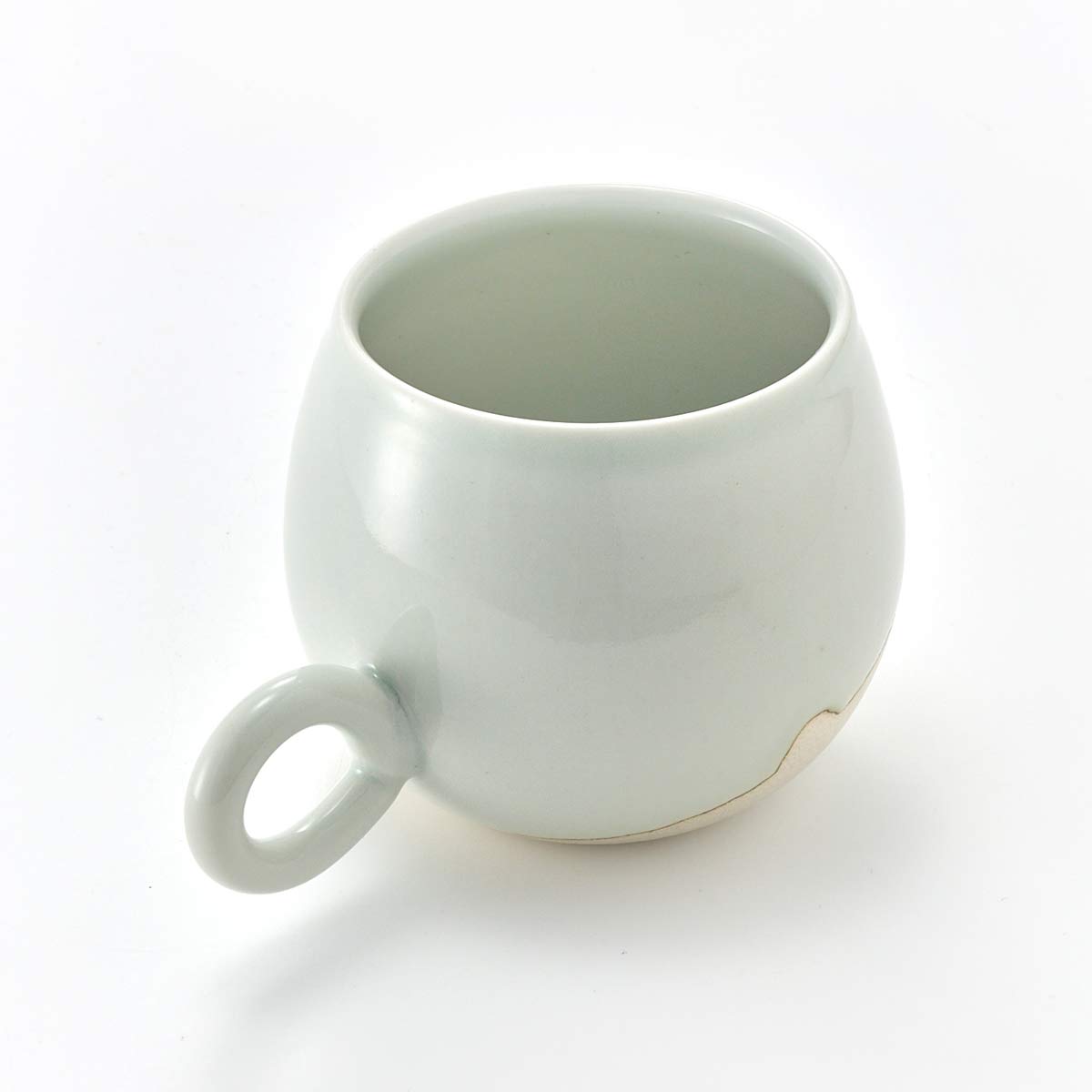 This mug has a rounded form. The inside has a transparent glaze. The shape of the handle is also lovely.