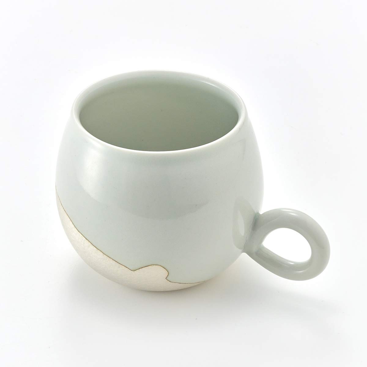 丸みを帯びたフォルムのマグカップ。内側は透明釉を施してあります。。取手の形も愛らしいです。