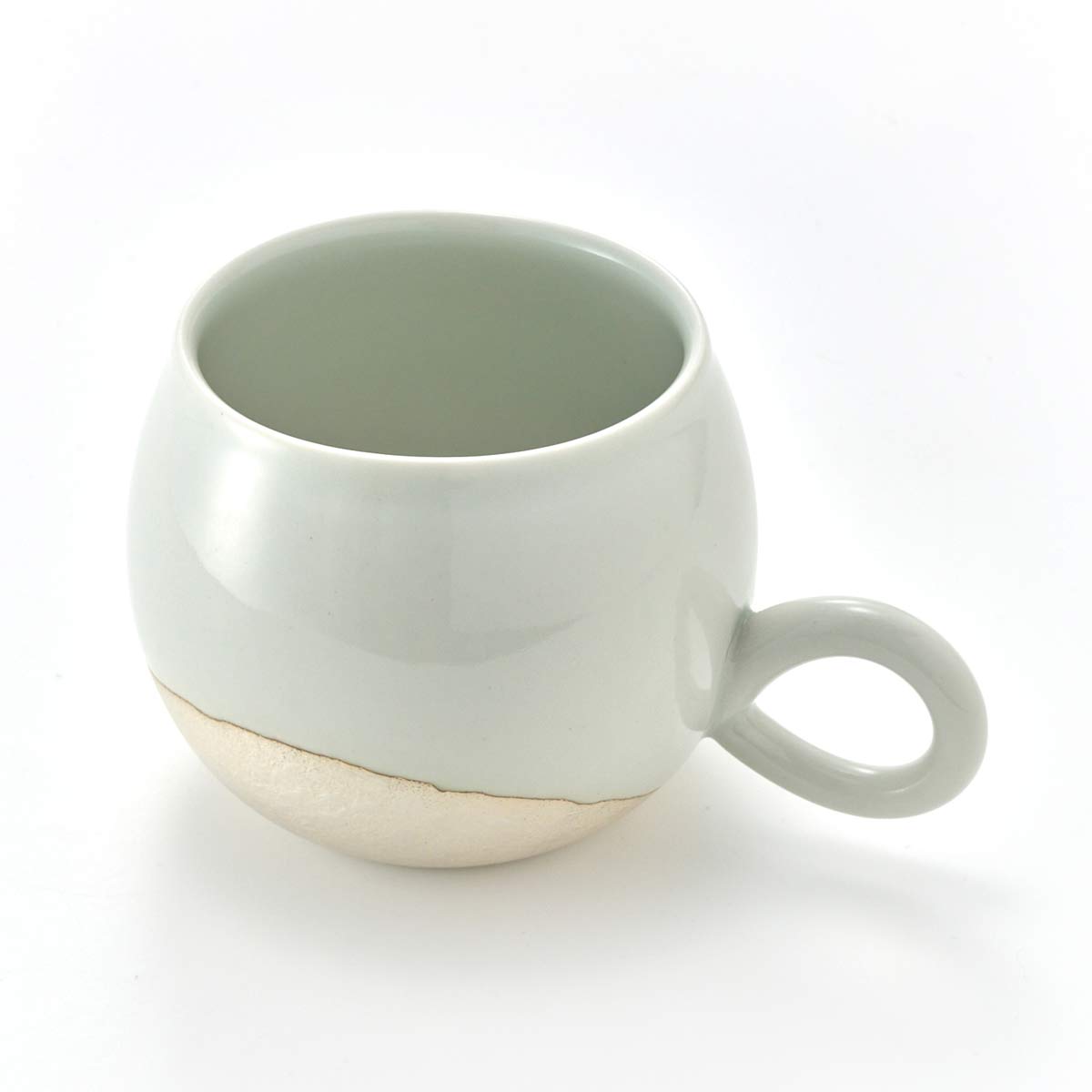 丸みを帯びたフォルムのマグカップ。内側は透明釉を施してあります。。取手の形も愛らしいです。