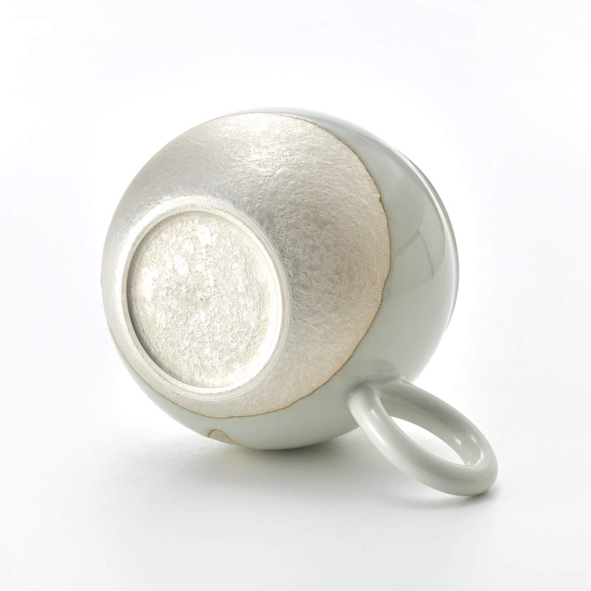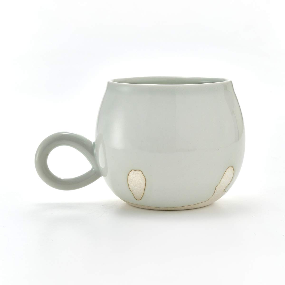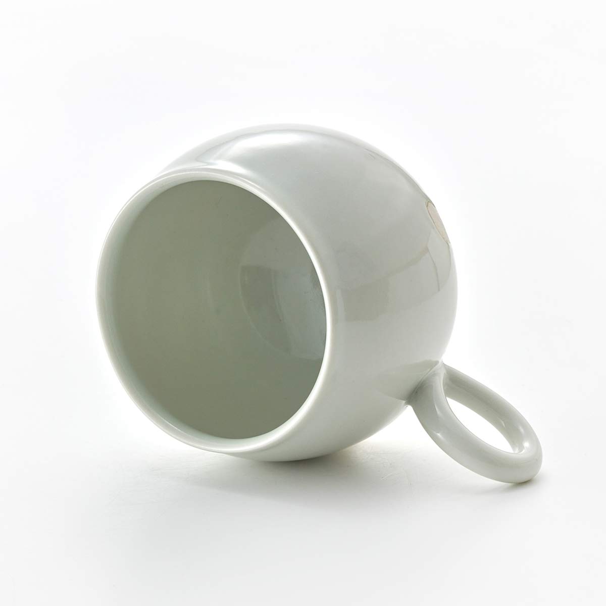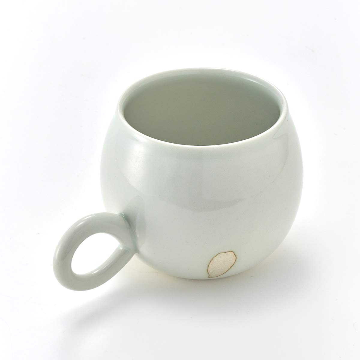This mug has a rounded form. The inside has a transparent glaze. The shape of the handle is also lovely.