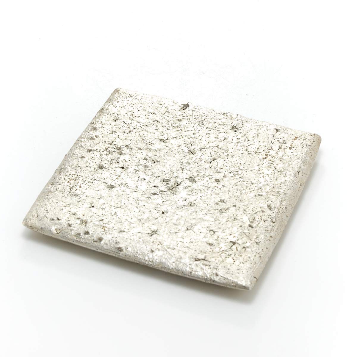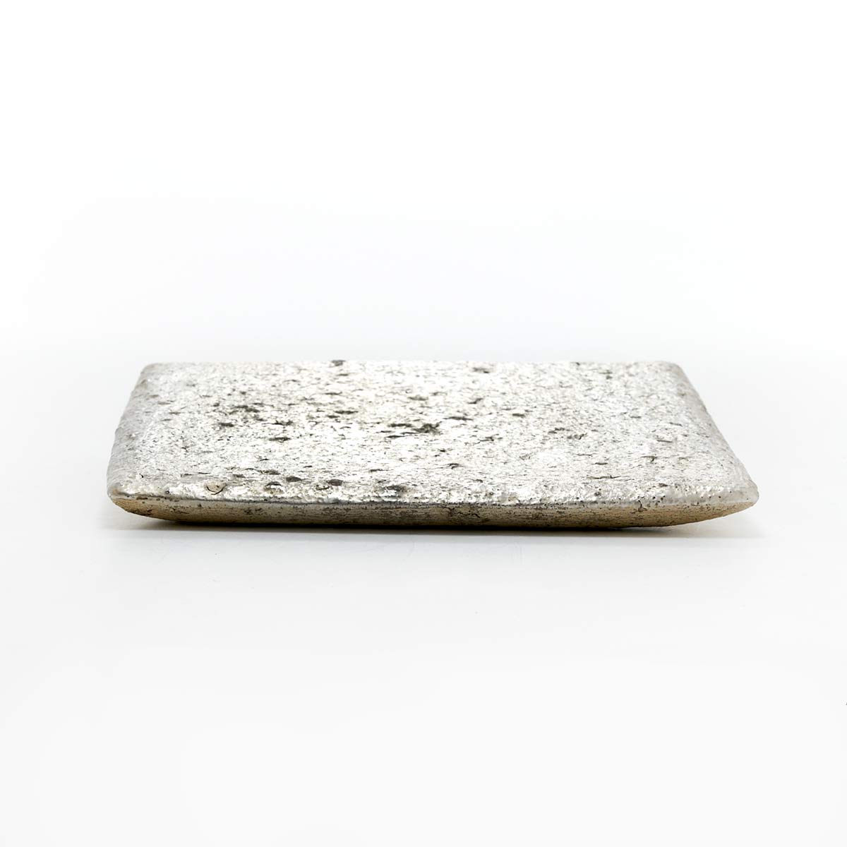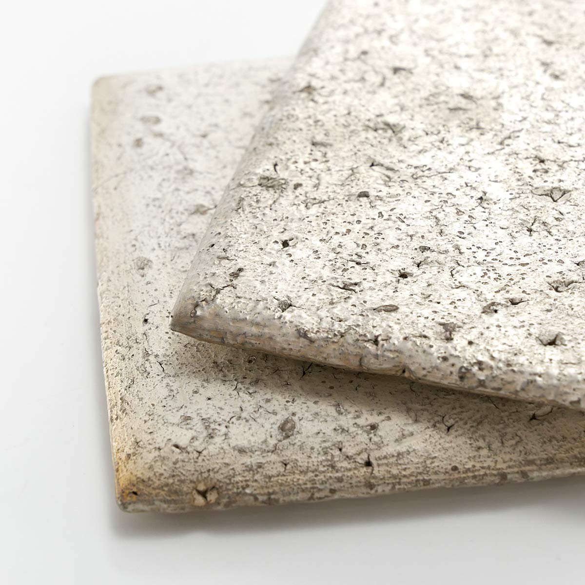 信楽の粗い土の魅力を生かした銀彩板皿です。素焼き後、土に含まれた珪長石(石ハゼ)を丁寧に取りき、表面には釉薬を掛け、裏面は無釉薬で本焼きします。最後に両面に銀彩を施しています。釉薬を掛けた面と無釉薬の面では、銀彩の酸化の雰囲気が変わるため、両面をお楽しみいただけます。