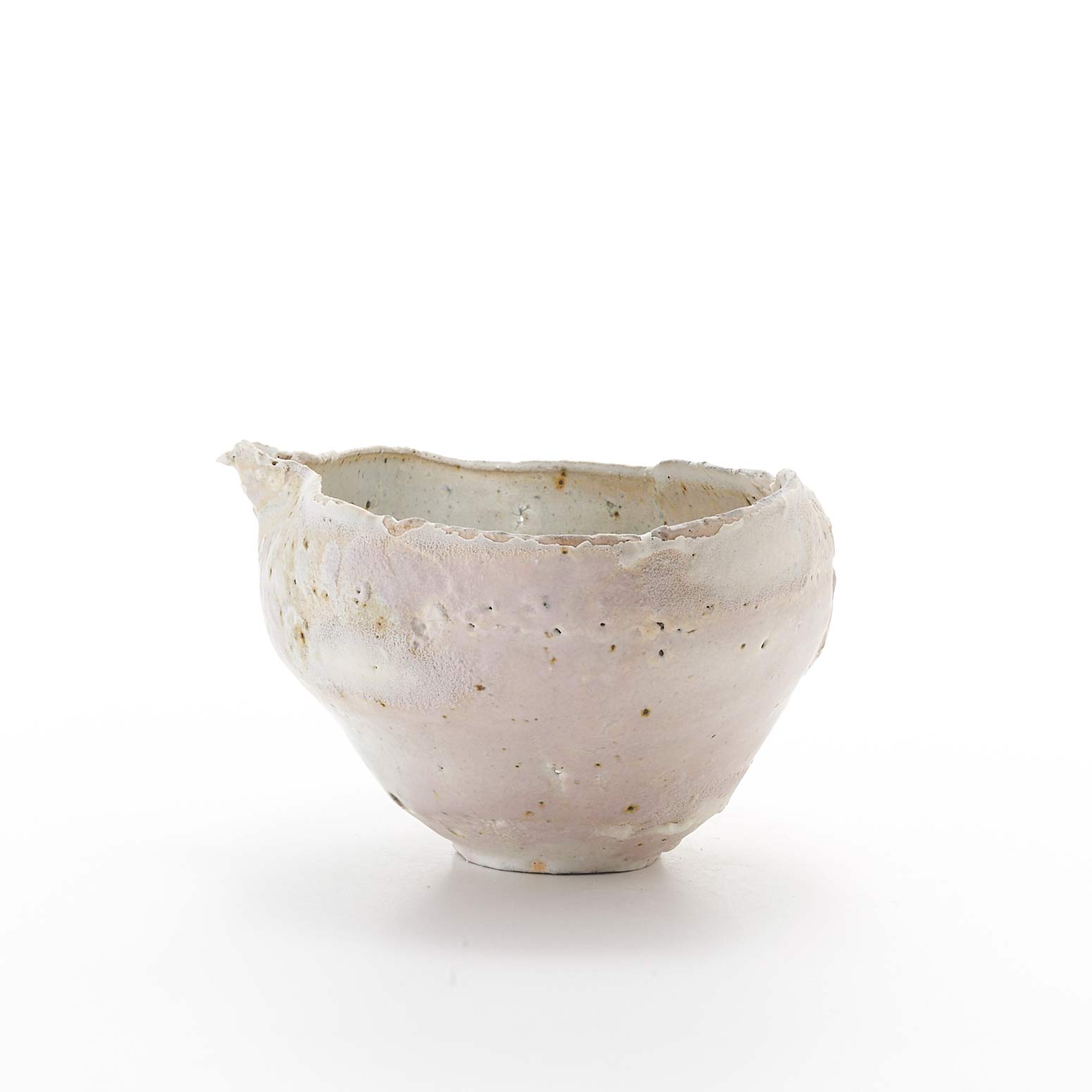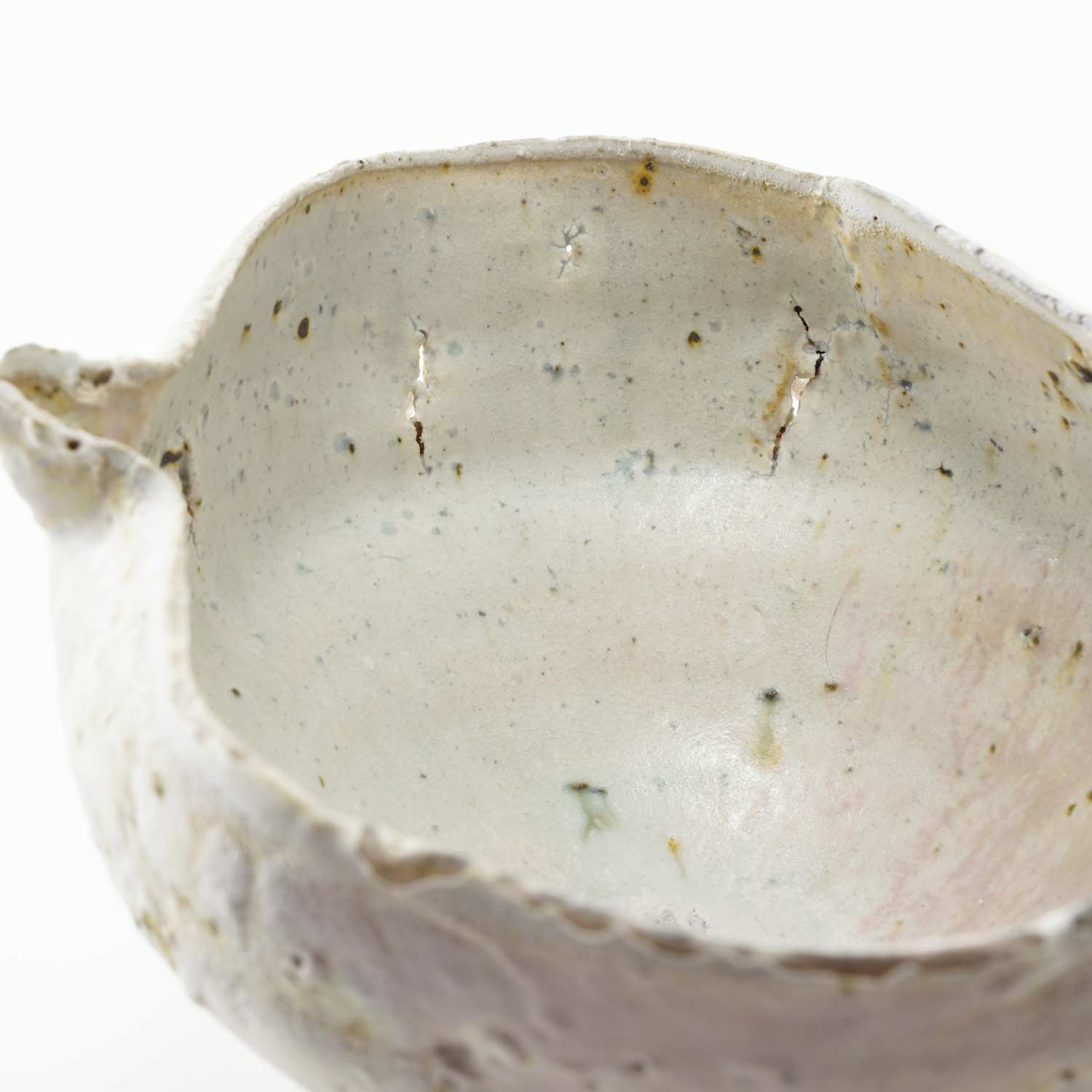 薪窯焼成だからこそ生まれた、ピンク、ブルー、白のグラデーションがとても美しい片口です。焼成途中で破れてしまっているため、器として使用できませんがオブジェとしておすすめです。