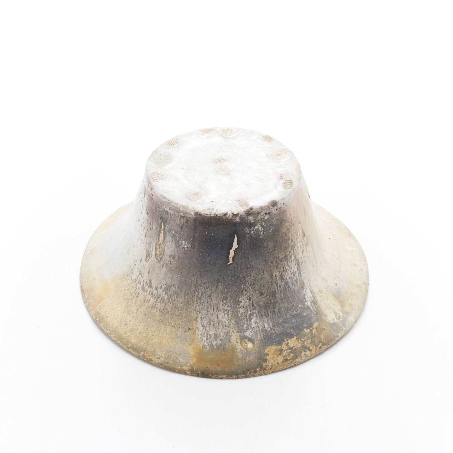 帽子のような形の深鉢です。薪窯焼成ならではの景色が楽しめます。縁の欠けを銀継ぎで修正しています。