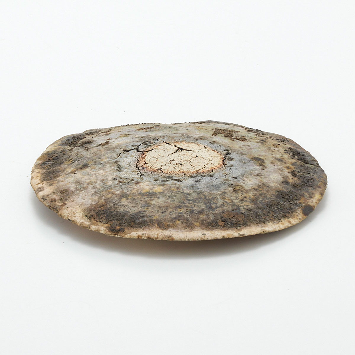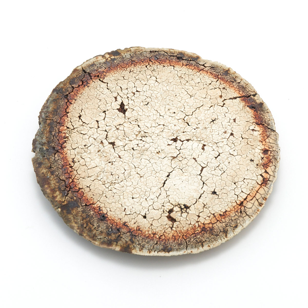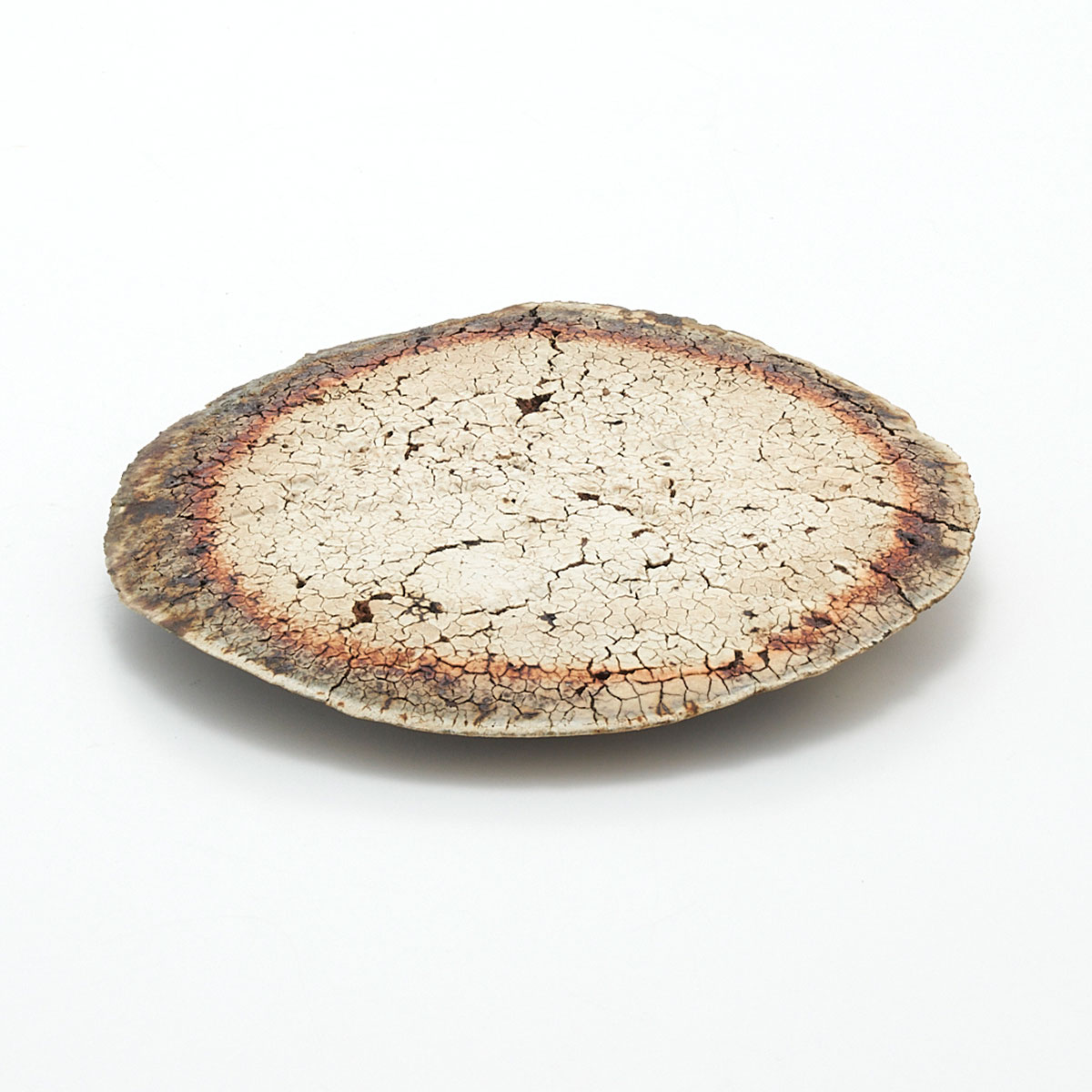 ドライな白が基調でヒビの入り方が美しいプレート。原土の魅力を引き出した作品です。飾り皿としてお楽しみください。