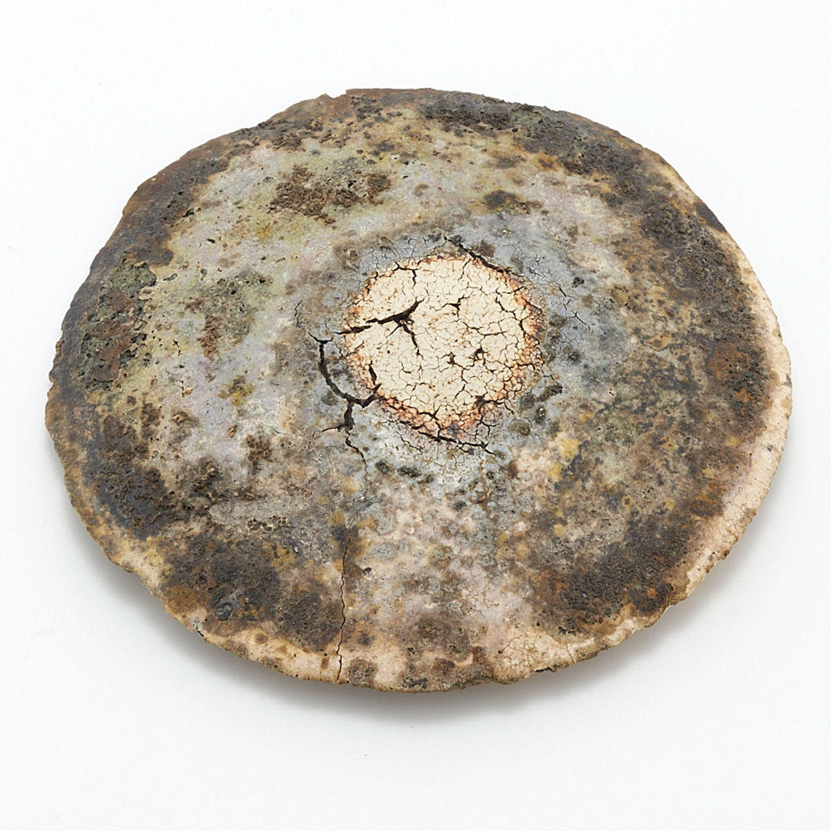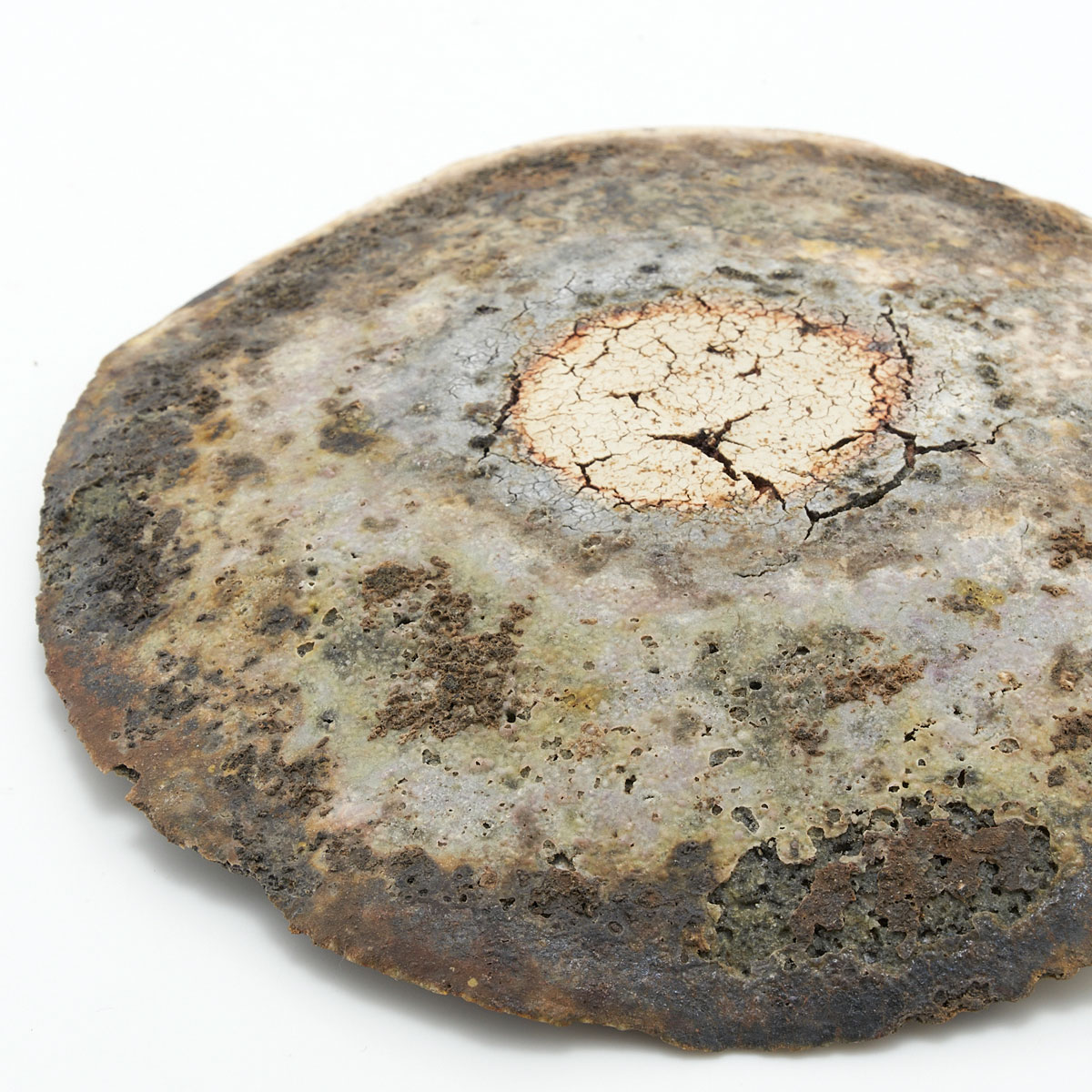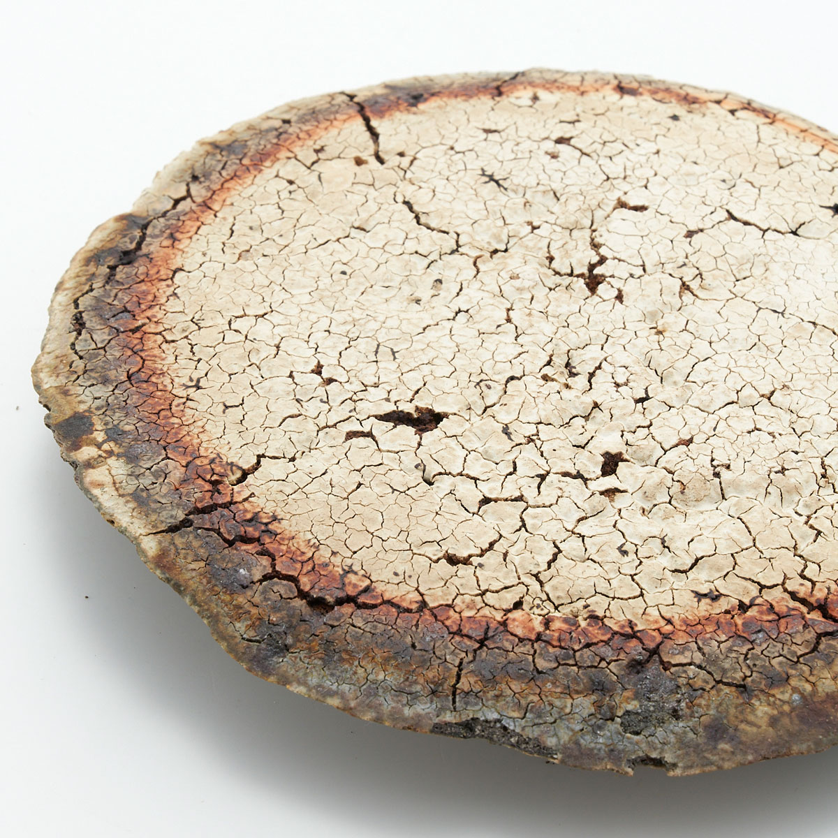 ドライな白が基調でヒビの入り方が美しいプレート。原土の魅力を引き出した作品です。飾り皿としてお楽しみください。