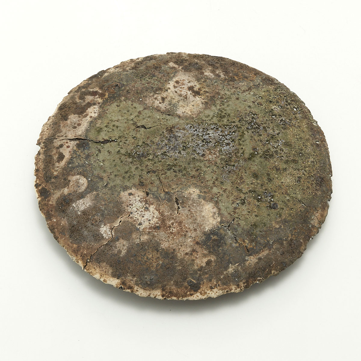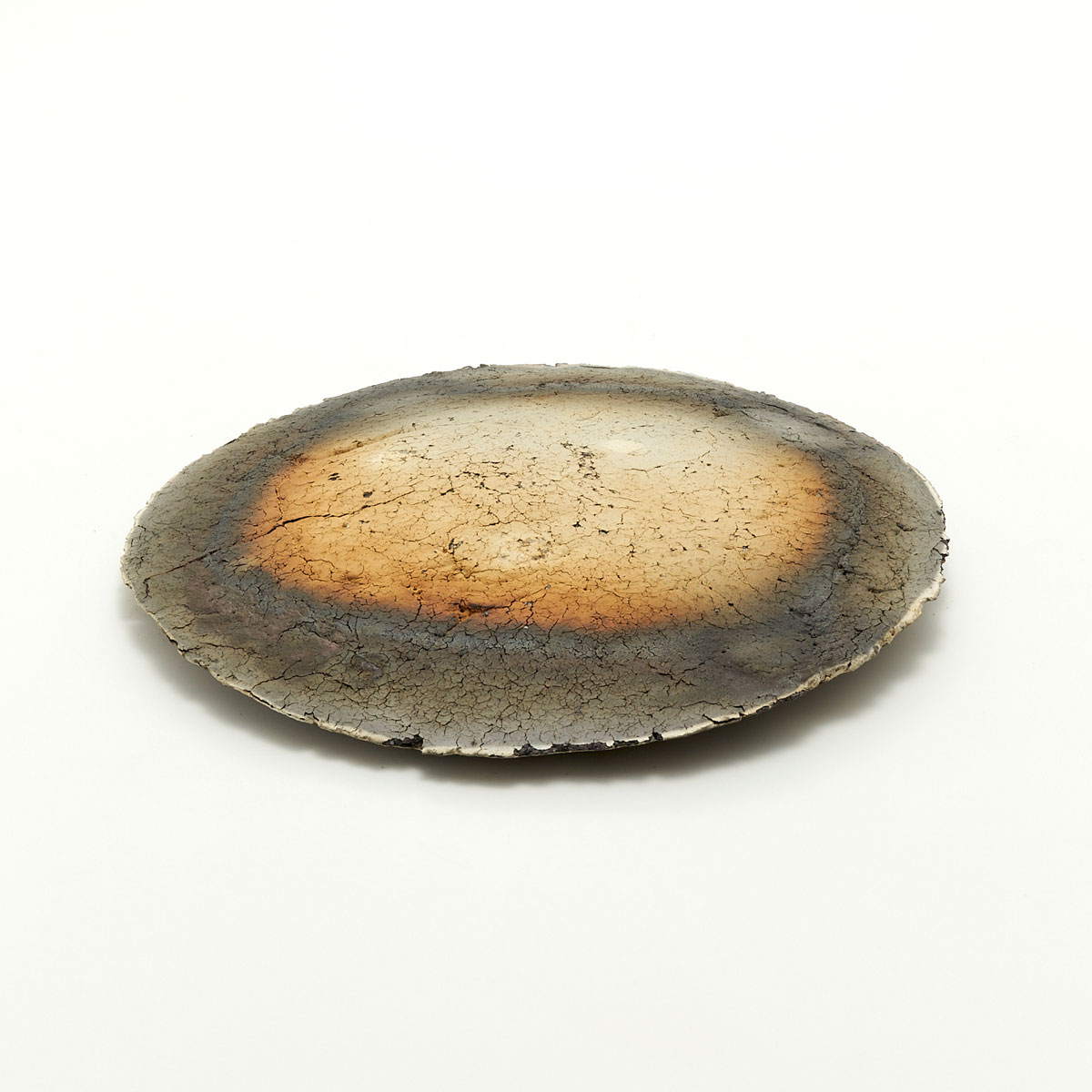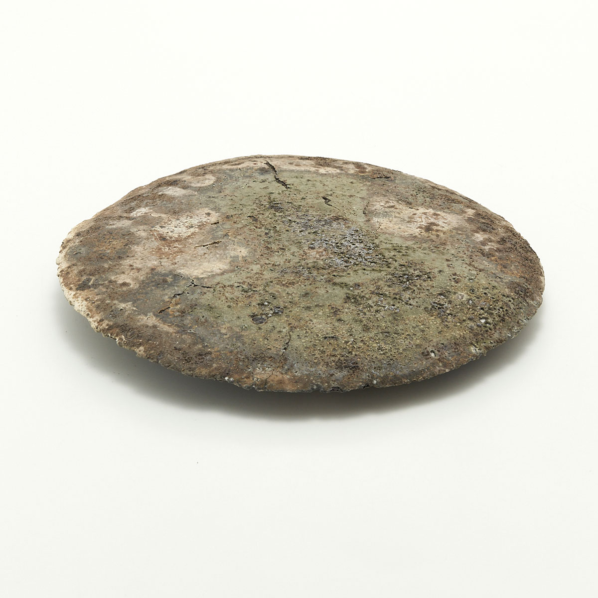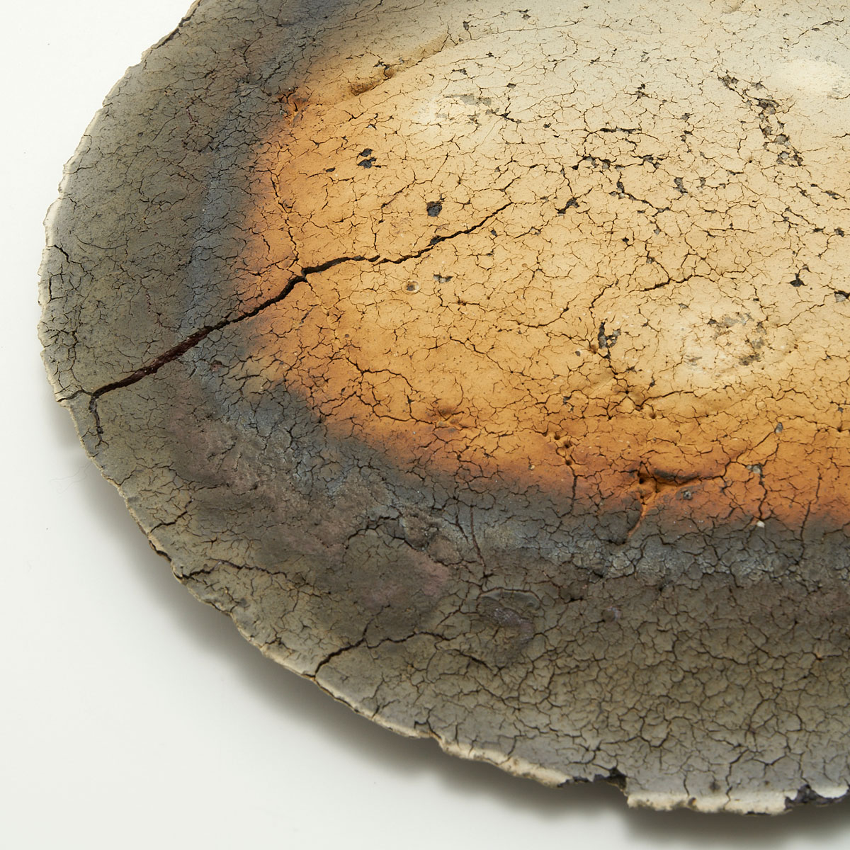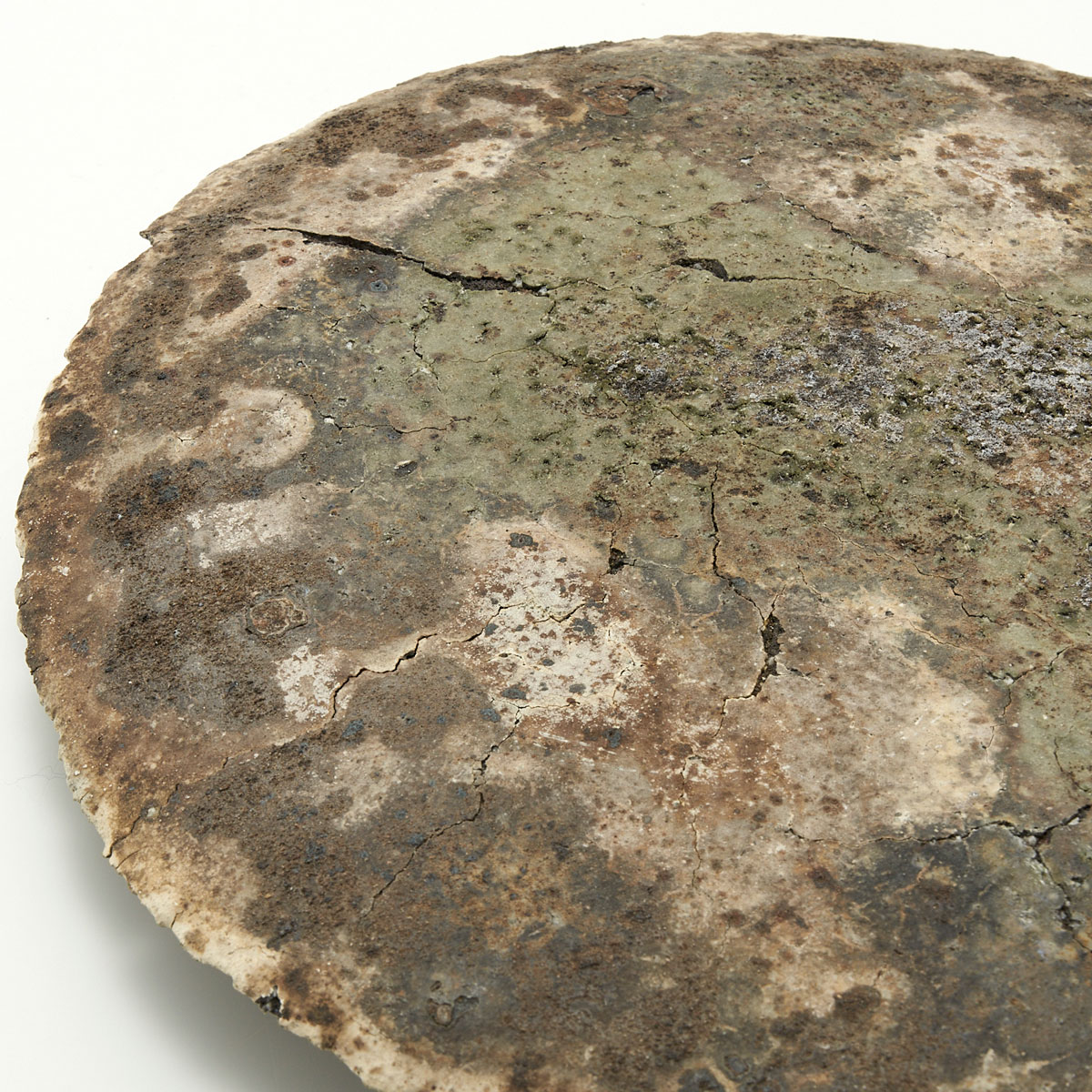 苔が生えたようなディテールと、シャープな縁が魅力的なプレート。原土の魅力を引き出した作品です。飾り皿としてお楽しみください。裏面も面白い景色になっています。