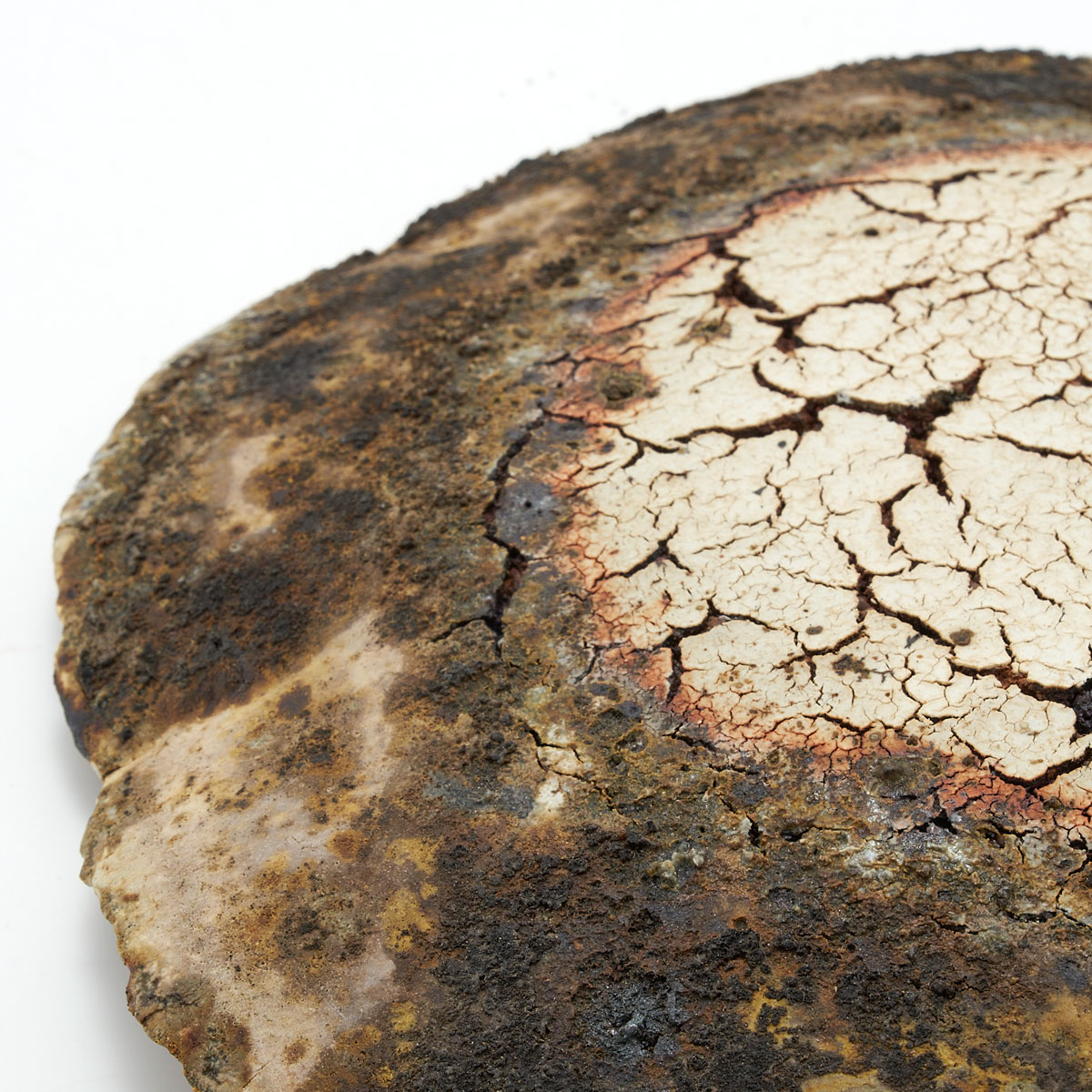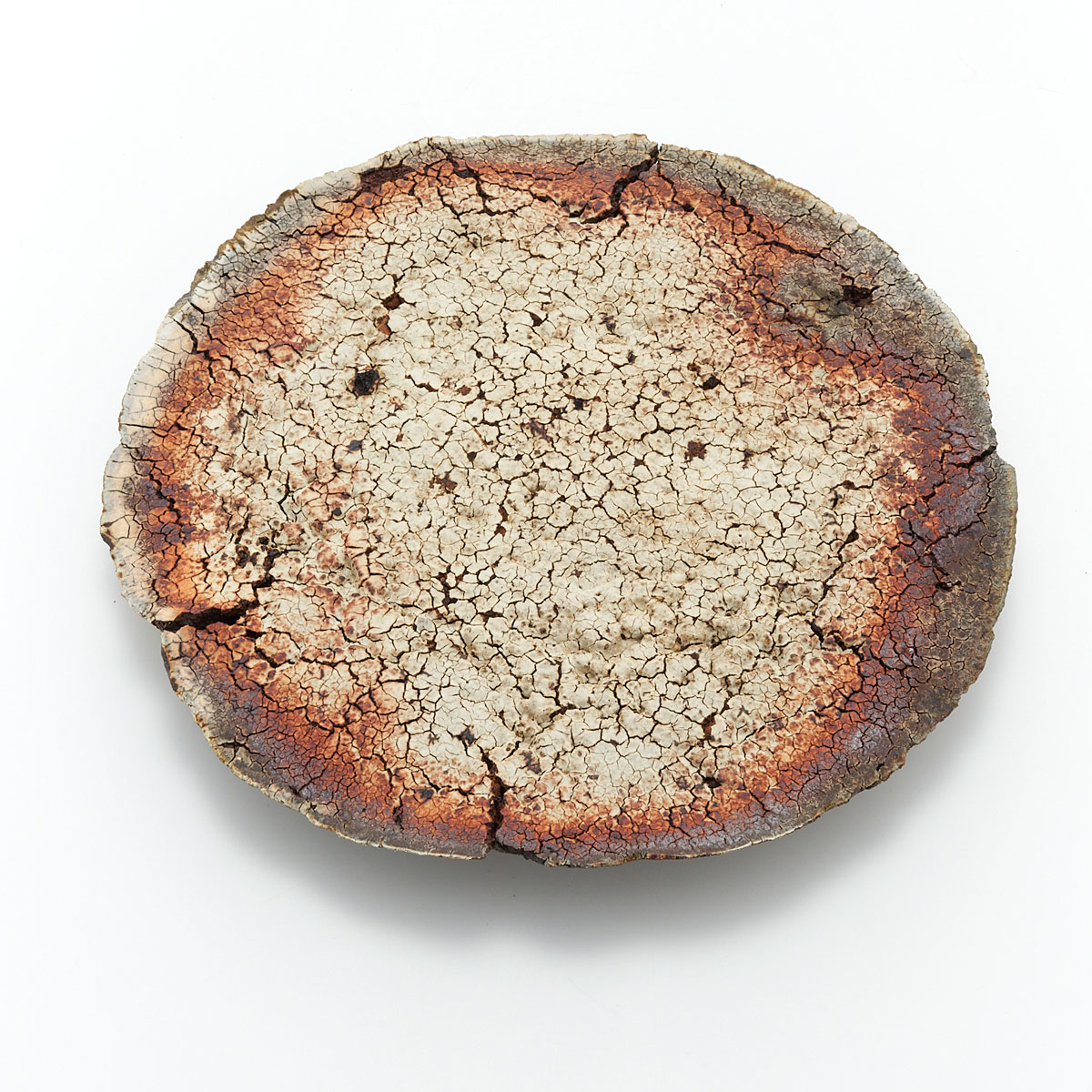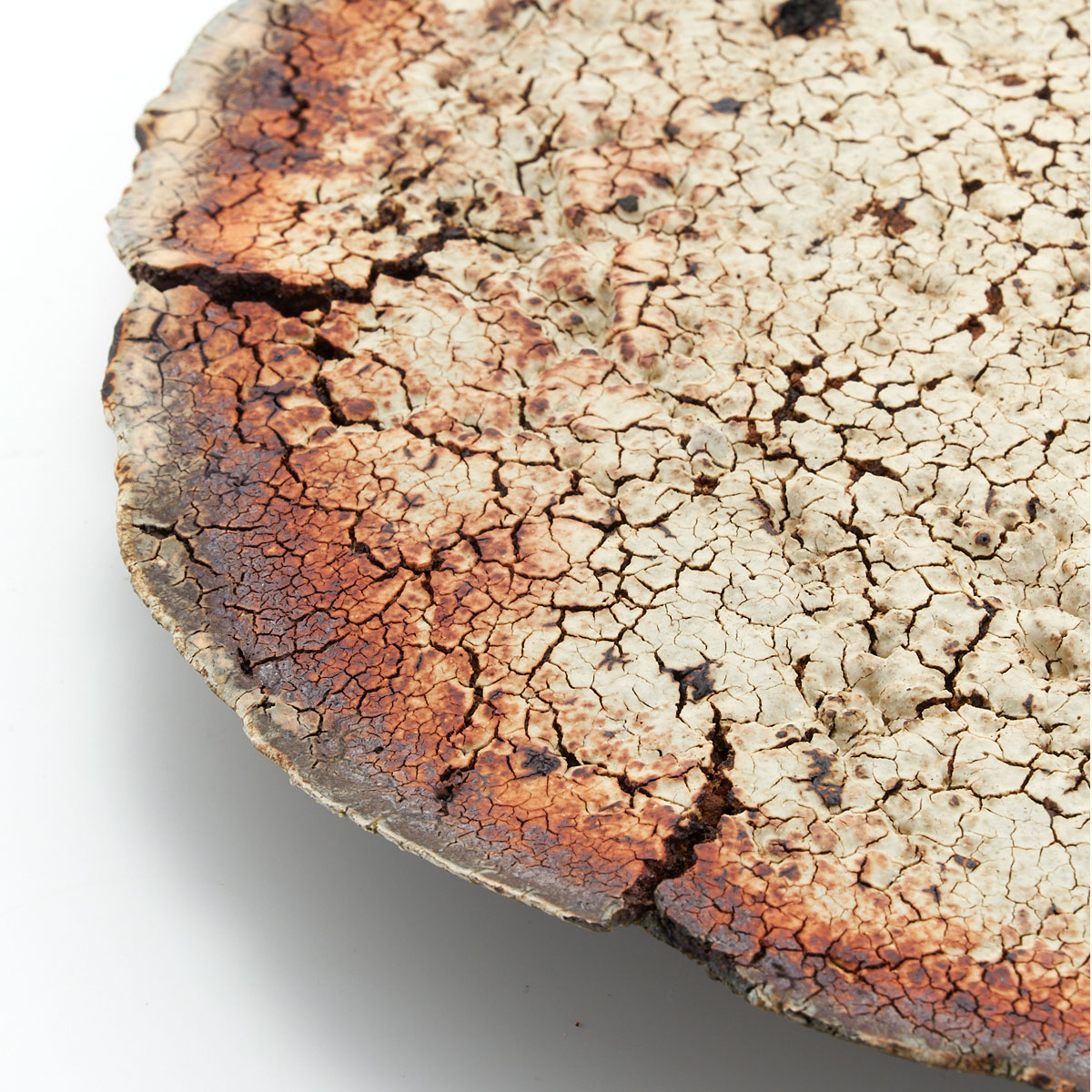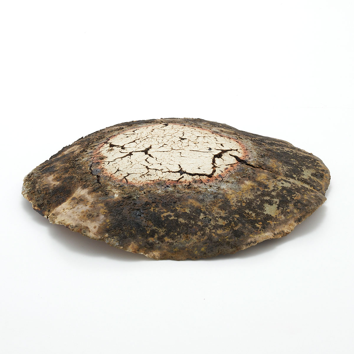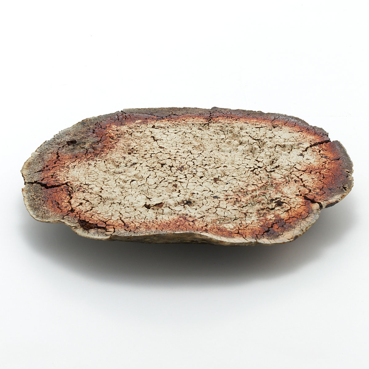 ドライな質感と荒々しいディテール、ゆらぎのある縁が魅力的。原土の魅力を引き出した作品です。飾り皿としてお楽しみください。裏面も面白い景色になっています。