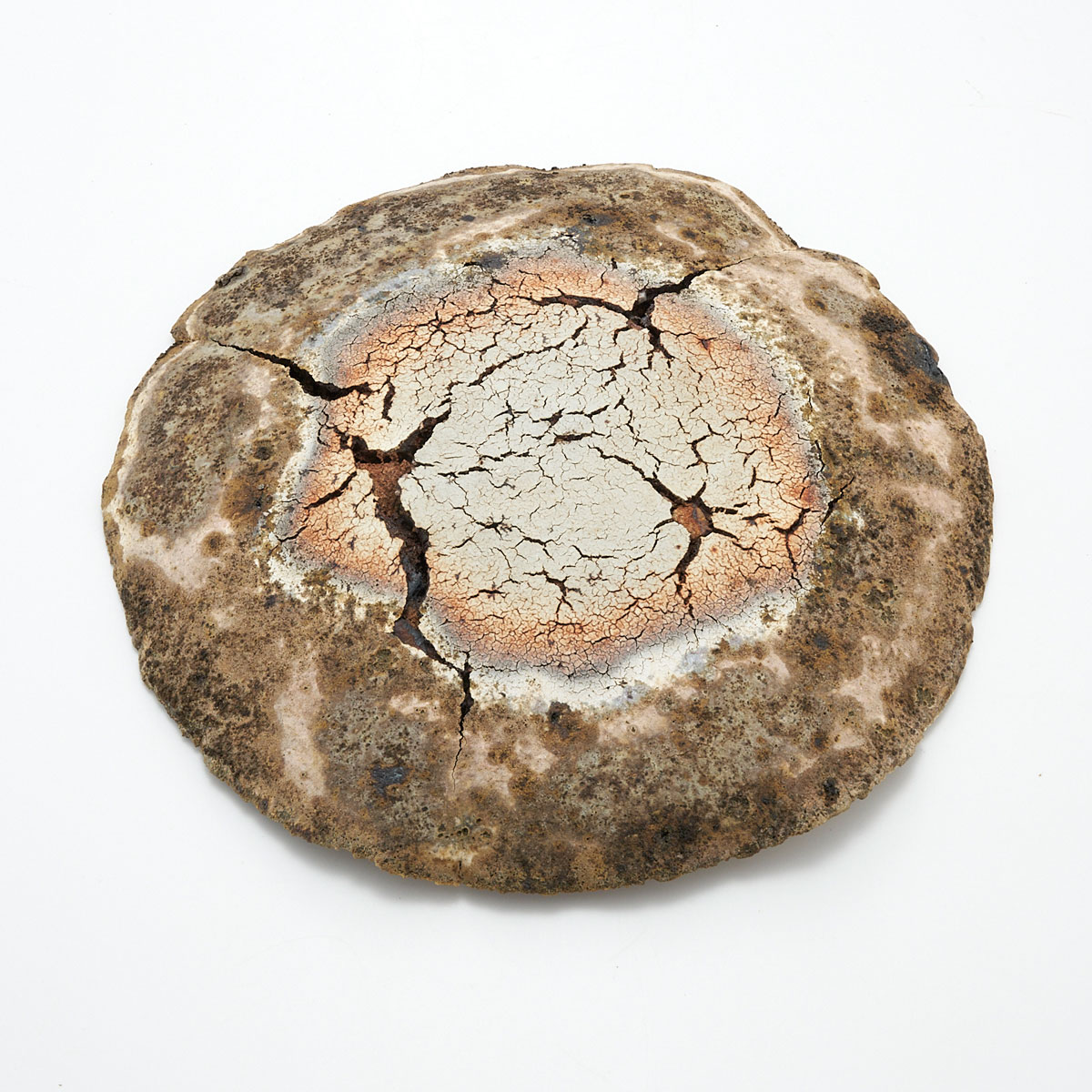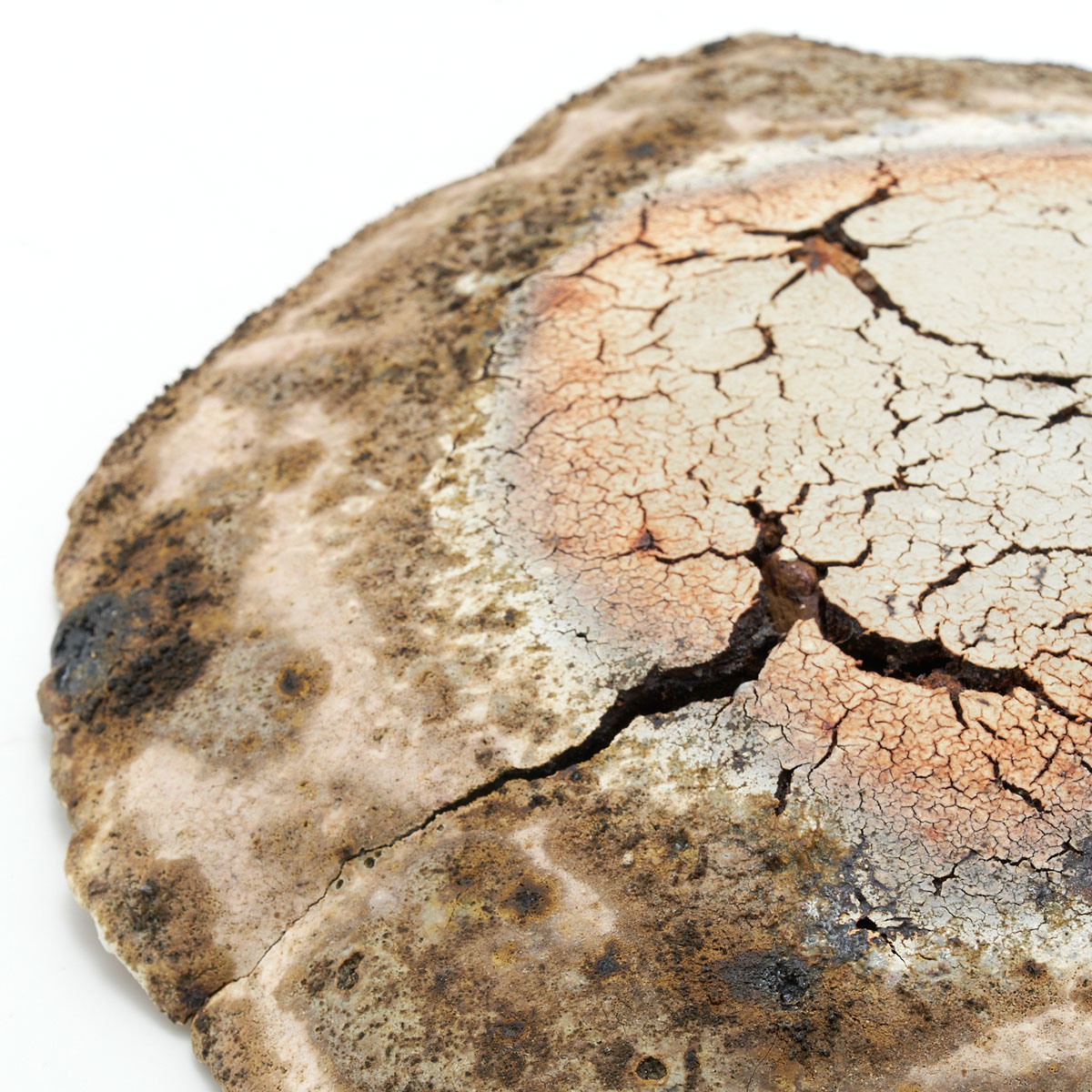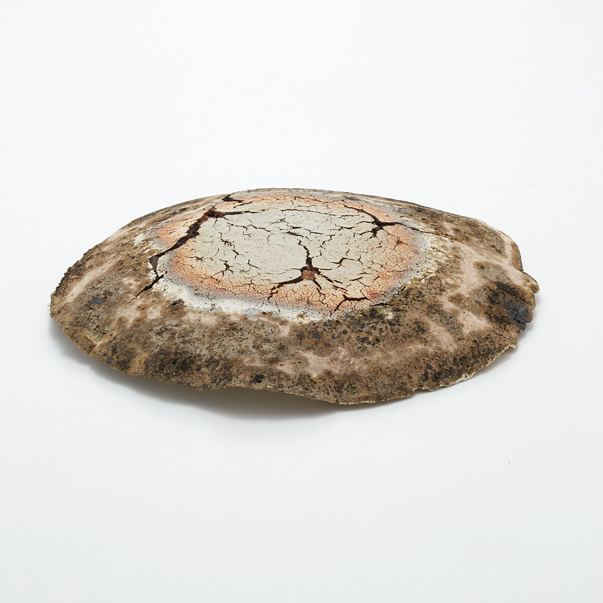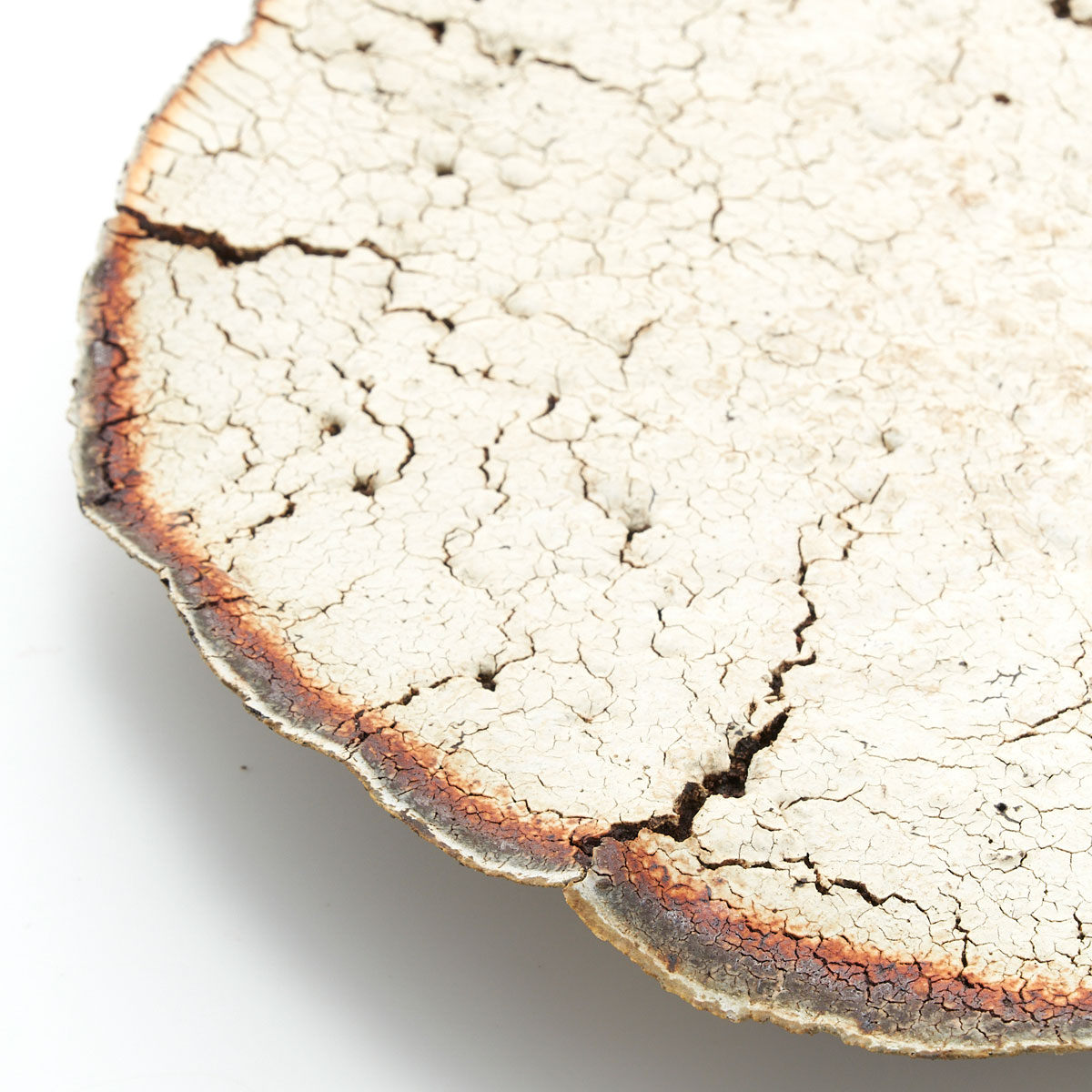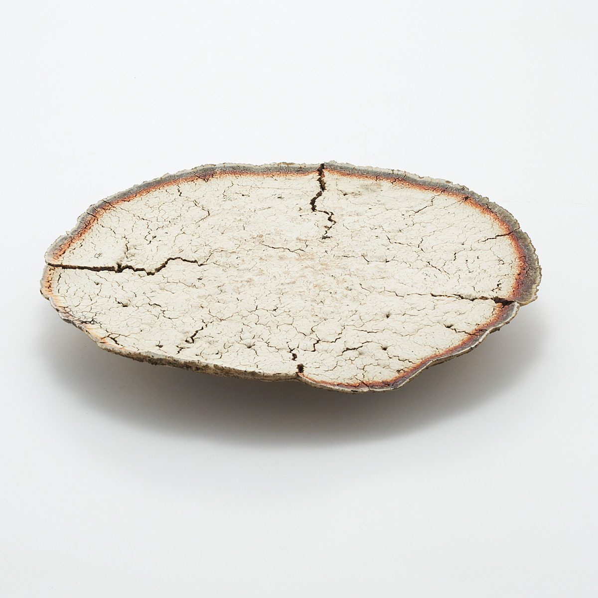白を基調としたドライな質感と荒々しいディテール、ゆらぎのある縁が魅力的。原土の魅力を引き出した作品です。飾り皿としてお楽しみください。裏面も面白い景色になっています。