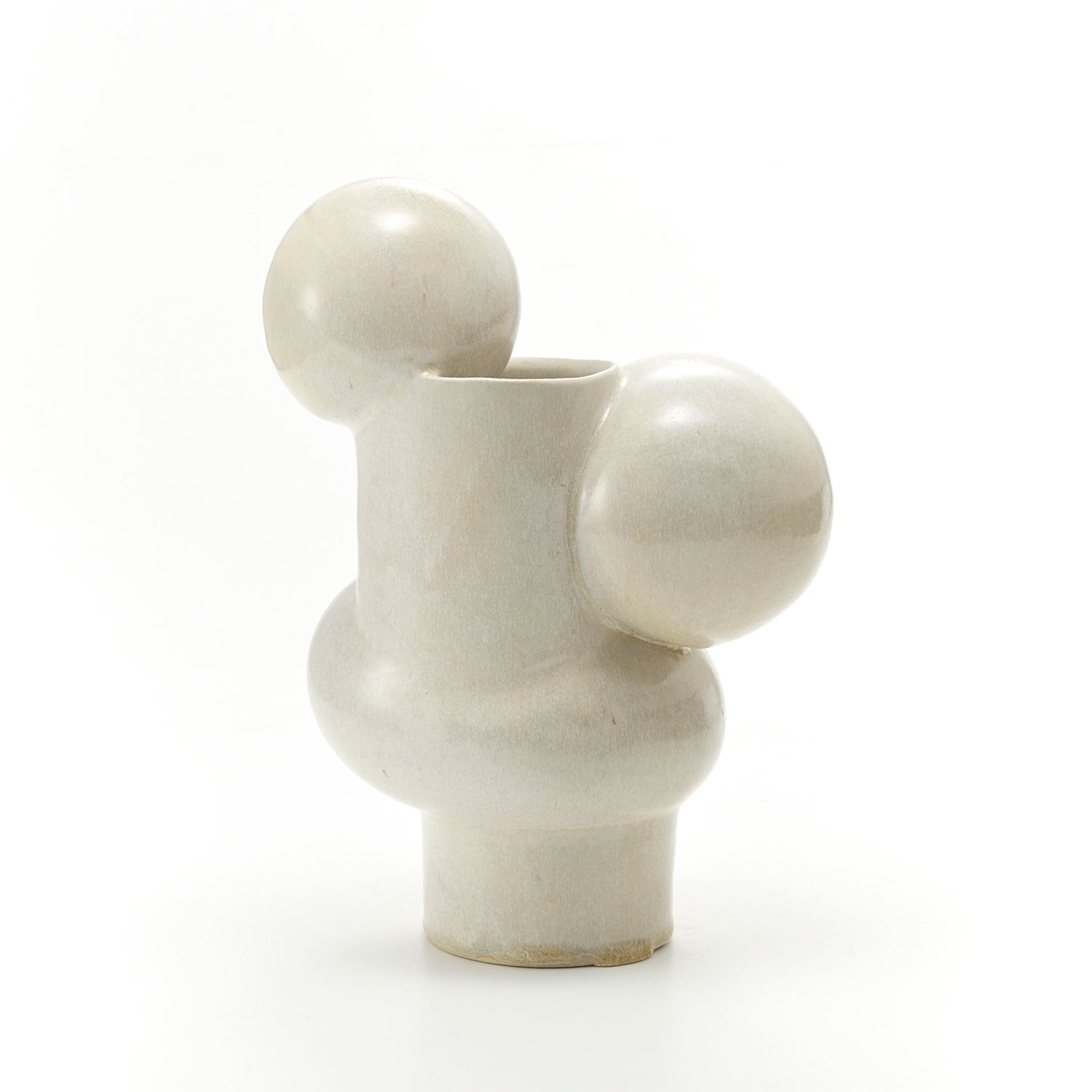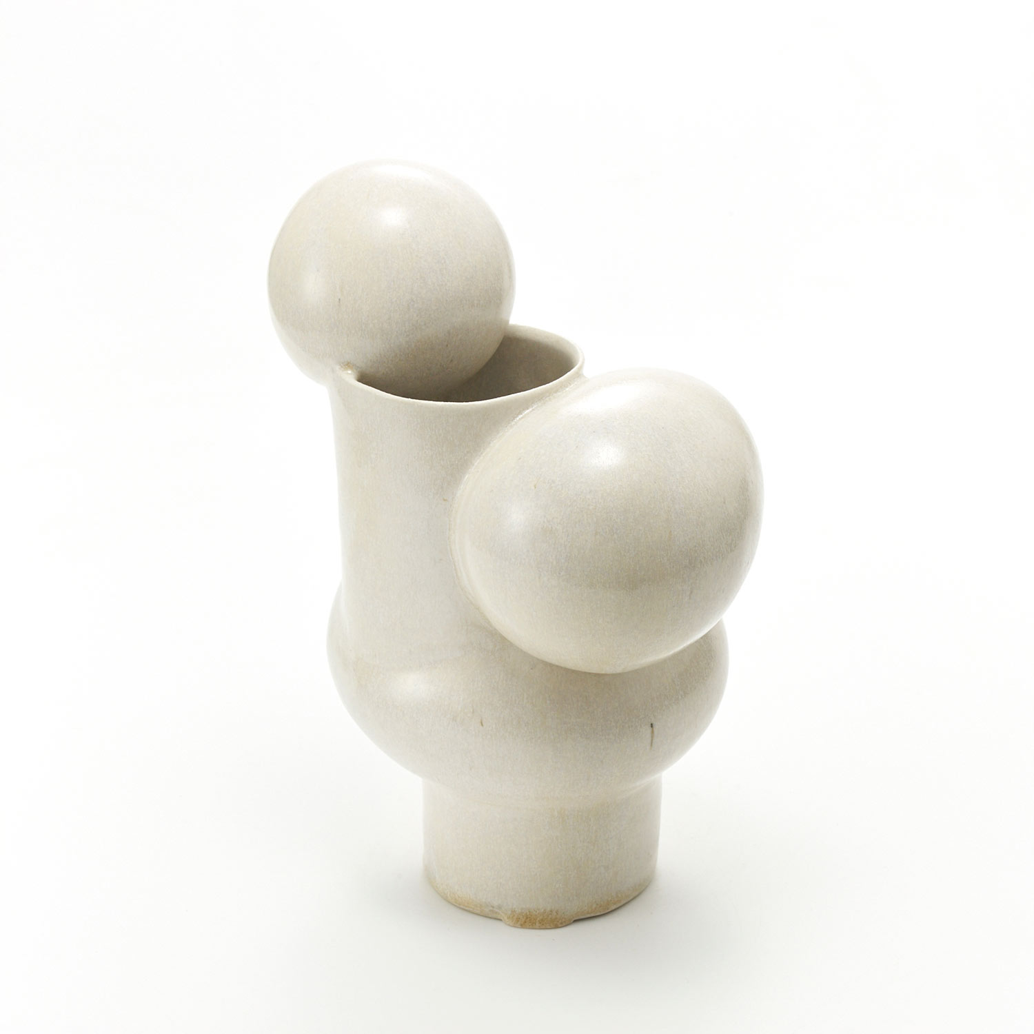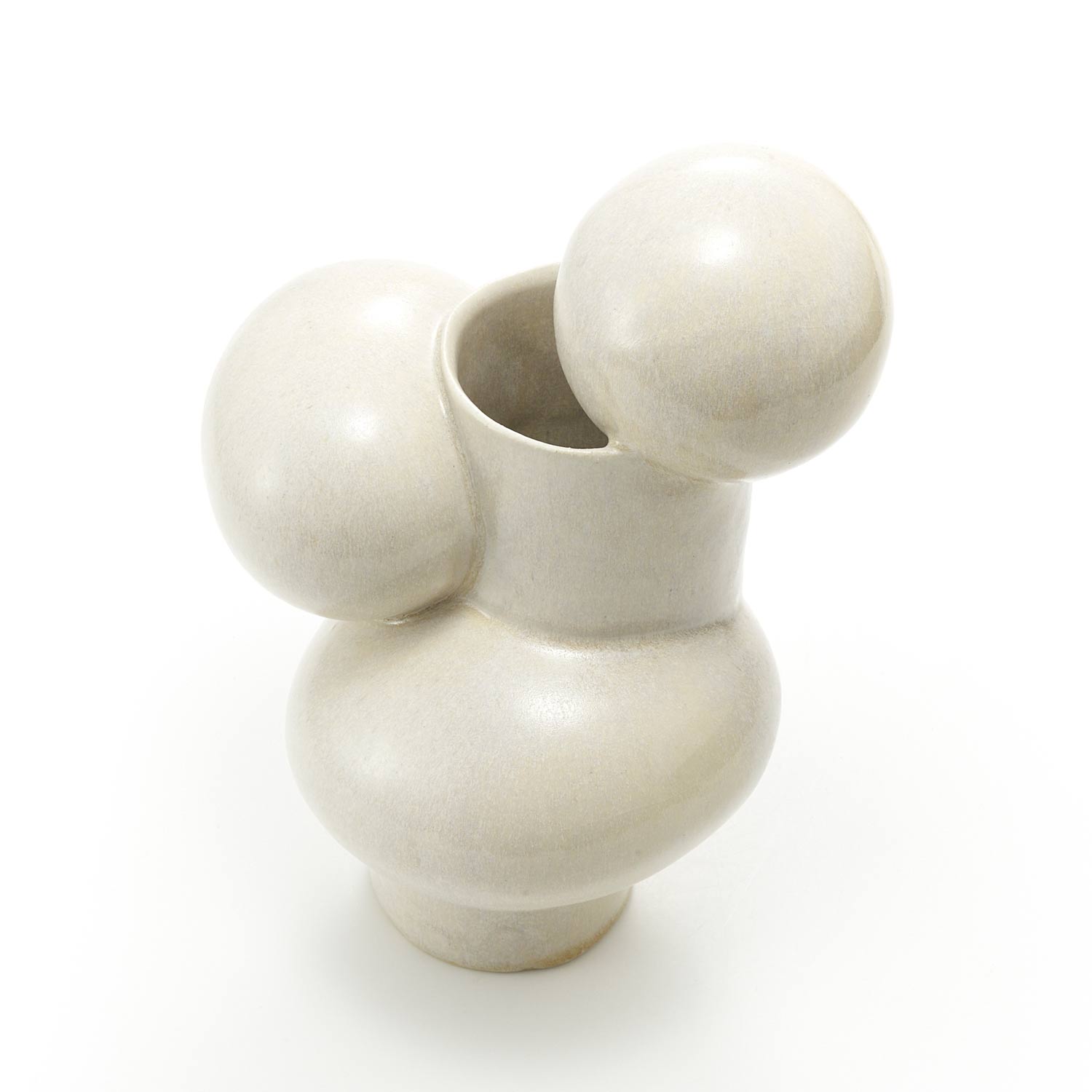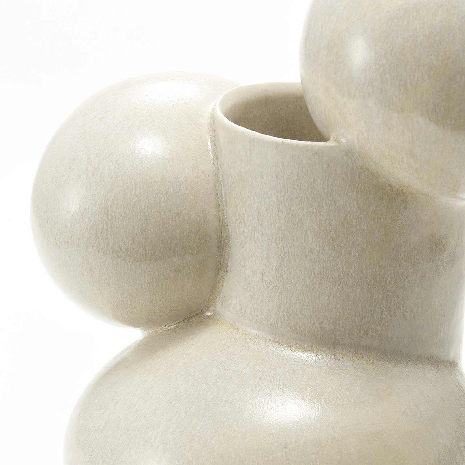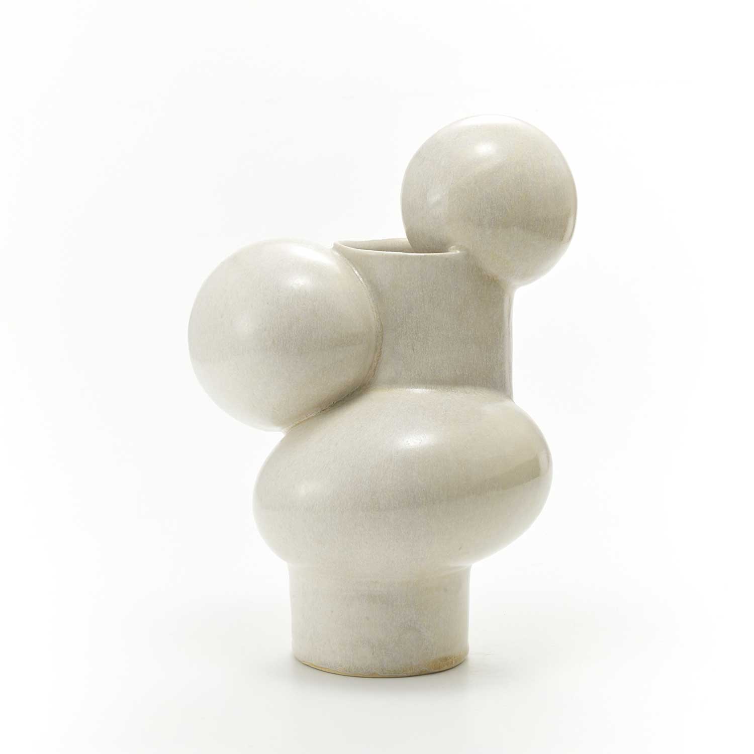 This uniquely shaped vase is a combination of a cylinder and a sphere. It has a pearl-like glaze, making it a beautiful and modern piece.