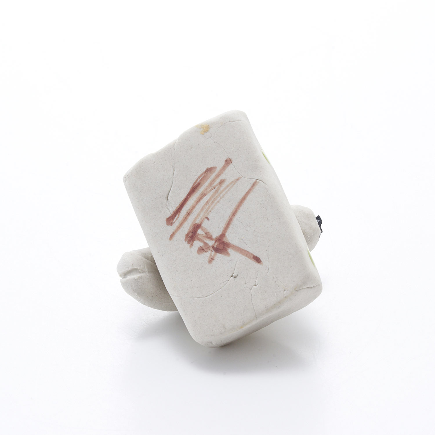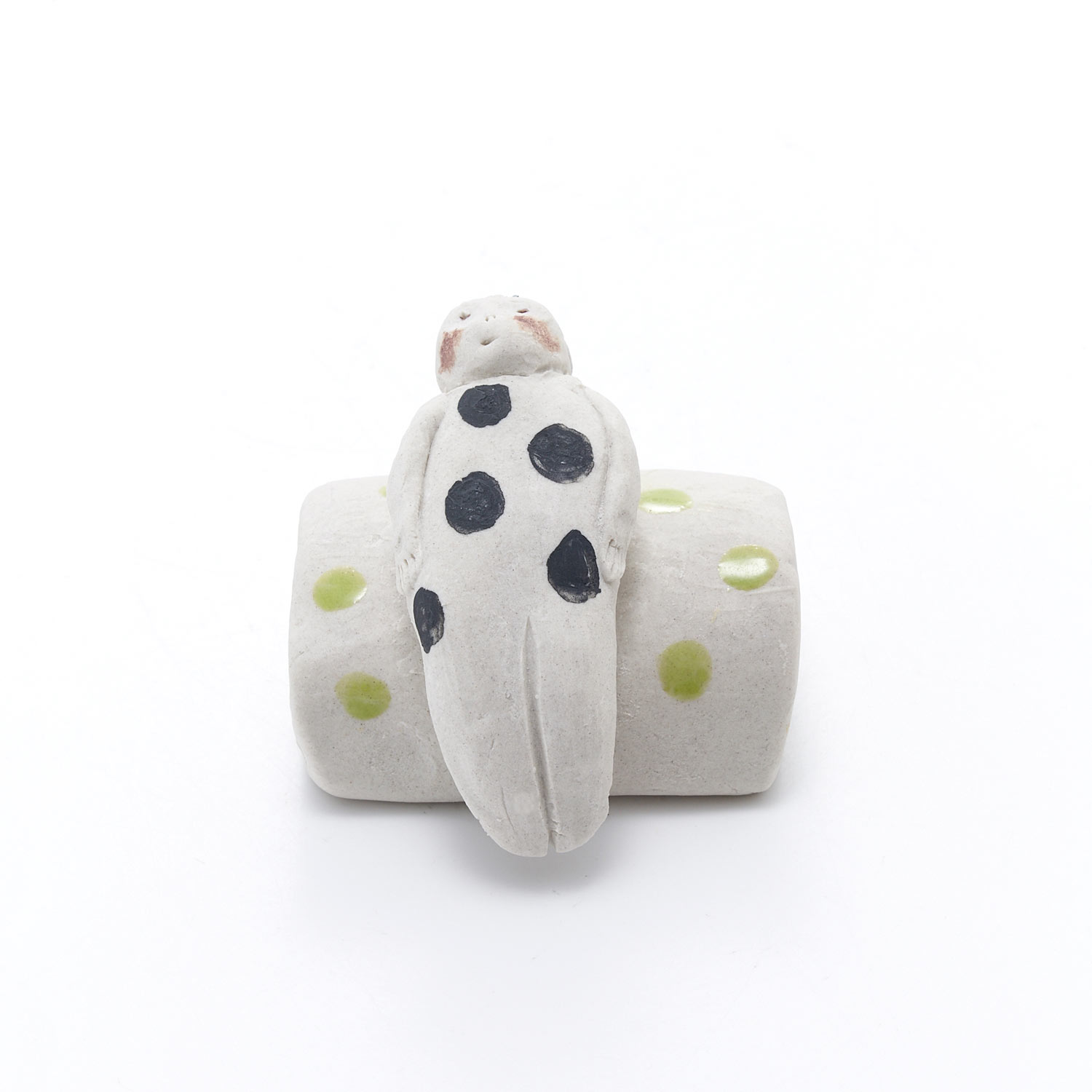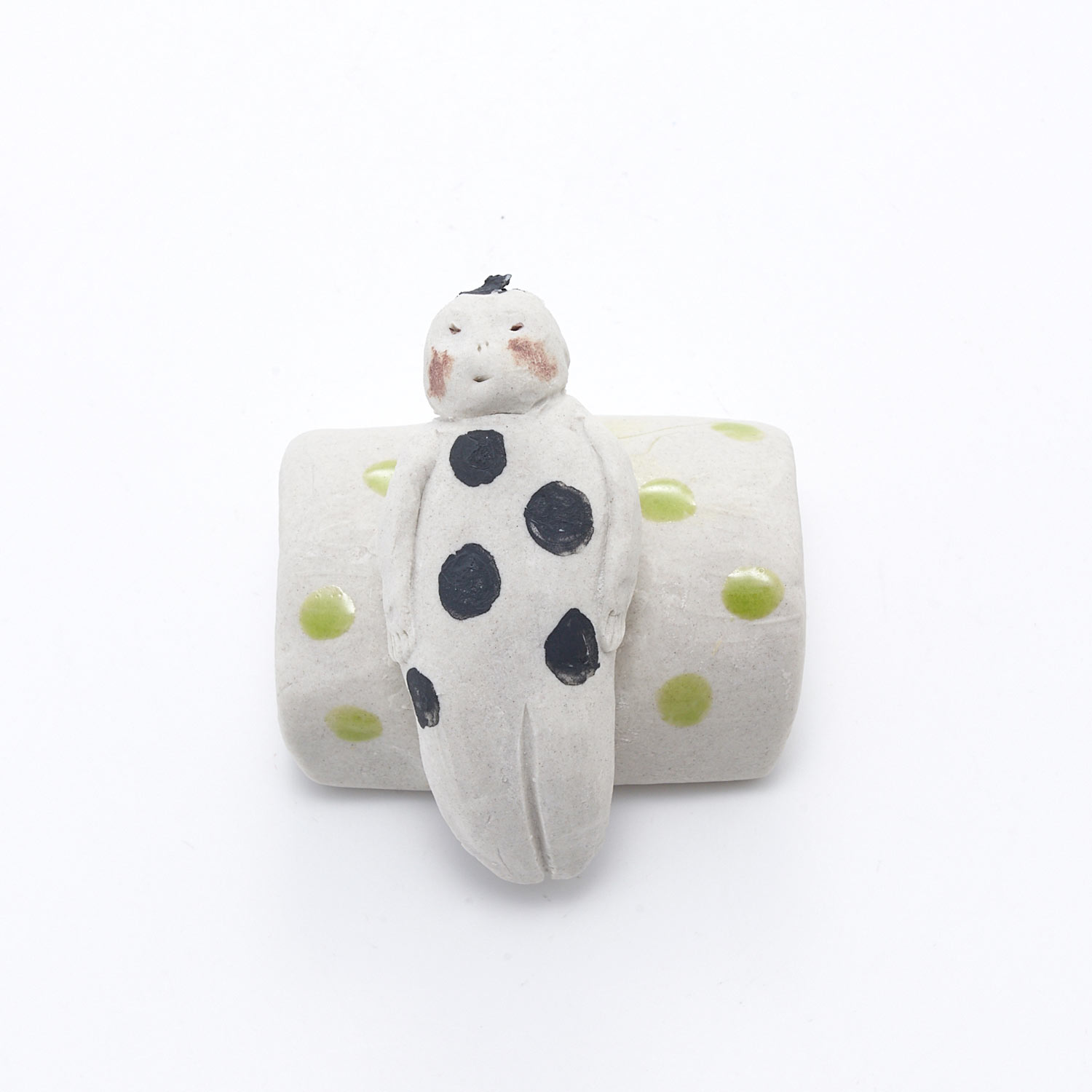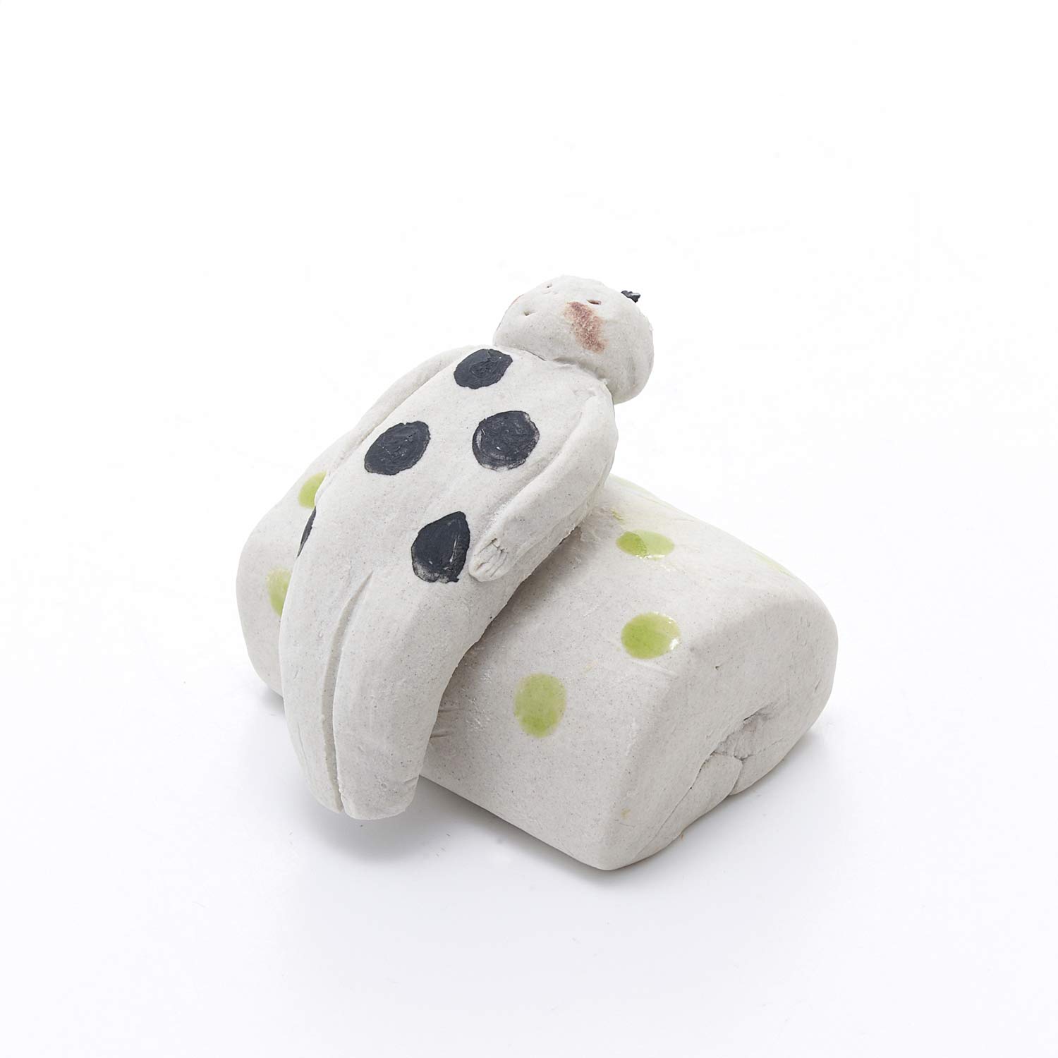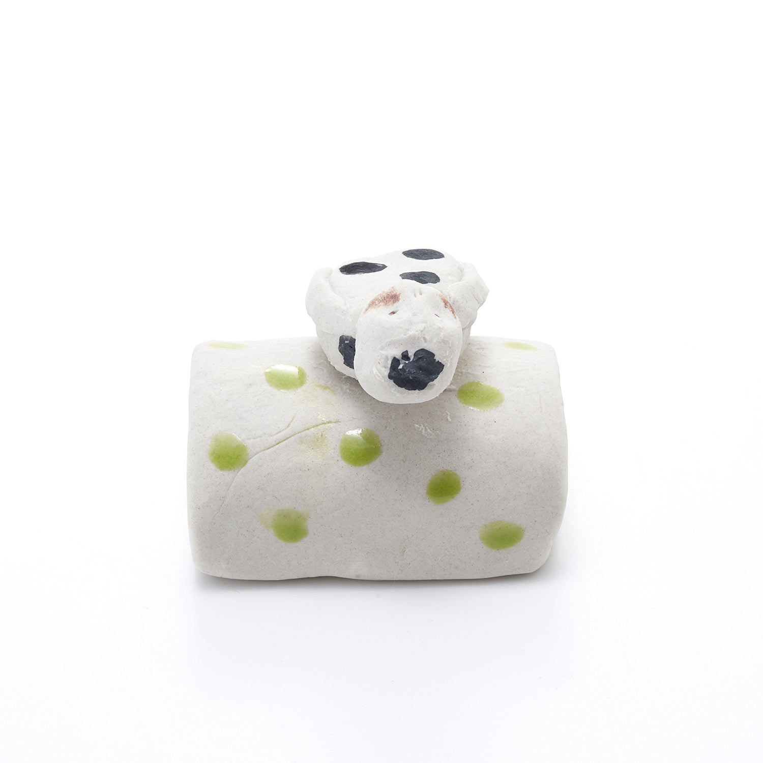 蒲鉾のような形にのけぞるように寝転んだ愛らしいペーパーウェイトです。グリーンと黒の水玉模様がかわいいです。