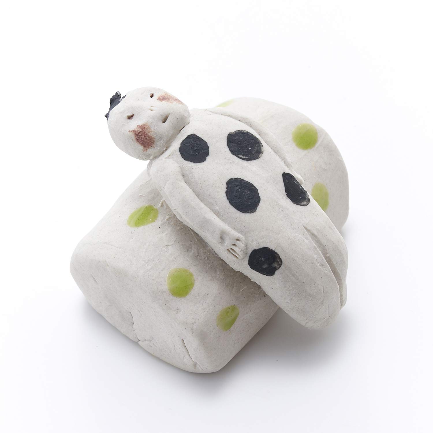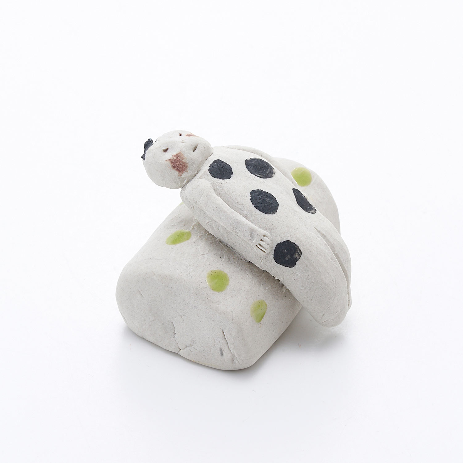 This adorable paperweight lies sprawled out in a kamaboko-like shape. The green and black polka dots also have a cute pattern.