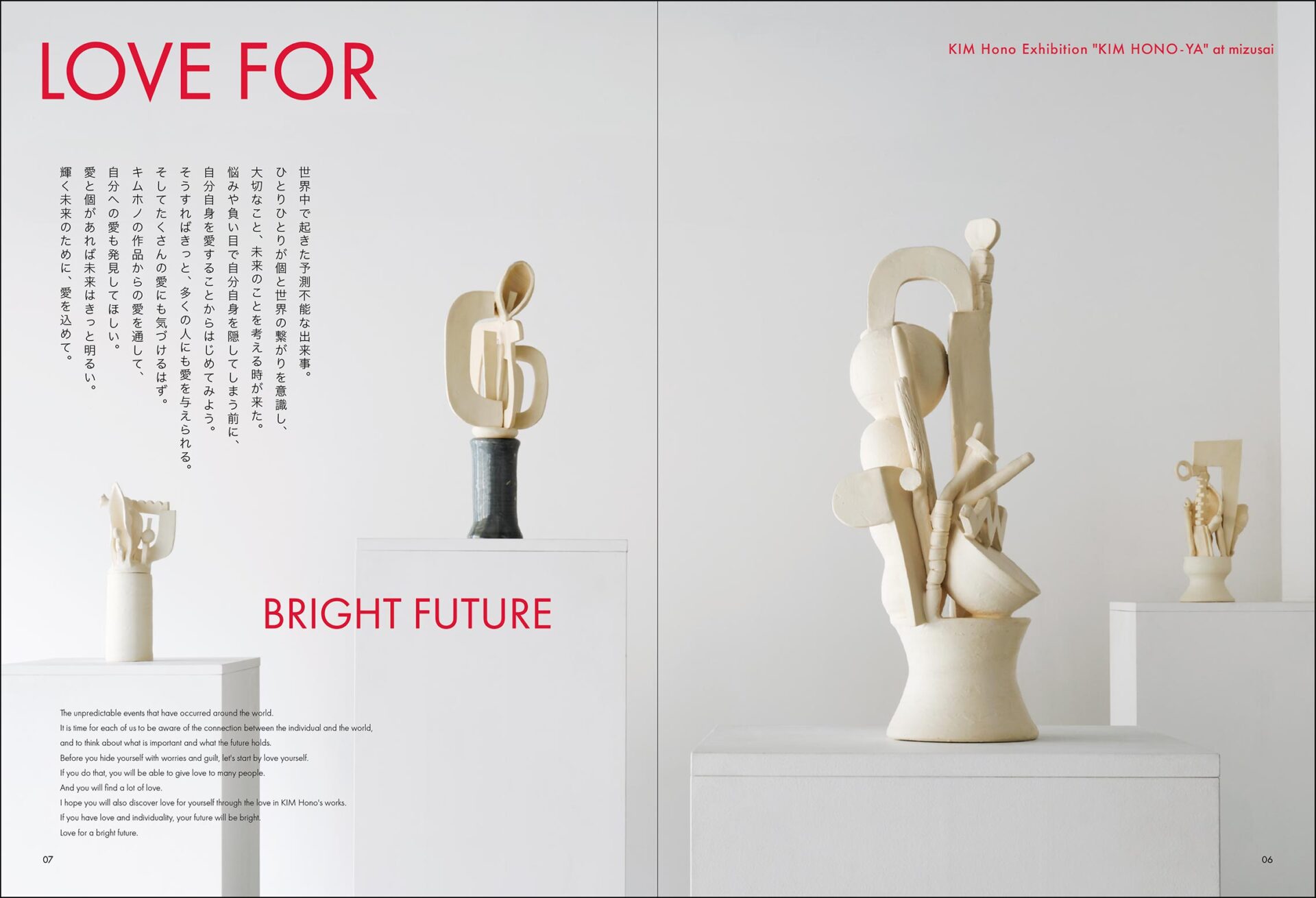 This is a book produced in conjunction with the solo exhibition of Hono Kim at Suisai. The theme of the exhibition was "LOVE FOR." The book introduces the new works in the form of love that Kim has created, as well as her daily life, production scenes, and a section featuring archived works photographed in Taito Ward, where Suisai is located. The book is thread-bound, so the pages open flat and are very easy to read. The book is bound in thread, so the pages are flat and easy to read.This is a book that I spent about two years researching and photographing.