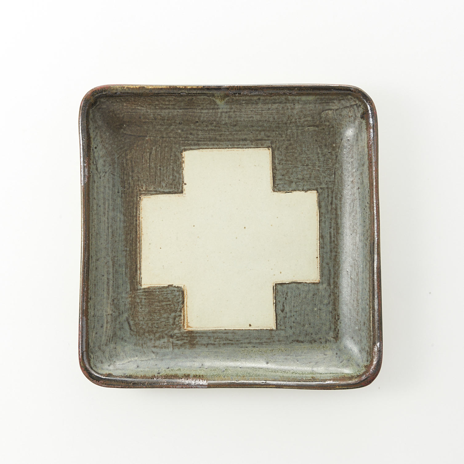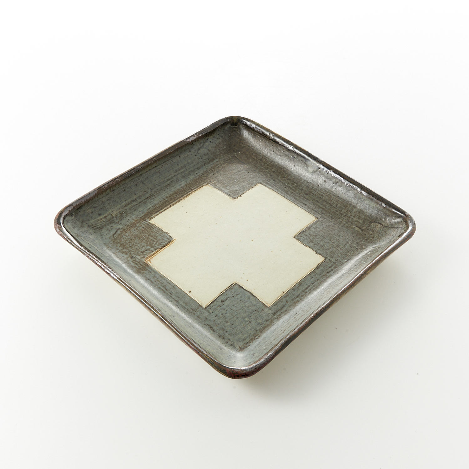 A work by Yoko Takeuchi. A square dish with a plump texture and an impressive cross in blue.