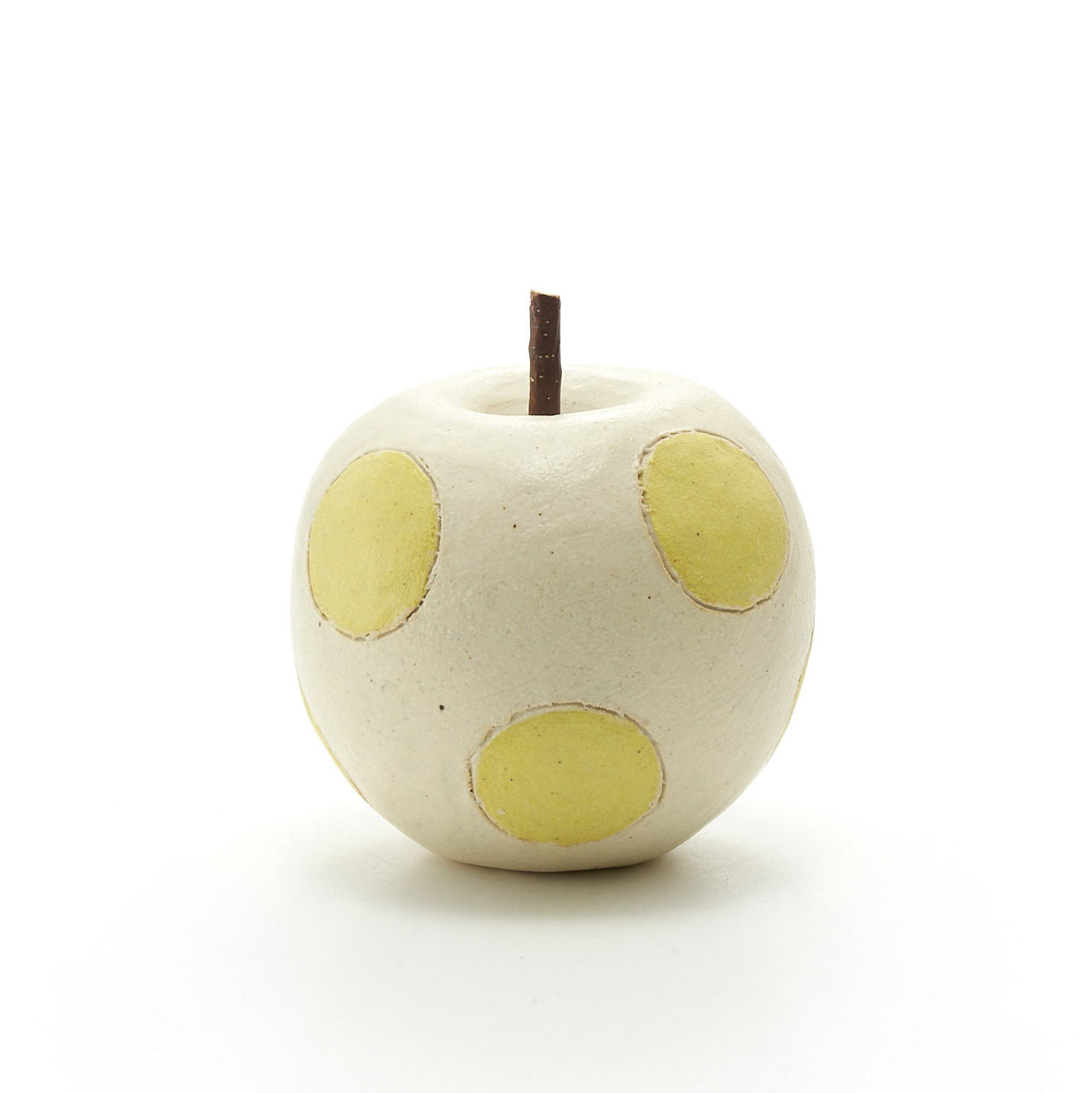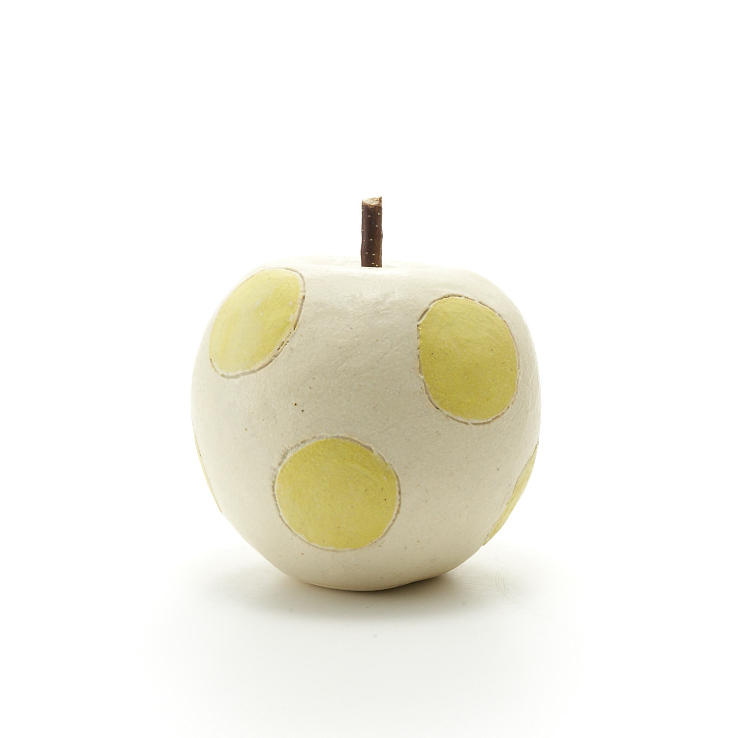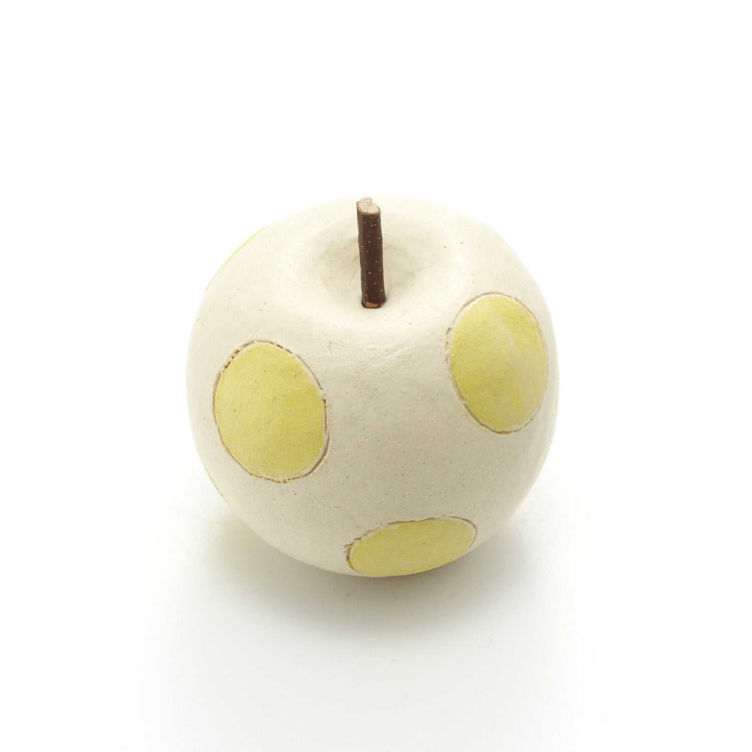 竹内陽子作品。イエローのドット柄が入ったリンゴのオブジェ。振ると可愛らしい音が鳴ります。