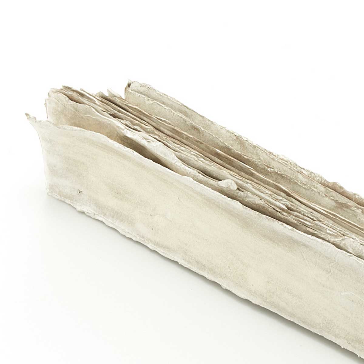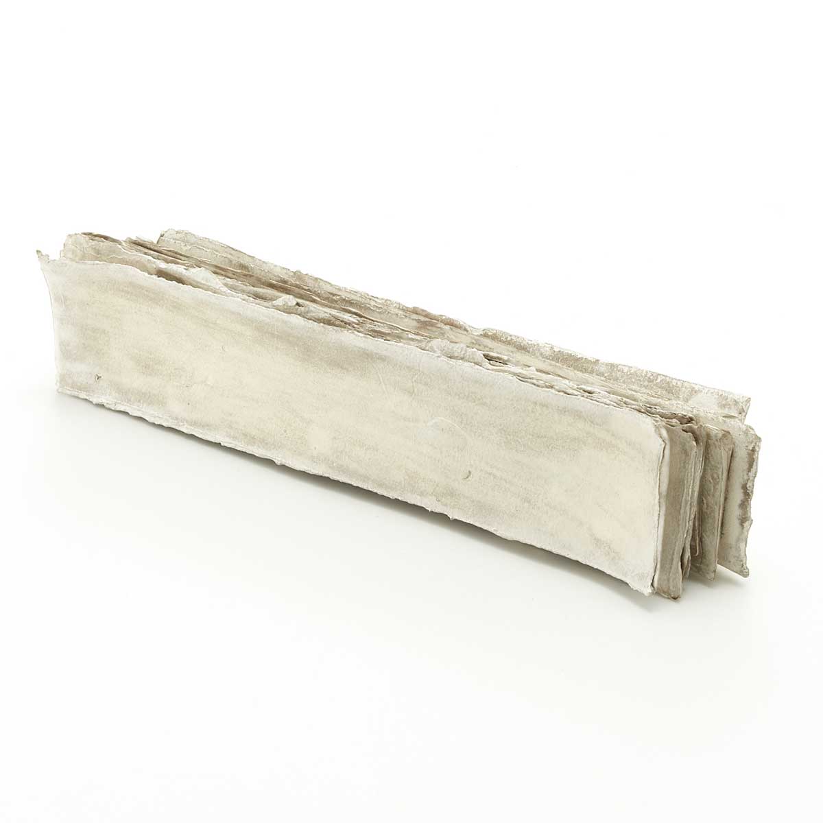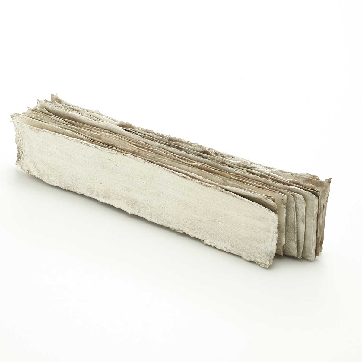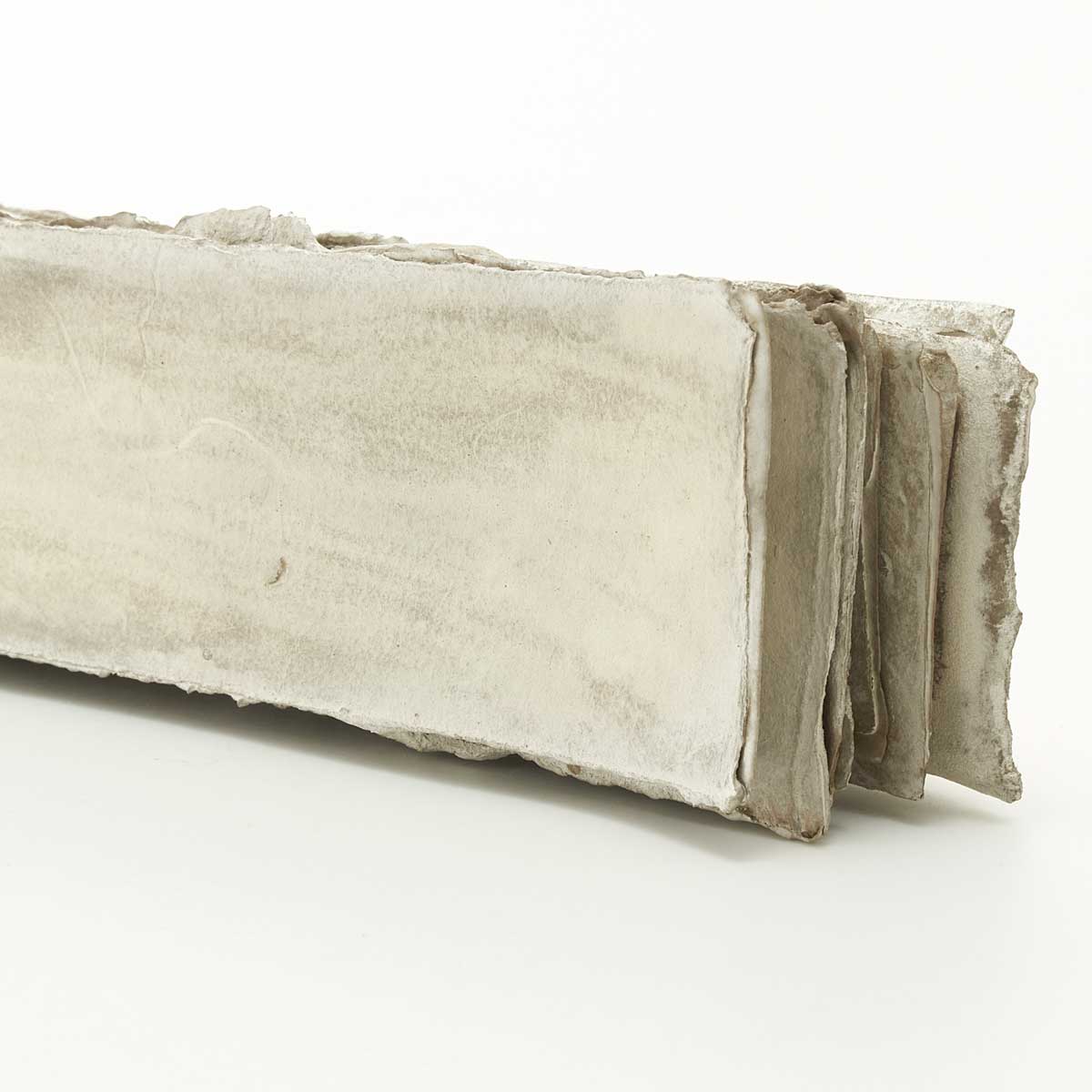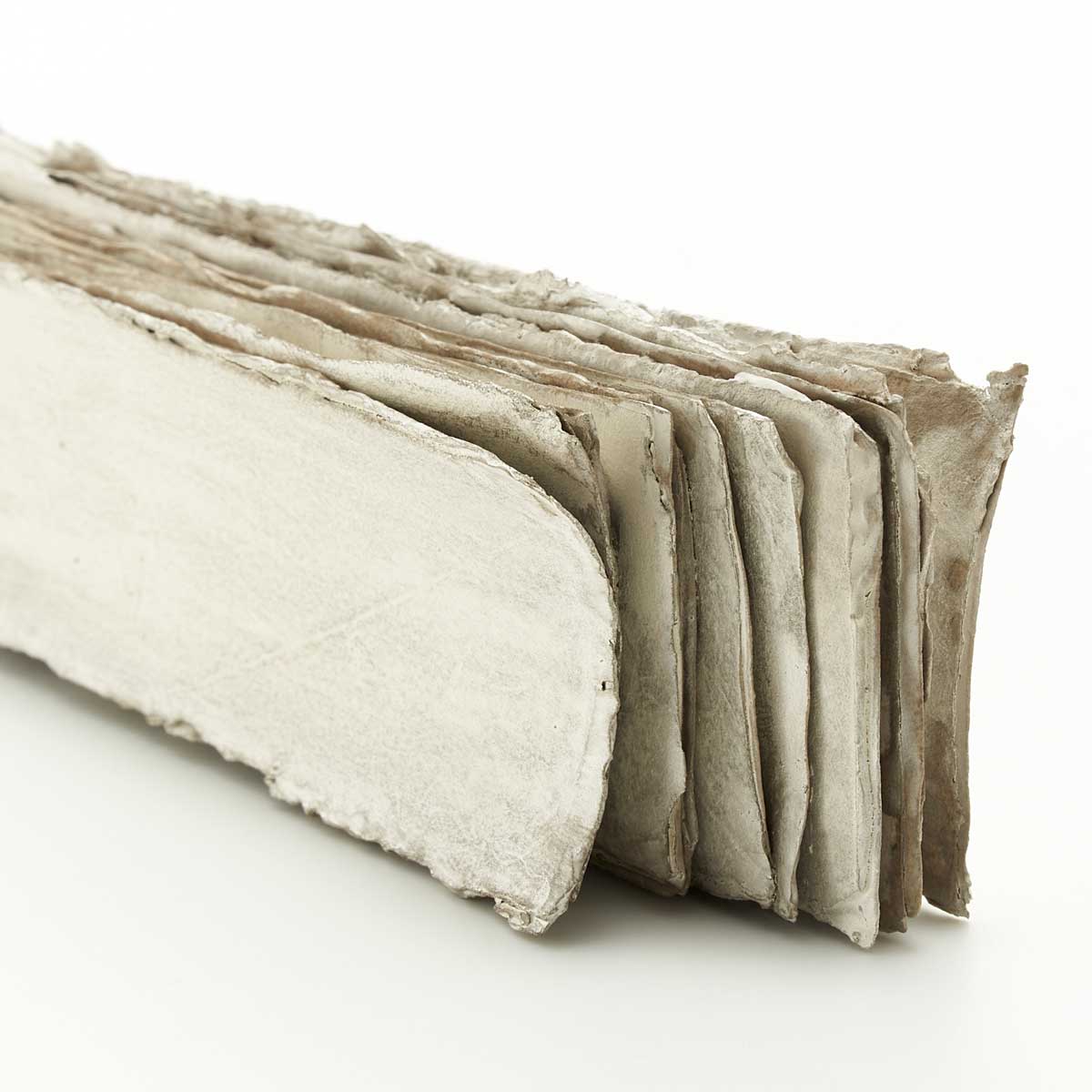 古紙を束ねたような美しい作品。こちらは短冊状の和紙に磁器の泥漿をしみ込ませ、層にして焼成し、銀彩を施した作品です。銀は酸化するため、時間とともに色が変化します。この変化をぜひお楽しみください。