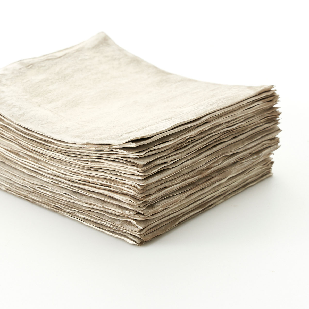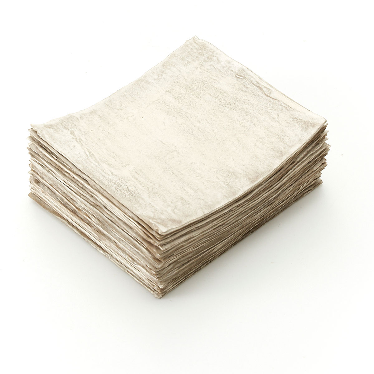 古紙を束ねたような美しい作品。和紙に磁器の泥漿をしみ込ませ、層にして焼成し、銀彩を施した作品です。