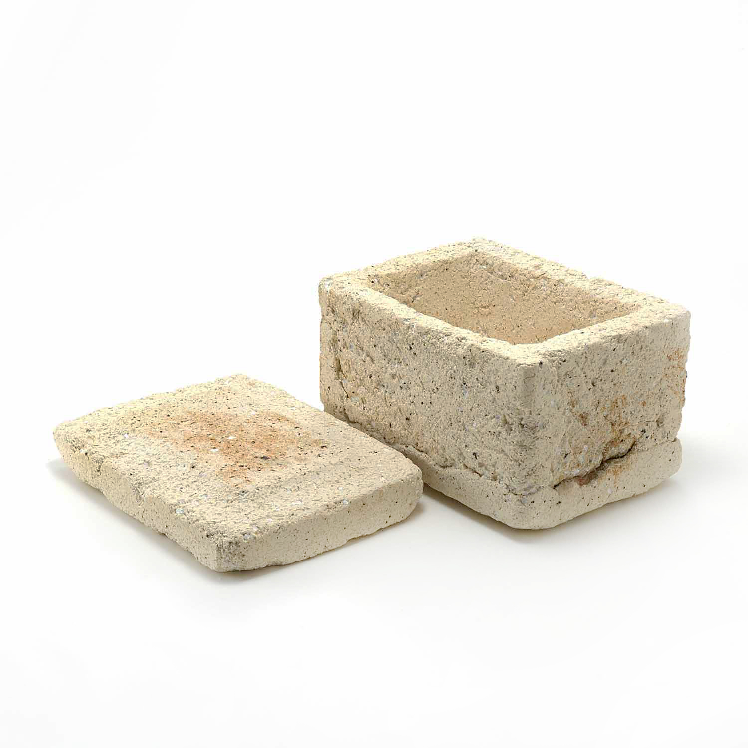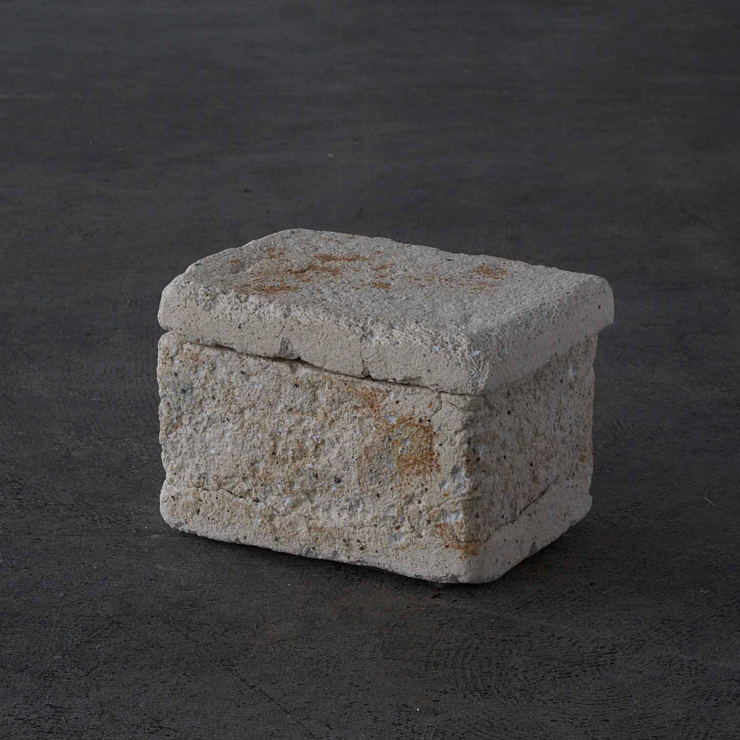 ローマ時代の漆喰の箱の写しから、この匣のシリーズの制作が始まりました。土やガラス質の素材、時には藁なども入れ毎回粘土を作ってから制作をしているため全く同じ質感の作品はありません。