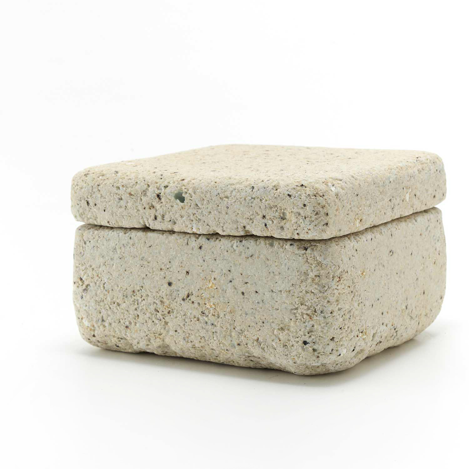 The production of this series of sacks began with a copy of a Roman plaster box. Since I make each piece from clay, glassy materials, and sometimes straw, no two pieces have exactly the same texture.