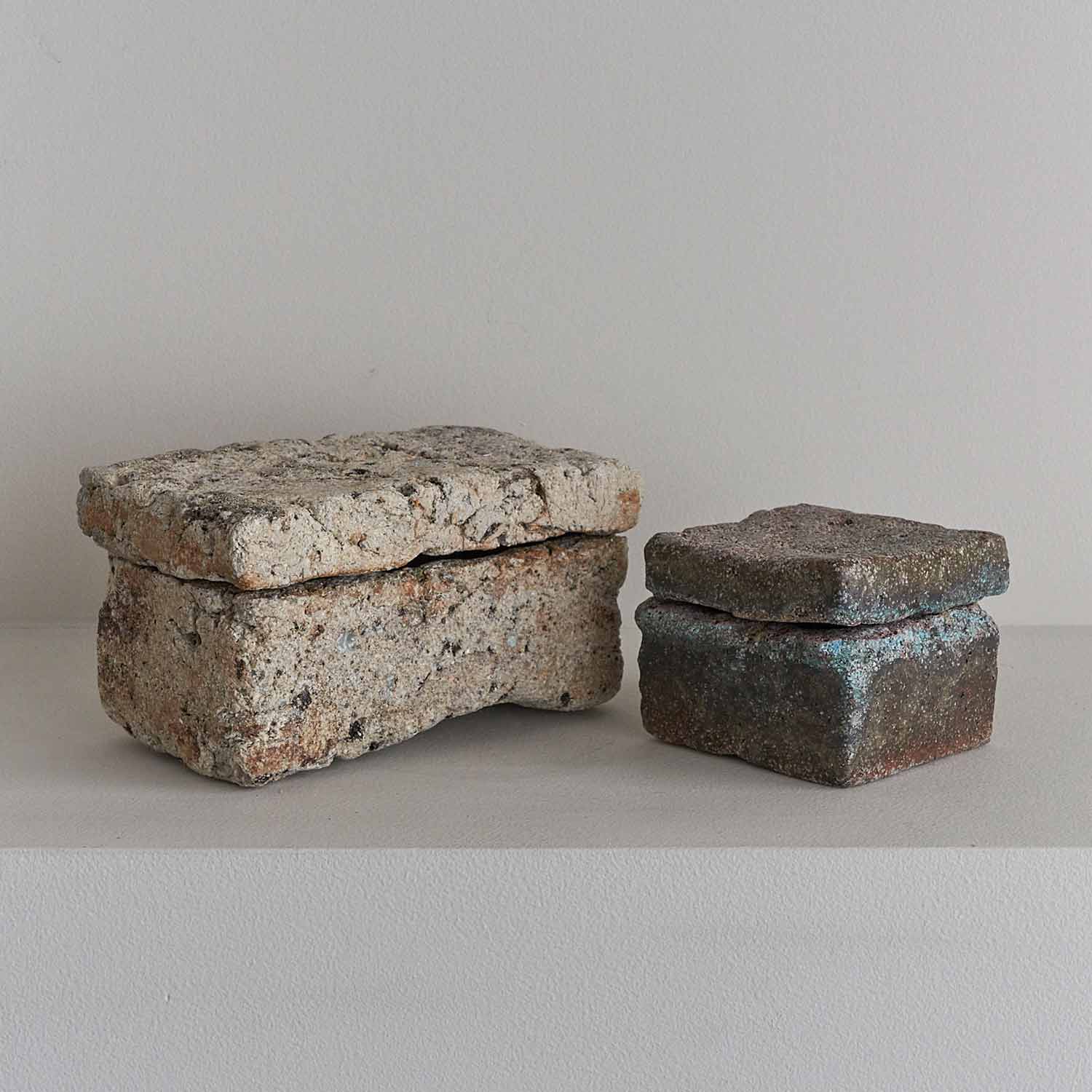 ローマ時代の漆喰の箱の写しから、この匣のシリーズの制作が始まりました。土やガラス質の素材、時には藁なども入れ毎回粘土を作ってから制作をしているため全く同じ質感の作品はありません。